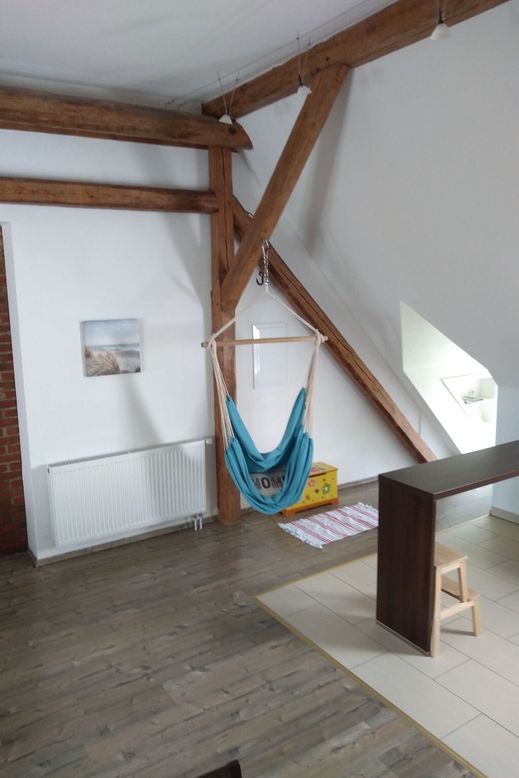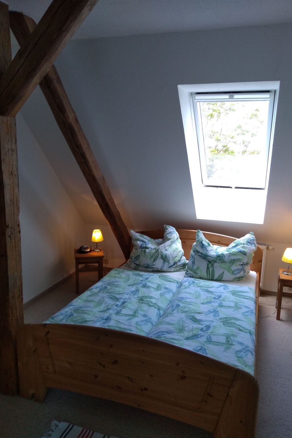 Where holidays bring joy and relaxation all year round!Top floor flat (93m²)The high-quality furnishings leave nothing to be desired:In 2009, we completely renovated our two holiday flats (object no. 434267 on the ground floor and object no. 438640 on the upper floor) on our remaining farm in an absolutely secluded location. Both flats have been awarded 4**** by the German Tourism Association. They offer enough space for up to 6 adults and 2 children each and can be rented together for holidays with friends or the whole family.The living room has two three-seater leather sofas, hi-fi system, satellite TV, DVD player and a large selection of games and books for all ages, one of the three bedrooms has a double bed (1.80m x 2m), the other two each have a bed (1.60x2m) wardrobes and clock radios. On request, we can provide up to two cots and high chairs free of charge. The bathroom has a large corner bathtub with a clear view of the starry sky, as well as a large shower, and garden furniture is available in sufficient numbers for both flats. We also offer a barbecue, sandpit, swing, slide, football goal and basketball hoop free of charge. In our play barn you will find a sandpit, table tennis table, table football, darts and lots of children's toys. Washing machine and tumble dryer can be used for a small fee.The eat-in kitchen is equipped with a dishwasher, fridge with freezer compartment, toaster, coffee machine, cooker with ceramic hob, convection oven and kettle and offers enough space to sit and chat.