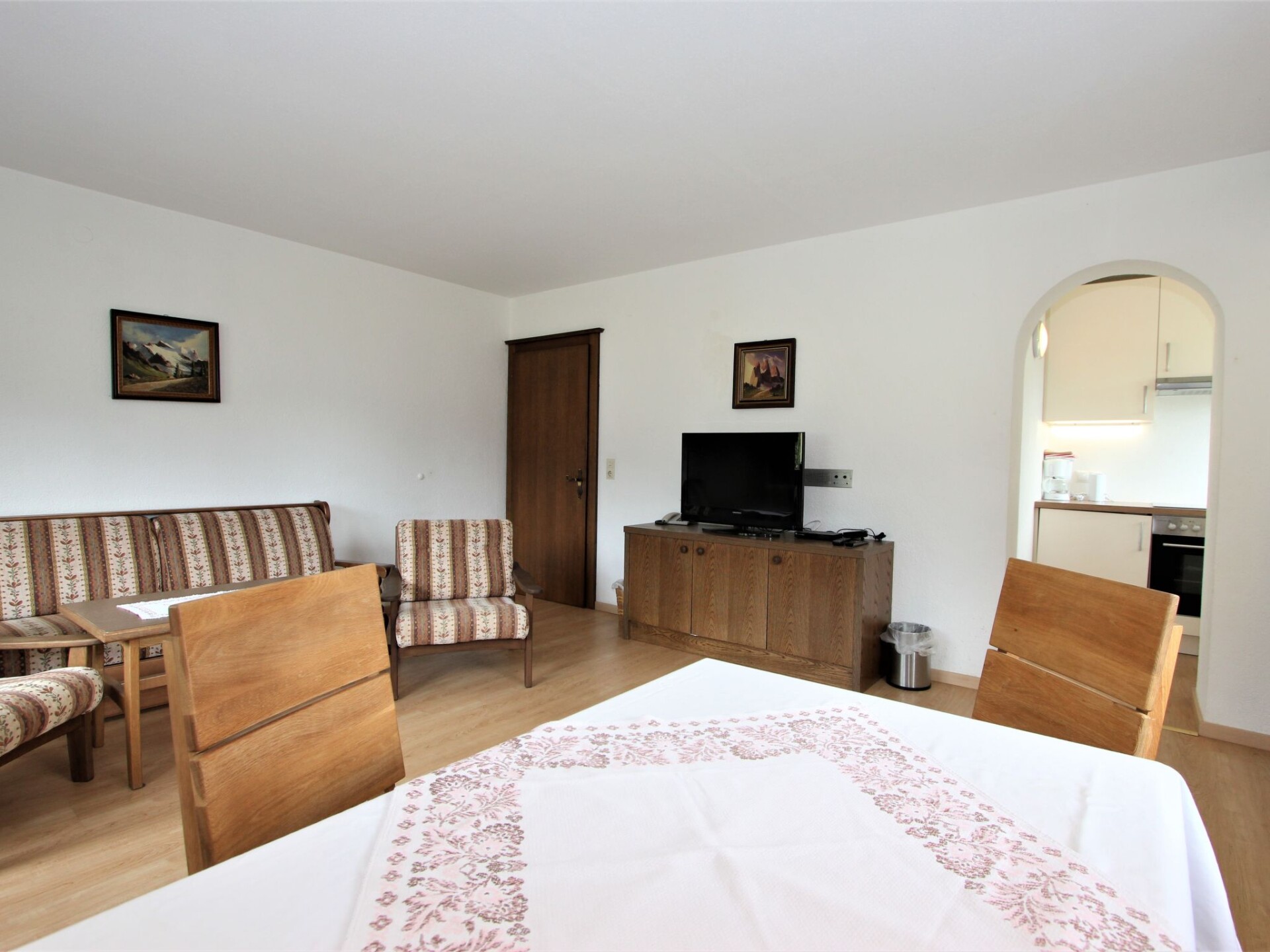 Appartement 2-kamers 65 m2 op de 1e verdieping. Ruim, rustiek en gezellig ingericht: groot hal. Groot woon-/slaapkamer met 1 uitschuifbaar bed (2 pers.), eethoek en Sat-TV (Flatscreen TV). Uitgang naar het balkon. 1 2-pers. kamer. Kookhoek (oven, 4 keramische glas kookplaten, elektrische koffiemachine). Badkamer, aparte WC. Groot balkon, op het westen gelegen en op het zuiden gelegen. Balkonmeubilair. Mooi uitzicht op de bergen en het landschap. Ter beschikking: Internet (WiFi). Niet rokers woning. Maximaal 1 huisdier/hond toegestaan.