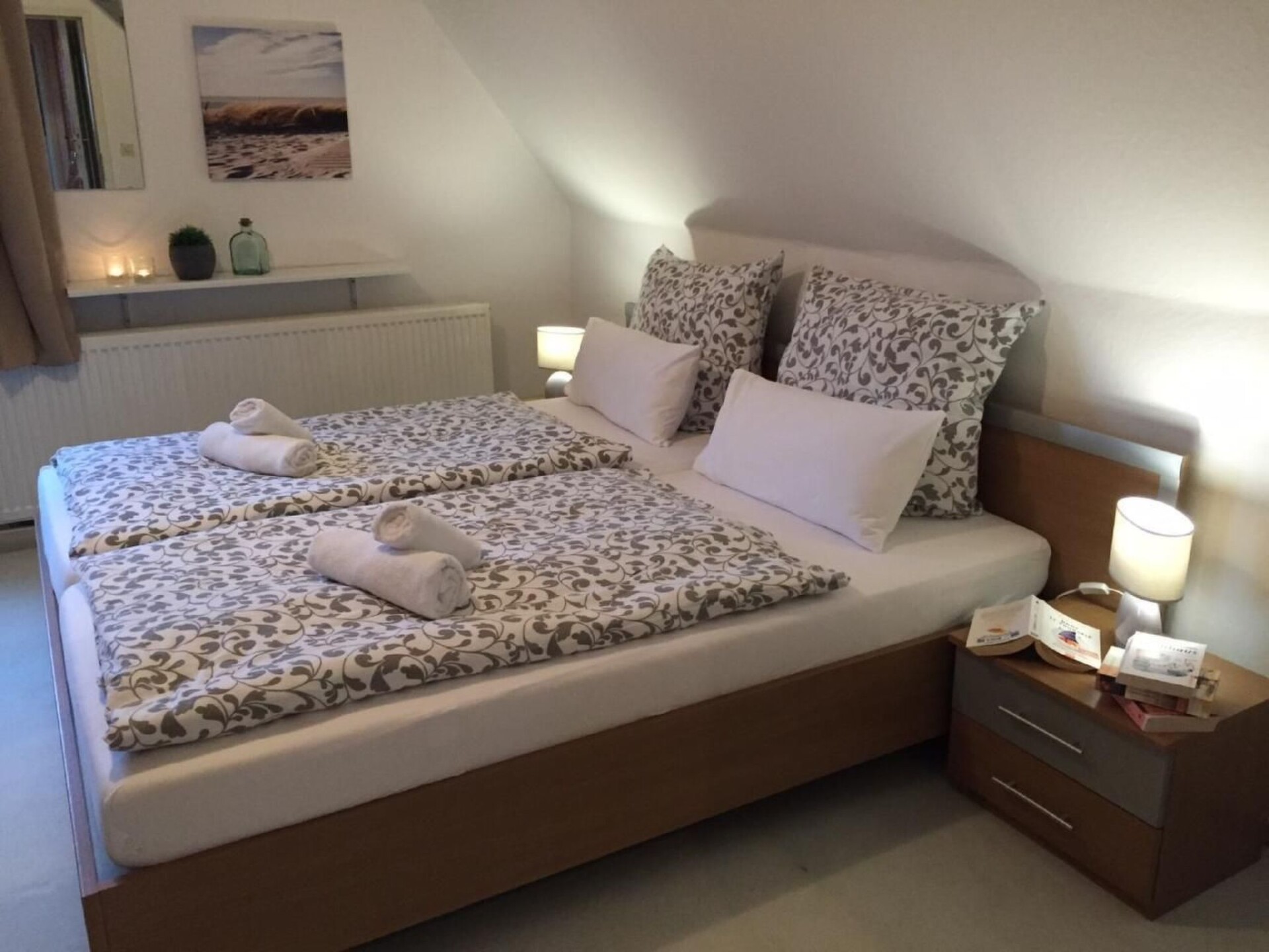 On a 2400 square metre plot, the holiday flat has 120 square metres. On the ground floor there is a fully equipped kitchen, a large living/dining room with a large flat screen TV and a bathroom with toilet and bath/shower. There are 4 bedrooms on the 1st floor. 2 bedrooms each have a large double bed. The other bedroom has two single beds - which could also be pushed together - and the fourth bedroom has 1 bunk bed. The 2nd bathroom with shower and WC is also on the 1st floor. The property offers plenty of space, so you will find both a sun terrace and a shady spot. The terrace is for your sole use, the garden is shared with the second (small) holiday flat, but there is plenty of space for everyone. You also have the option of using a covered terrace. If you leave the property through the back garden, you are directly on the South Sea - the main tourist centre of Otterndorf.Brief descriptionOther : Non-smoking houseShort description 1Number of kitchens : 1Living room 1Other living room equipment : There is a large flat screen availableBedroom 1Other bedroom equipment : Large double bed 2 m wide. Bedroom 2Other bedroom furnishings : Double bed 1.80 m wide, wardrobe, bedside tablesBedroom 3Other bedroom furnishings : 1 bunk bed 1.40 m wide at the bottom, 90 cm wide at the top.Bedroom 4Other bedroom furnishings : Bunk bed 1 m wide at the top and bottom, wardrobe. SurroundingsLeisure facilities : boat hire, bicycle hireSports facilities in the area : fishing, football pitch, golf course, canoeing, cycling, rowing, surfing, tennis, water skiingSurroundings 1Excursions : beach, bathing lakes right on the doorstep.historic old town of Otterndorf, 1.5 km.North Sea resort of Cuxhaven 15 km. Helgoland cruise from CuxhavenShip trips to the seal banks also from Cuxhaven.Medemschifffahrt from Otterndorf.Ortsbeschreibung : The holiday flat is located directly on the main tourist area of the North Sea resort of Otterndorf. Everything is within walking distance.other sports and leisure facilities : Nearby is a mini golf course, a football golf course, and an indoor play barn.garden and outdoor facilitiesGarden equipment : Garden furniture available, barbecueServices 1Other : On request breakfast service in the guest house zur Linde for a fee 1.5 km from the property.