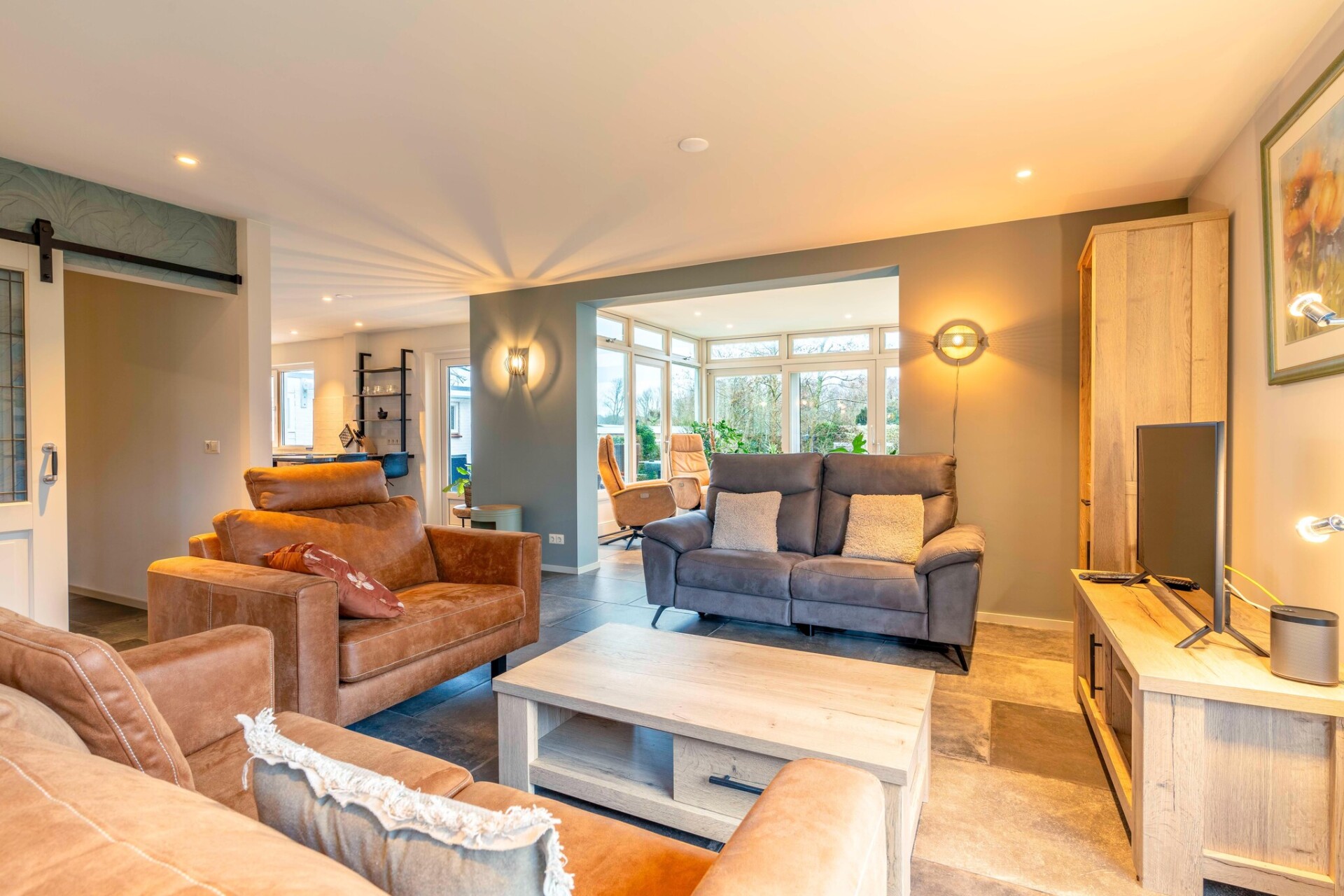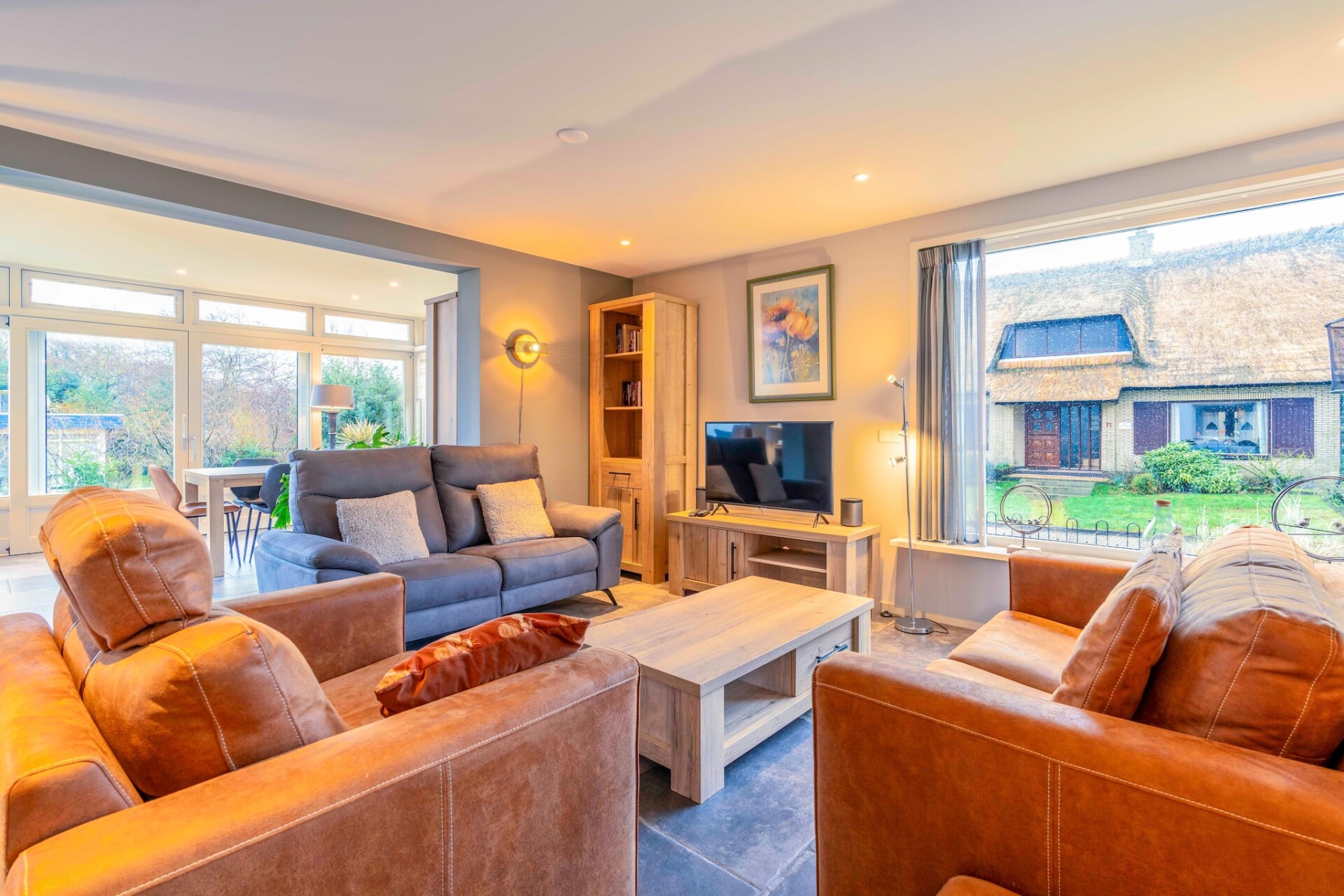 Via de entree kom je in de woonkamer met een heerlijke zithoek met smart TV. In de serre is een eethoek met een eettafel voor 6-personen, door de vele raampartijen is het een heerlijke lichte ruimte en heb je uitzicht over de tuin en het terras. De open keuken is compleet ingericht met diverse inbouwapparatuur, zoals combioven, vaatwasser en diverse koffiemachines.