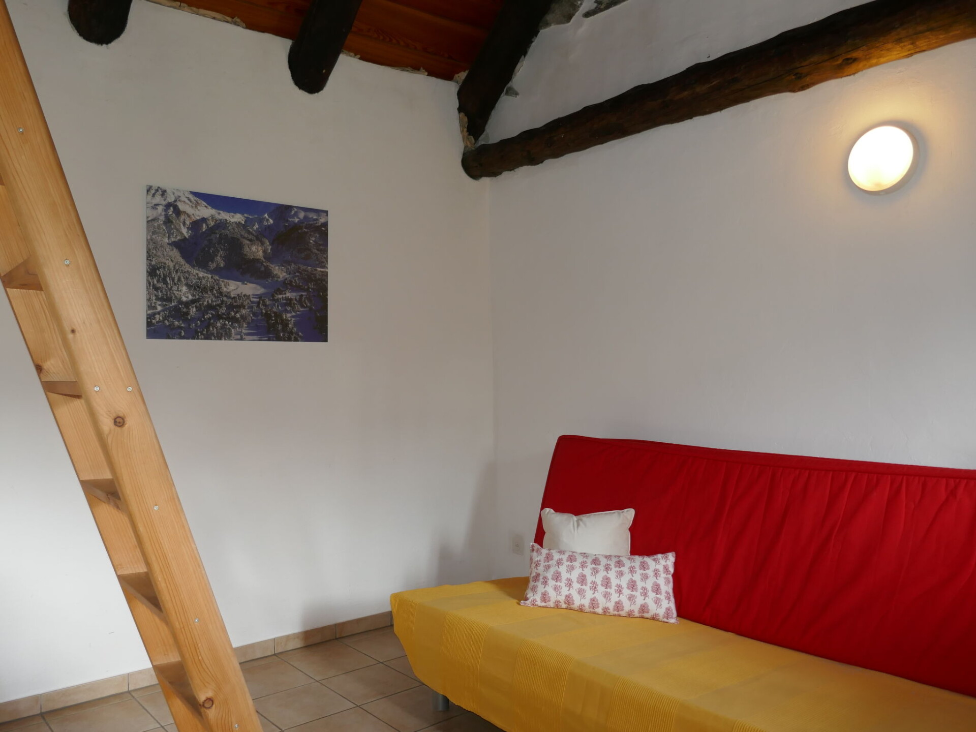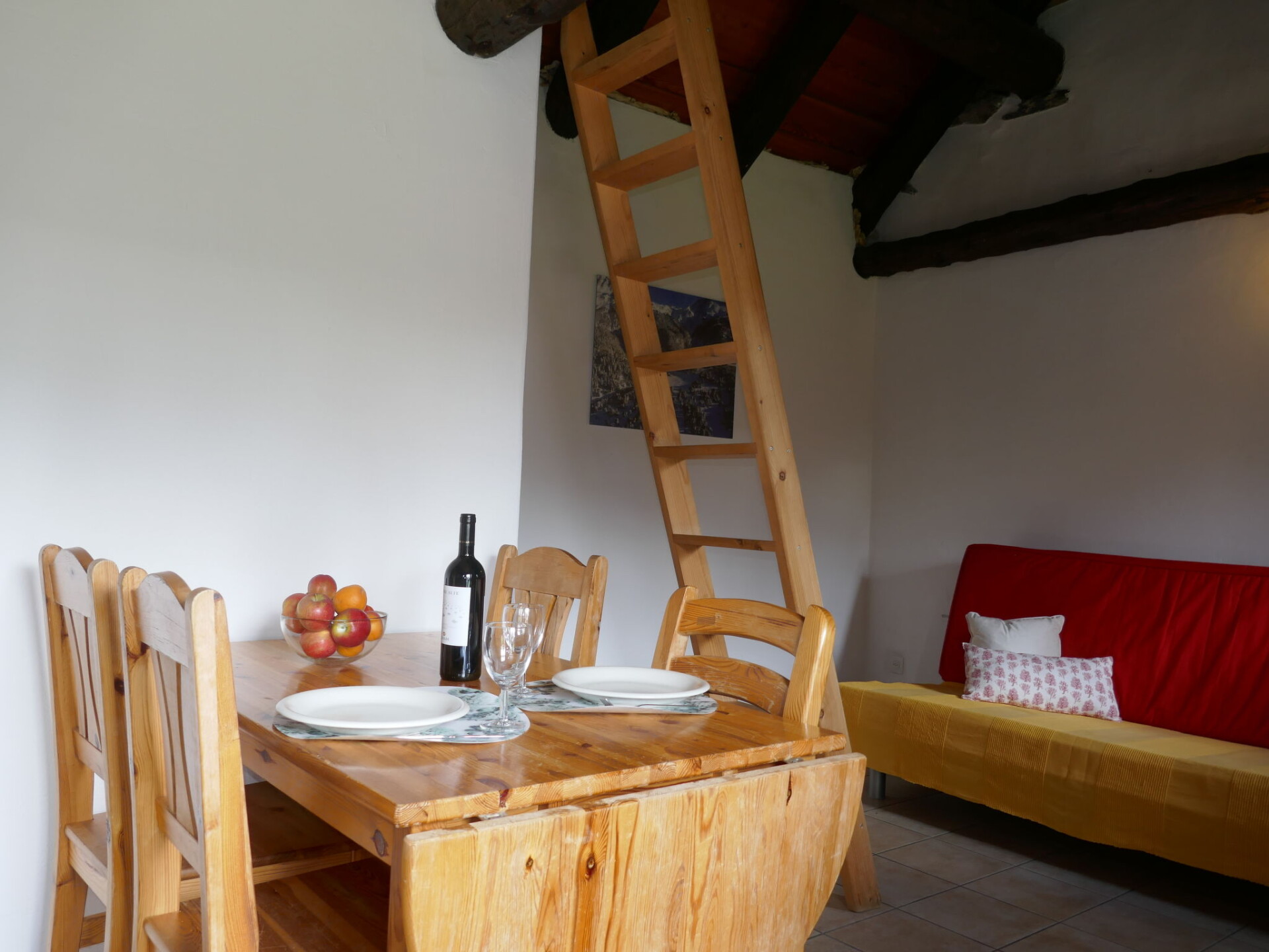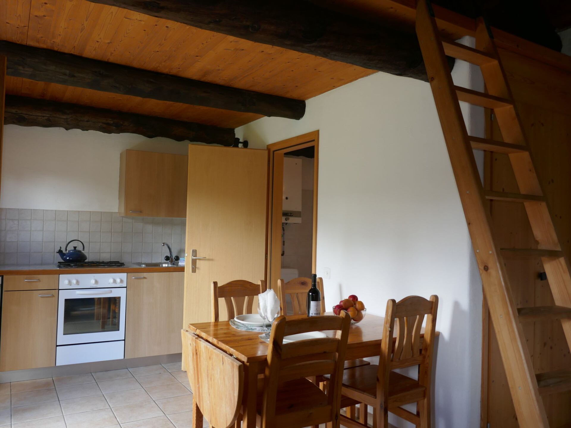 "Rustico Edel", 1-kamer cottage. Afgeschuinde daken, eenvoudig en doelmatig ingericht: open woon-/slaapkamer met 1 divanbed (160 cm, lengte 200 cm), eettafel, radio en houtkachel. Open keuken (oven, Gasfornuis, 4 kookpitten (vlammen)). Douche/WC. Houtverwarming. Solarstroom. Bovenverdieping: (ladder) open vide met 2 bedden (80 cm, lengte 200 cm). Mooi panoramazicht op de bergen, het dal en het landschap. Ter beschikking: kinderstoel, kinderbed tot 2 jaar (extra). Rookvrij huis. Maximaal 1 huisdier/hond toegestaan. Brandblusser. NL-00002214