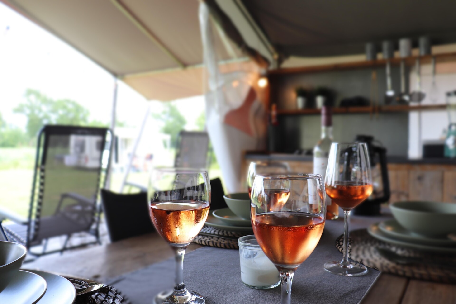 Er is een woongedeelte en 2 aparte slaapgedeeltes met echte luxe bedden, geschikt voor in totaal 4 personen. De tenten zijn ingericht met stevige, steigerhouten meubels. Het keukentje, voorzien van een koelkast en een 4-pits gasfornuis, is uitgerust met wieltjes zodat je bij mooi weer op het terras kunt koken.