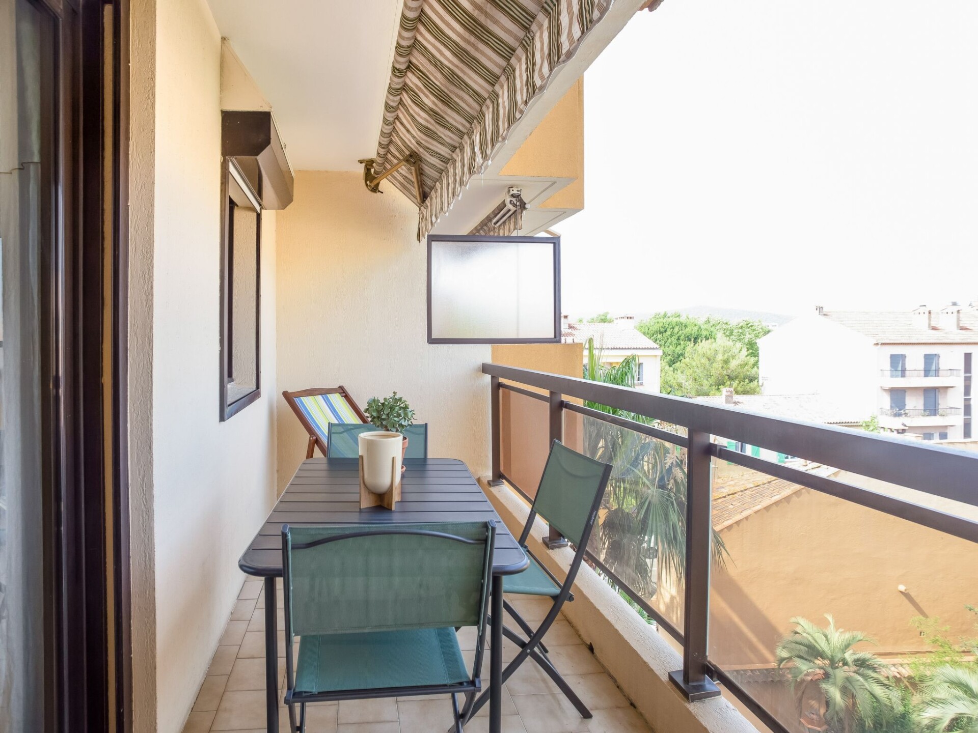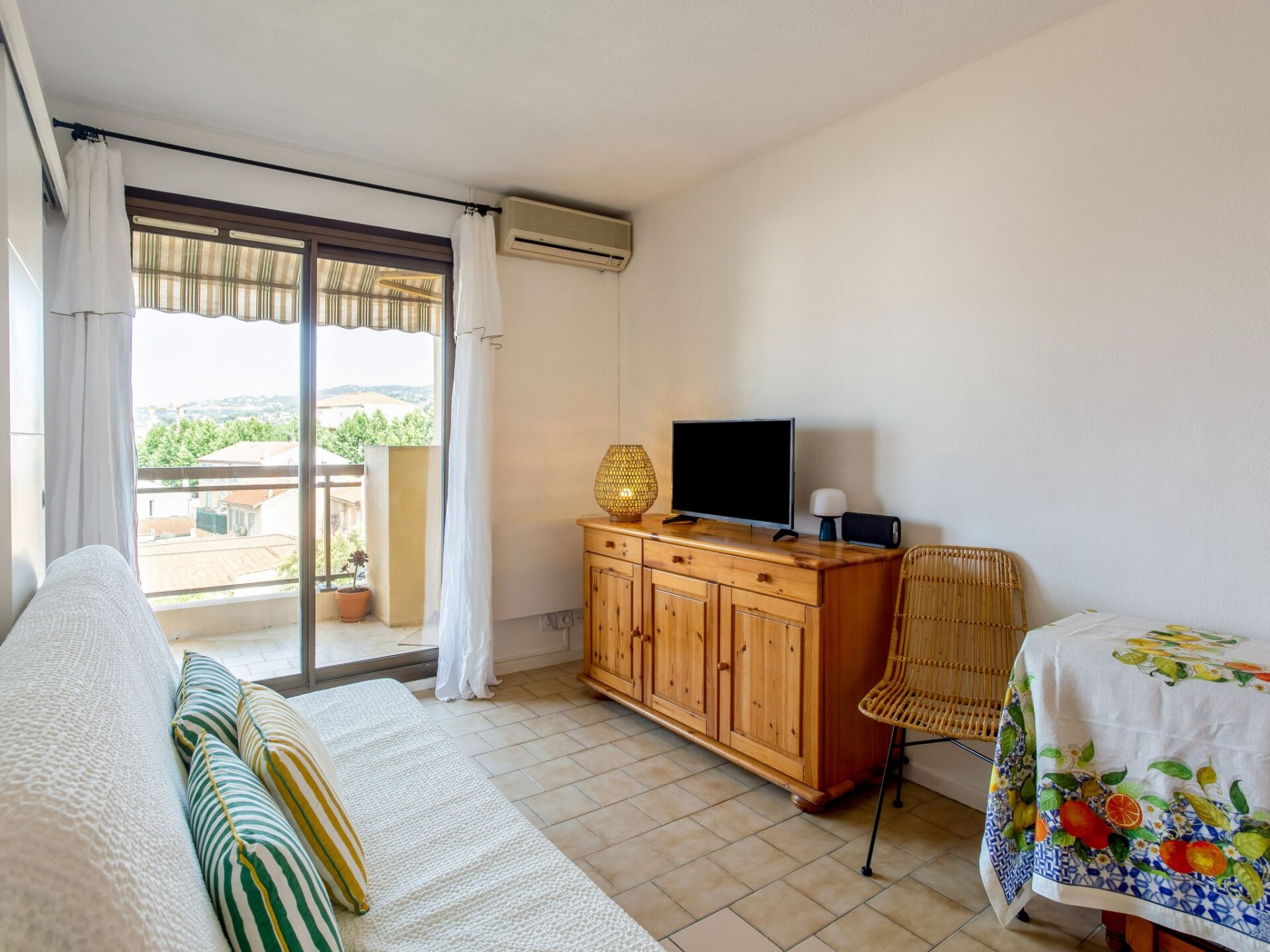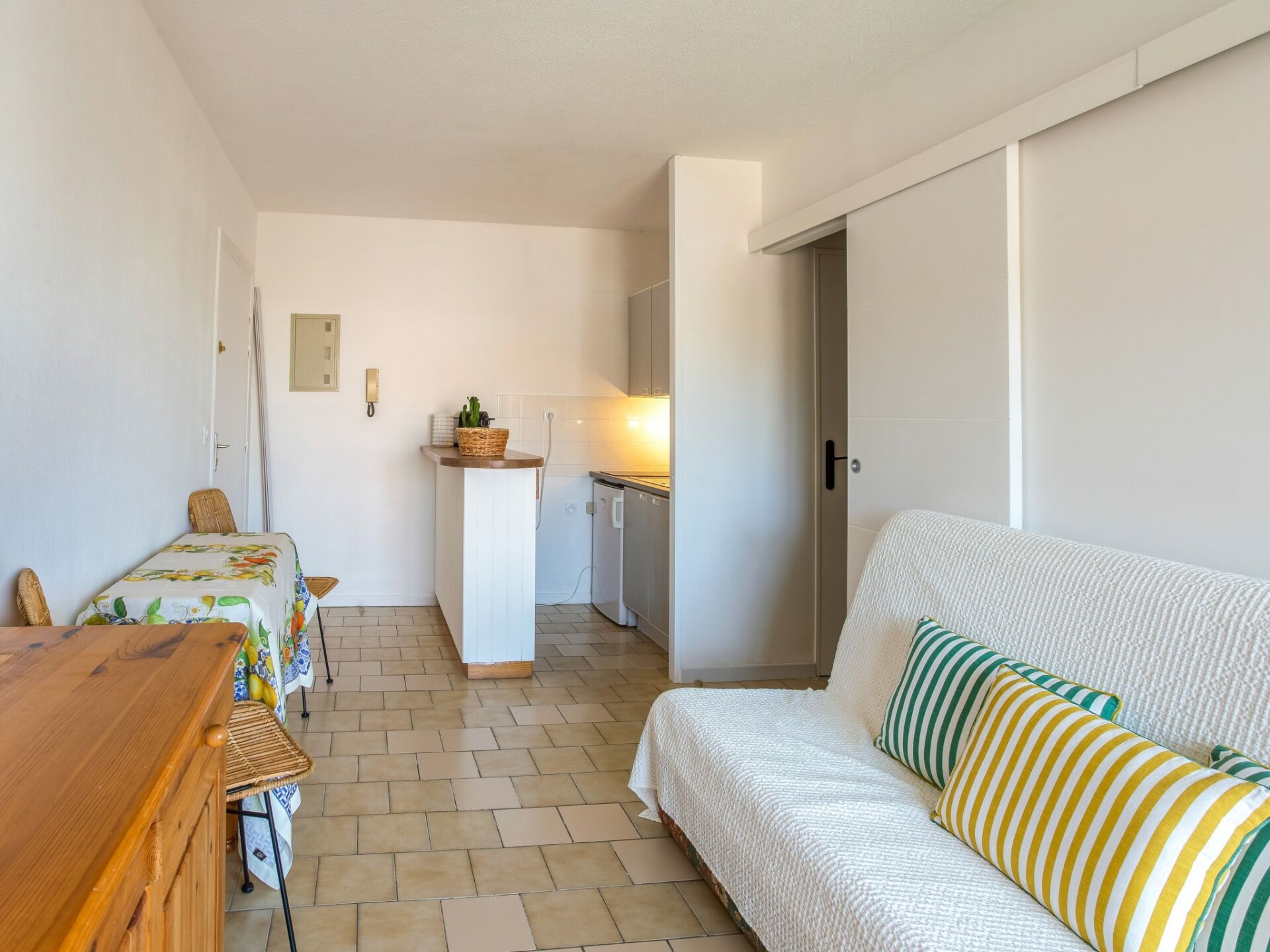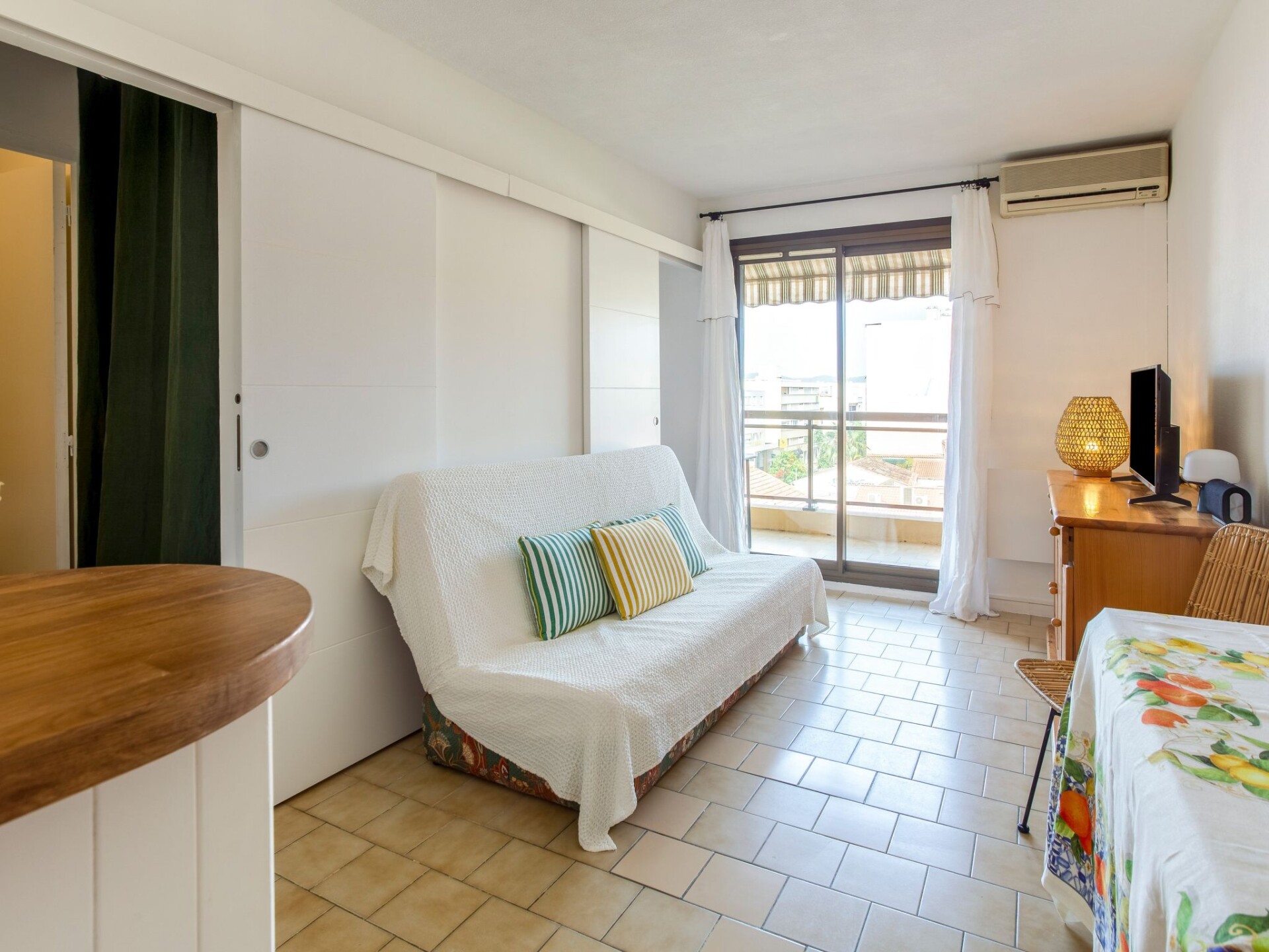 Appartement 2-kamers 28 m2 op de 4e verdieping. Comfortabel ingericht: woonkamer met 1 2-pers divanbed (1 x 140 cm, lengte 190 cm), air-conditioning. Uitgang naar het terras. 1 kamer met 1 2-pers bed (140 cm, lengte 190 cm). Kookhoek in de hal (2-pits kookplaat, oven, broodrooster, waterkoker, magnetron, elektrische koffiemachine, pads voor de koffiemachine (Nespresso) extra). Douche, aparte WC. Elektrische verwarming. Terras. Balkonmeubilair. Ter beschikking: wasmachine, strijkijzer, haardroger. Internet (WiFi, extra). Geschikt voor families. Niet rokers woning, geen parkeerplaats. Maximaal 1 klein huisdier/hond toegestaan. TV alleen FR. Rookmelders. Aanbod door een particulier volgens art. 155, IV van CGI. 83070001678QL