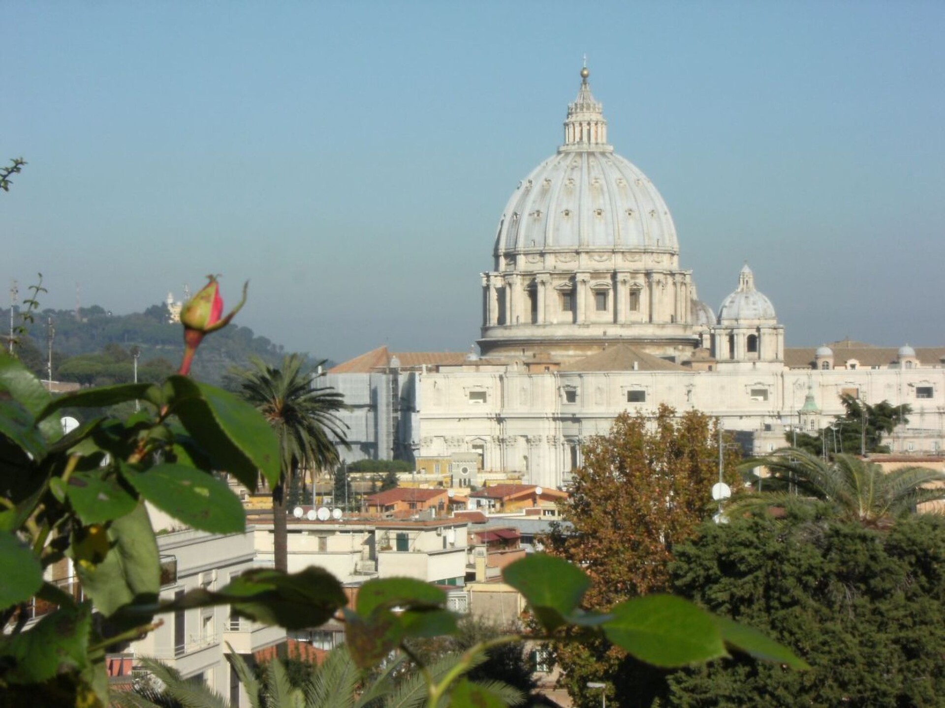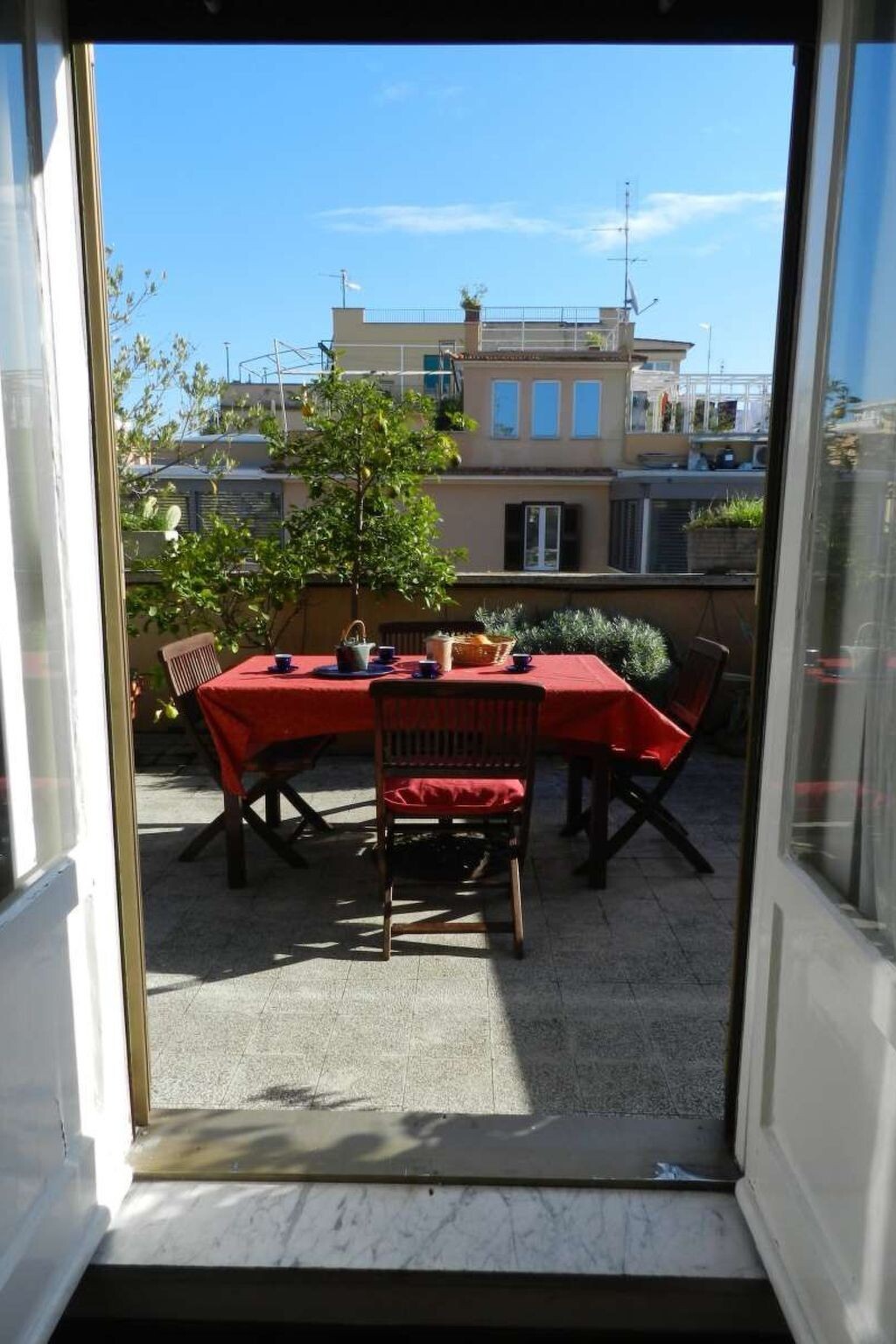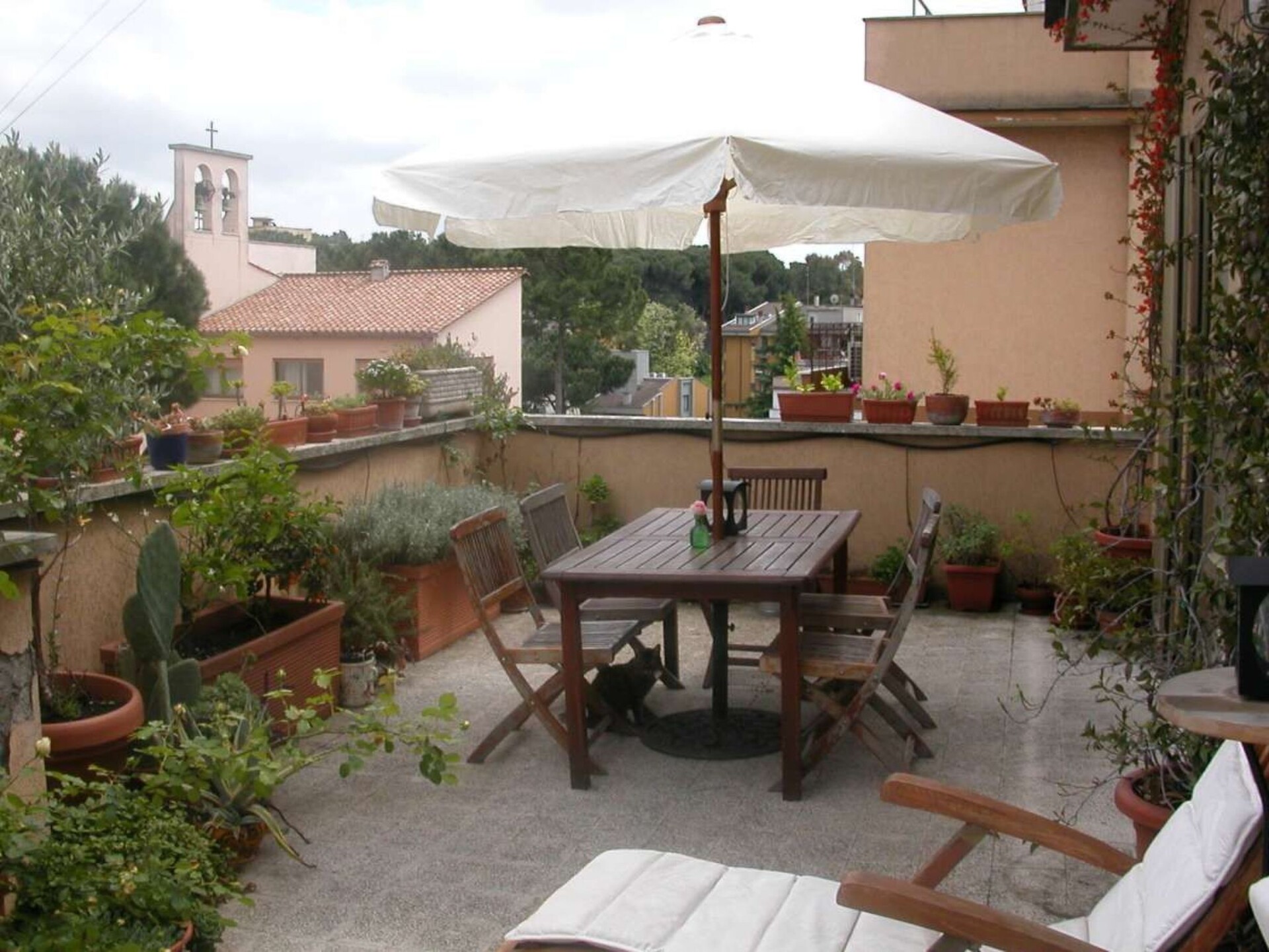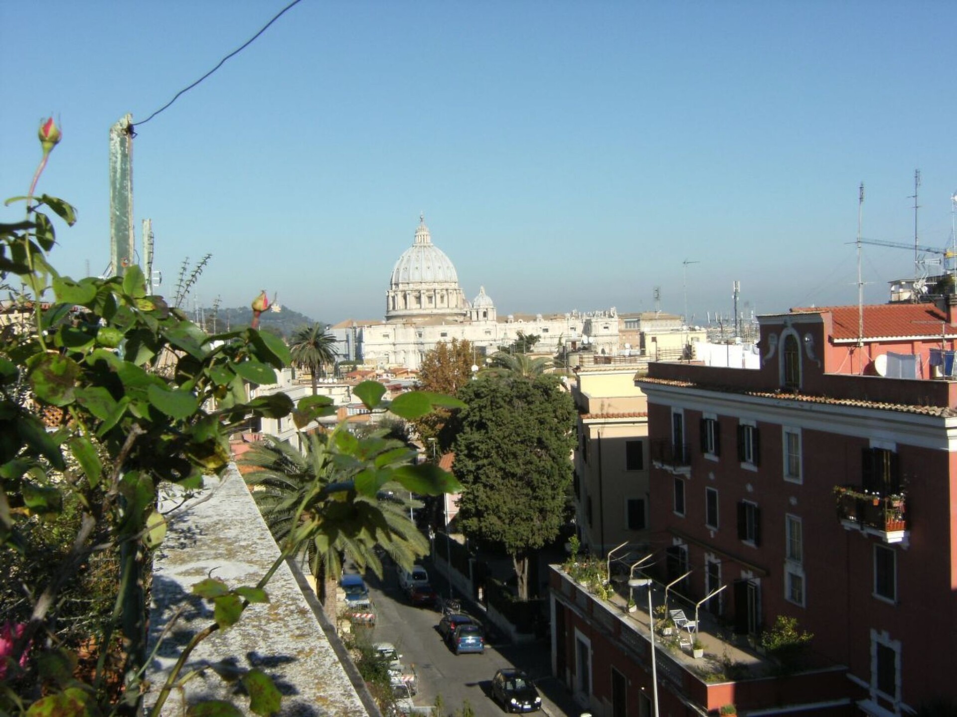 The holiday flat - an attic with a large roof terrace - is located in a very good and relatively quiet residential area with a stunning view of Rome's main church, San Pietro.It also enjoys an almost unbelievable panoramic terrace of approx. 35 square metres, equipped with a lounger or deckchair, table and chairs. The view of the dome, the upper part of the façade and the groups of figures in the narthex is breathtaking even during the day, and the sight of the huge dome's lantern illuminated at night is almost indescribable!The quiet and light-flooded flat (approx. 75 sqm) with windows on 3 sides is located on the 4th floor (a new lift has been available since 2011!) of a small apartment building and is attractively furnished: large living/dining room with access to the terrace, large satelliteTV, dvd player, ceiling fan, new double sofa bed, another 3-seater couch and 2 armchairs, large bedroom with ceiling fan, kitchen (***) with dishwasher and washing machine, view of S. Pietro and exit to terrace, bathroom (with bathtub, hairdryer). The furnishings are good and very well maintained, beautiful parquet floors, central heating (gas).Very good connections to other central areas of the city: bus line 64 through the entire city centre to Termini, bus line 34 (stops 25 m further on) to Piazza Cavour, light rail via Trastevere to Termini.Lift available in the building. IT058091C2ZC6MS6SZ
