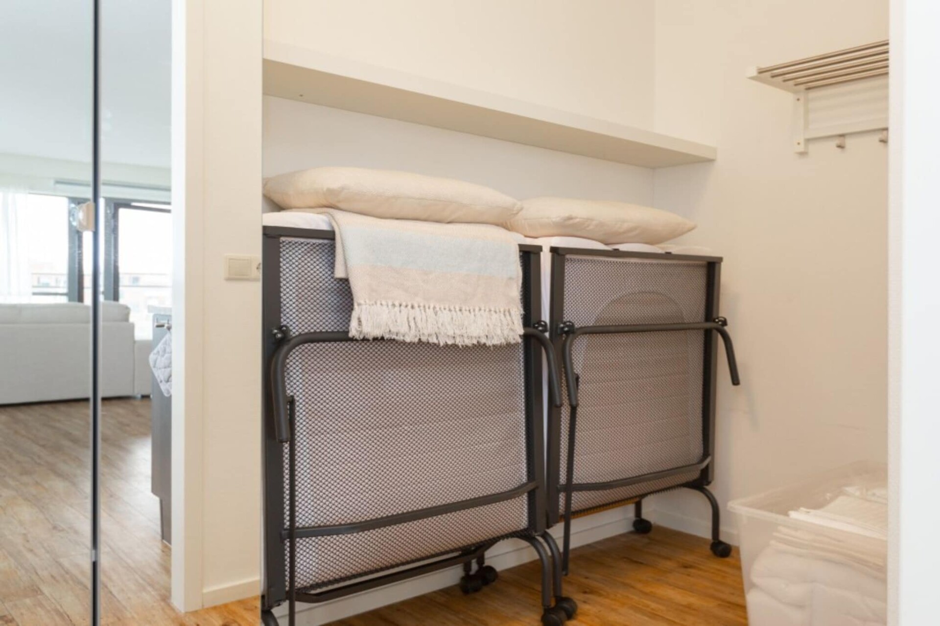 Appartement nr. 80C heeft een groot balkon met uitzicht op de scheepswerf, de haven en gedeeltelijk uitzicht over de zee en het strand. Het appartement heeft een eigen parkeerplaats vanwaar u met de lift naar de ingang van het appartement kunt gaan. gemeubileerd. Het biedt benodigdheden zoals snel internet, een grote SMART TV in de woonkamer en een tweede tv in de slaapkamer. De slaapkamer is voorzien van een comfortabel boxspringbed en twee extra hoogwaardige opklapbedden, waardoor de capaciteit van dit appartement wordt uitgebreid tot vier gasten, waardoor dit appartement een zeer kosteneffectieve keuze is voor gezinnen en groepen. Een volledig uitgeruste keuken, een ruime badkamer met douche en bad, een aparte Een toilet en uw eigen was faciliteiten maken dit een ideaal appartement voor zowel korte als lange verblijven.