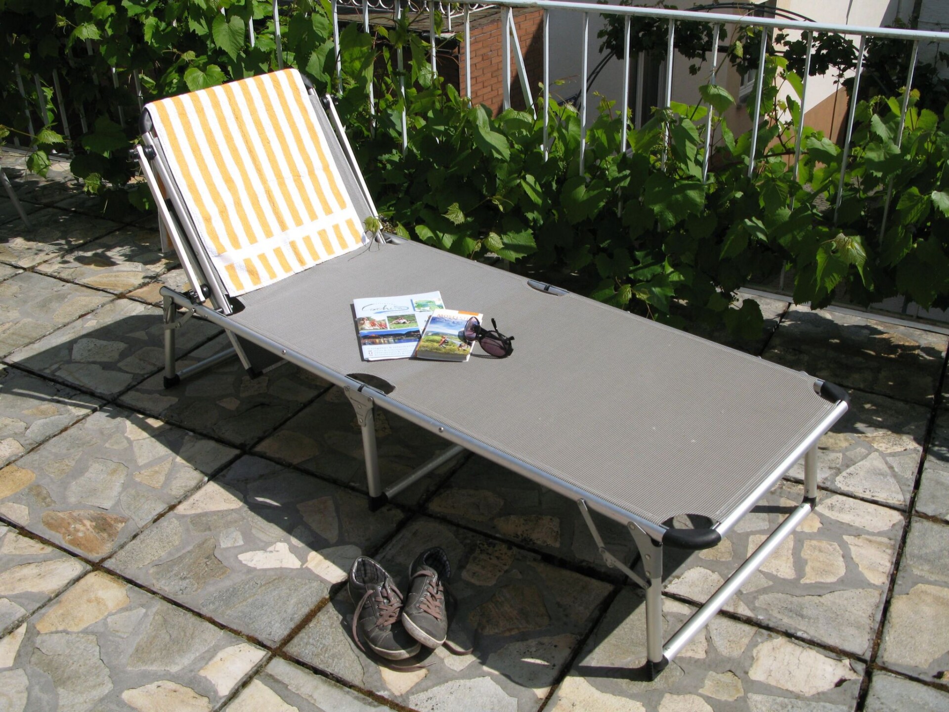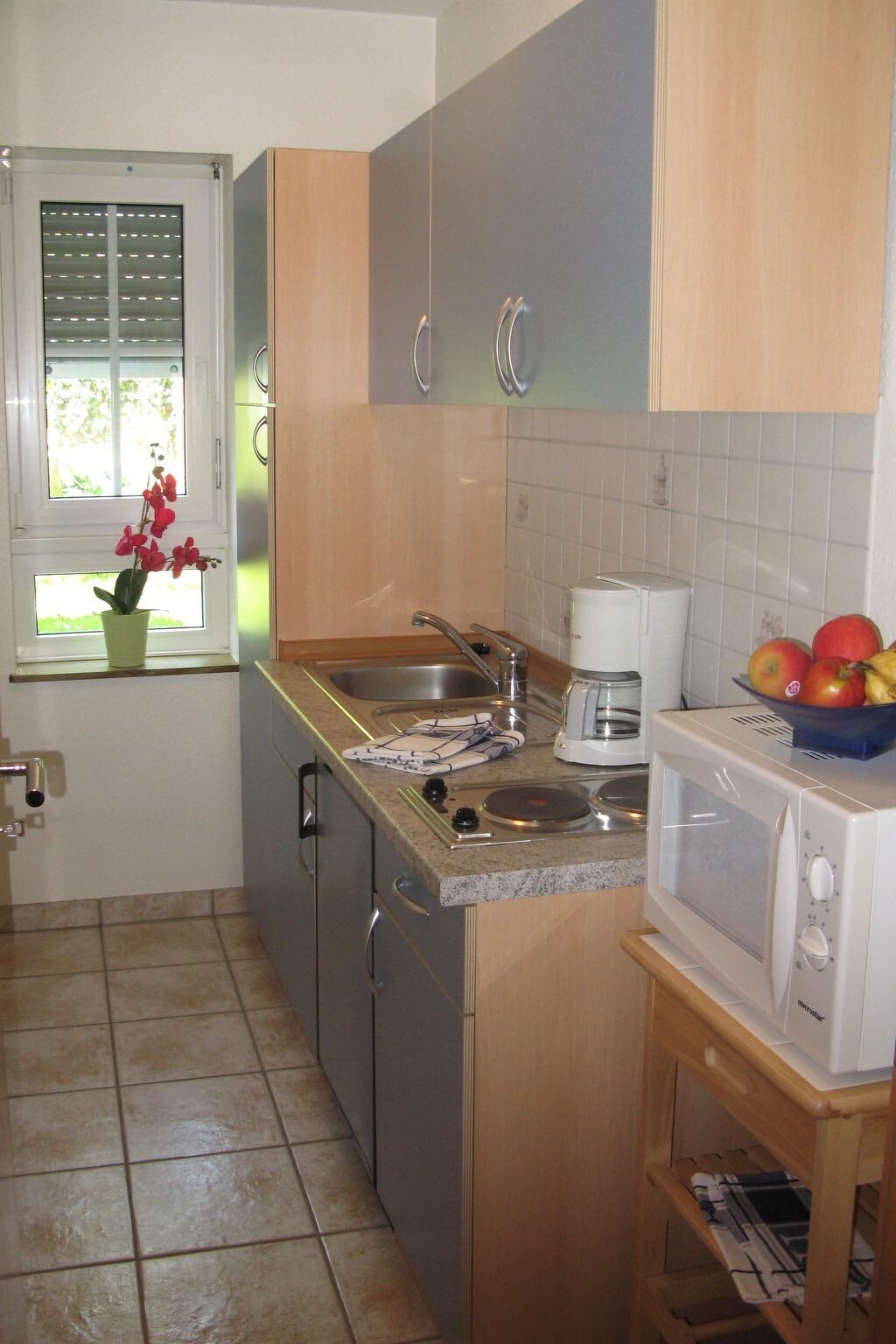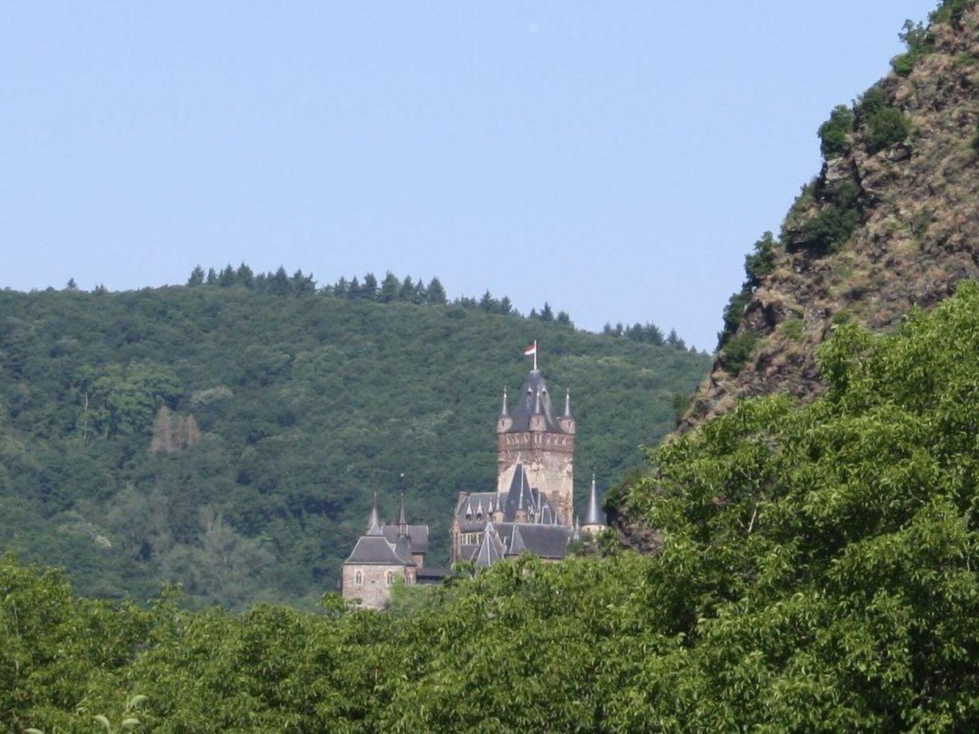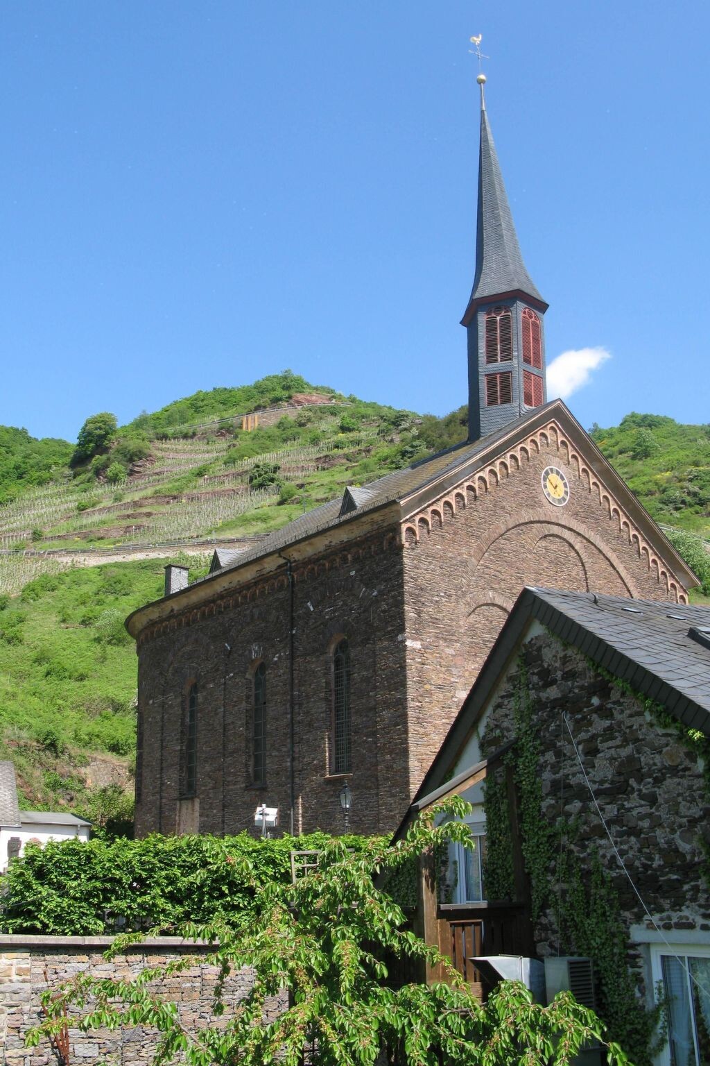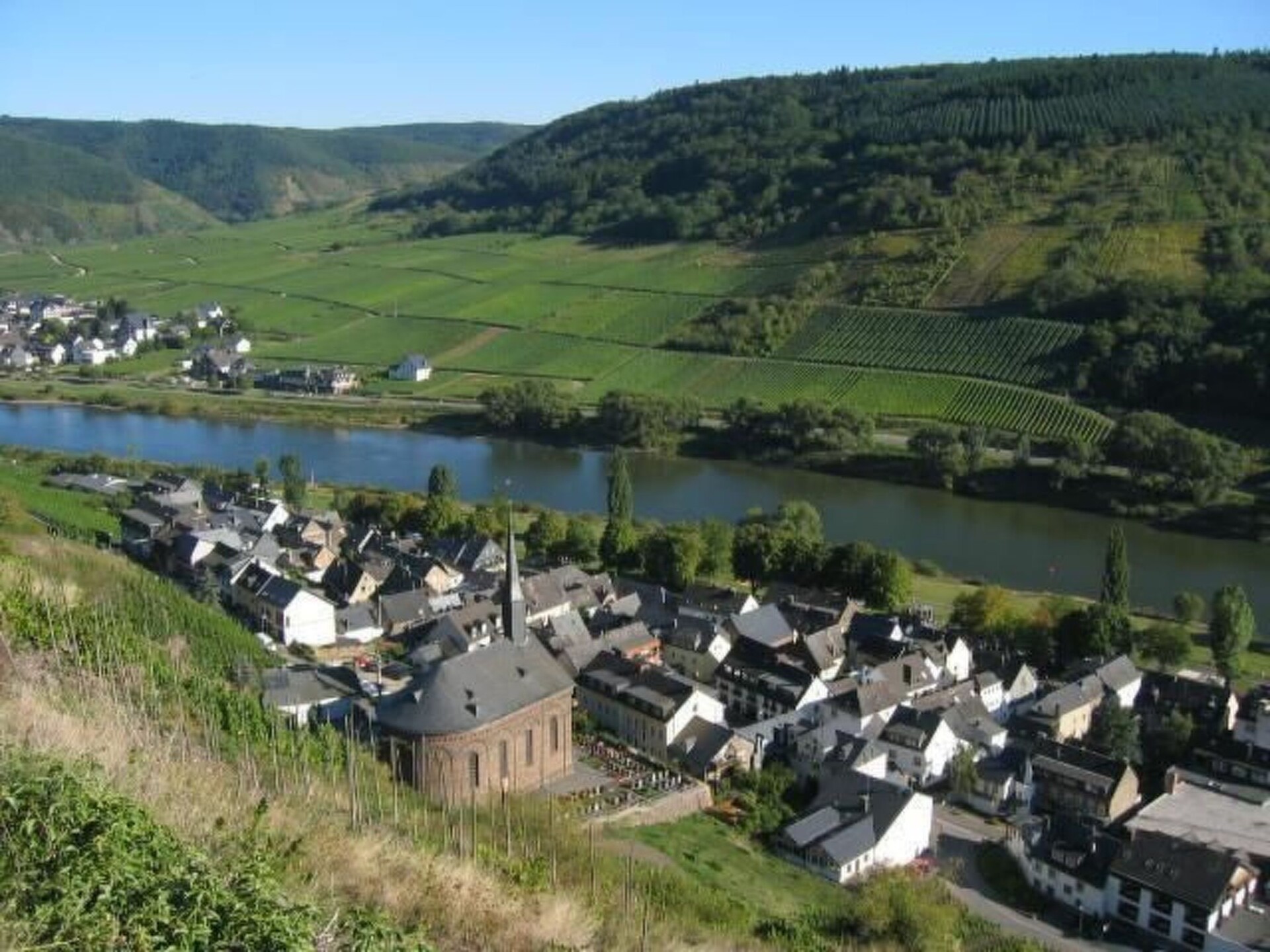 The typical Moselle holiday home is located in the centre of the small village of Valwig in a quiet location near the vineyards, about three kilometres from the tourist centre of Cochem.At the front is a spacious sun terrace with awning, sun loungers and deckchairs; behind the house is an idyllic little garden with a shady vine arbour for relaxing or barbecuing.The approx. 40 square metre flat is located on the first floor and consists of the following rooms: a living room with a sofa bed, a bedroom with a double bed, a small kitchen with a 2-ring hob, microwave and coffee machine and an adjoining bathroom with a shower. After an active day, you can relax with a novel in the cosy living room seating area in the evening. The small kitchen has everything you need to serve a delicious breakfast or dinner in the dining area of the living room. And if you don't feel like cooking, you can enjoy selected regional specialities with a fine bottle of Moselle wine in the adjoining restaurant and wine bar. You can also order your breakfast rolls for collection next door.The Moselle village of Valwig is only five minutes away from the tourist centre of Cochem. There you will find various shopping facilities, a bank, a pharmacy, a hospital and a wide range of leisure activities: e.g. the Moselbad (wave and outdoor pool), the Reichsburg Cochem, the Cochem chairlift, the historic mustard mill, an animal and leisure park (Klotti), a small cinema, various excursion boats and much more.There are also plenty of excursion options in the surrounding area, be it to the Deutsches Eck in Koblenz, the Roman city of Trier, the Maar lakes in the Eifel or even Cologne Cathedral. The quaint little wine village is particularly inviting for hiking, e.g. on the "Apolloweg" or the "Breva Wein & Weg", for cycling or for socialising in one of the wine taverns or wine taverns, and during the season you will receive a free guest ticket for free use of buses and trains in the Cochem-Zell district and other smaller discounts.You can store your bicycles or motorbikes free of charge in the lockable vaulted cellar. A public car park is available free of charge at the house and 50 metres from the house.