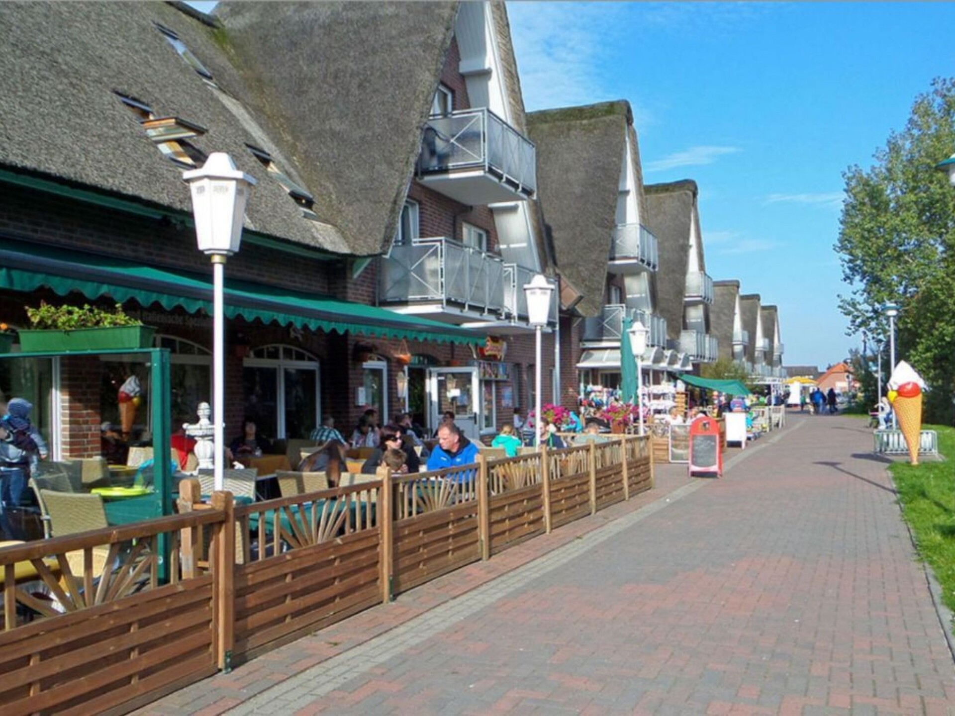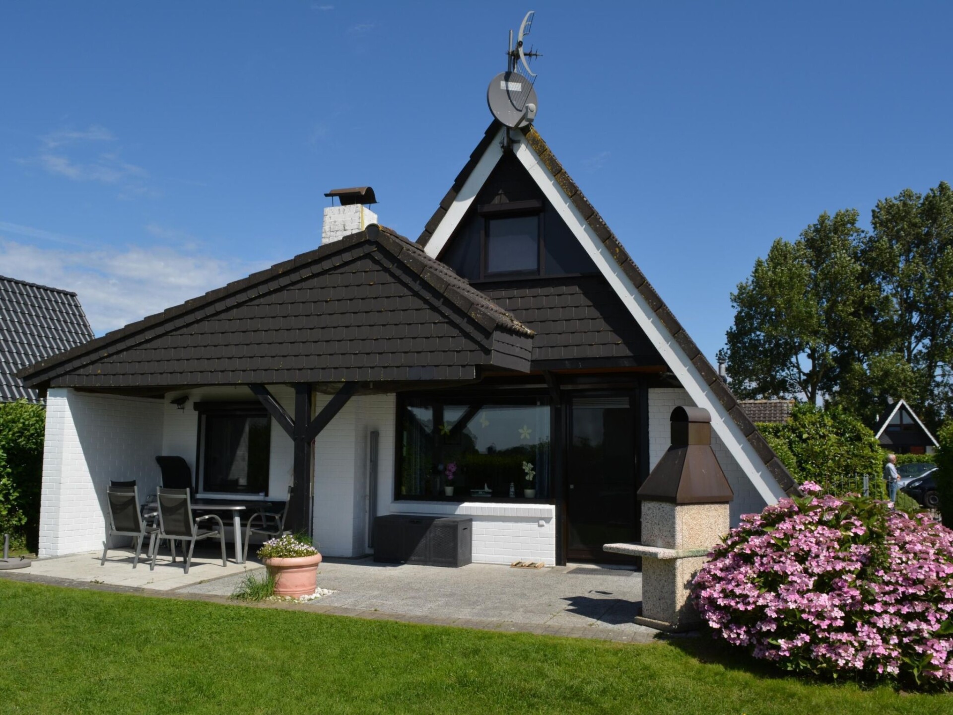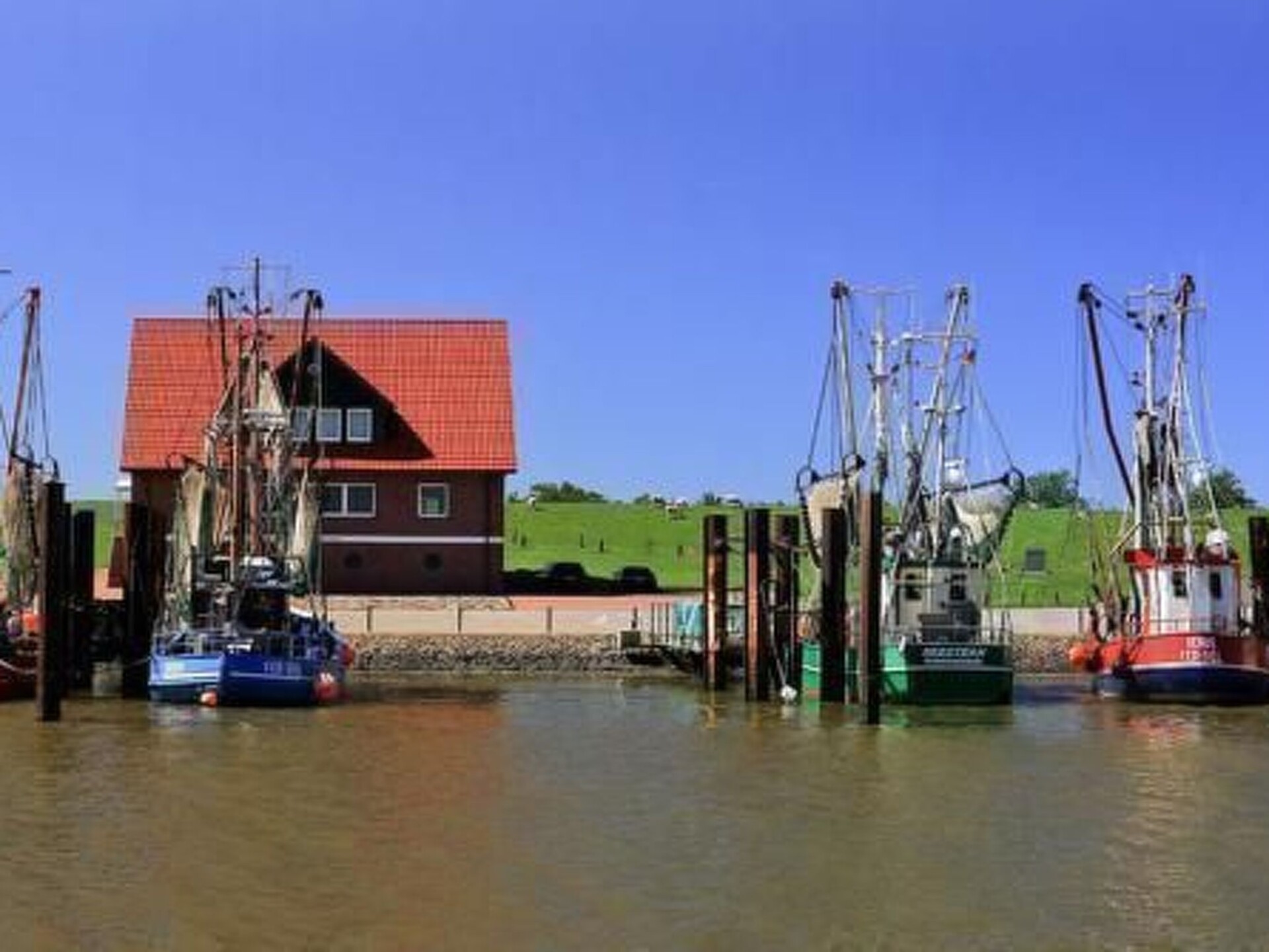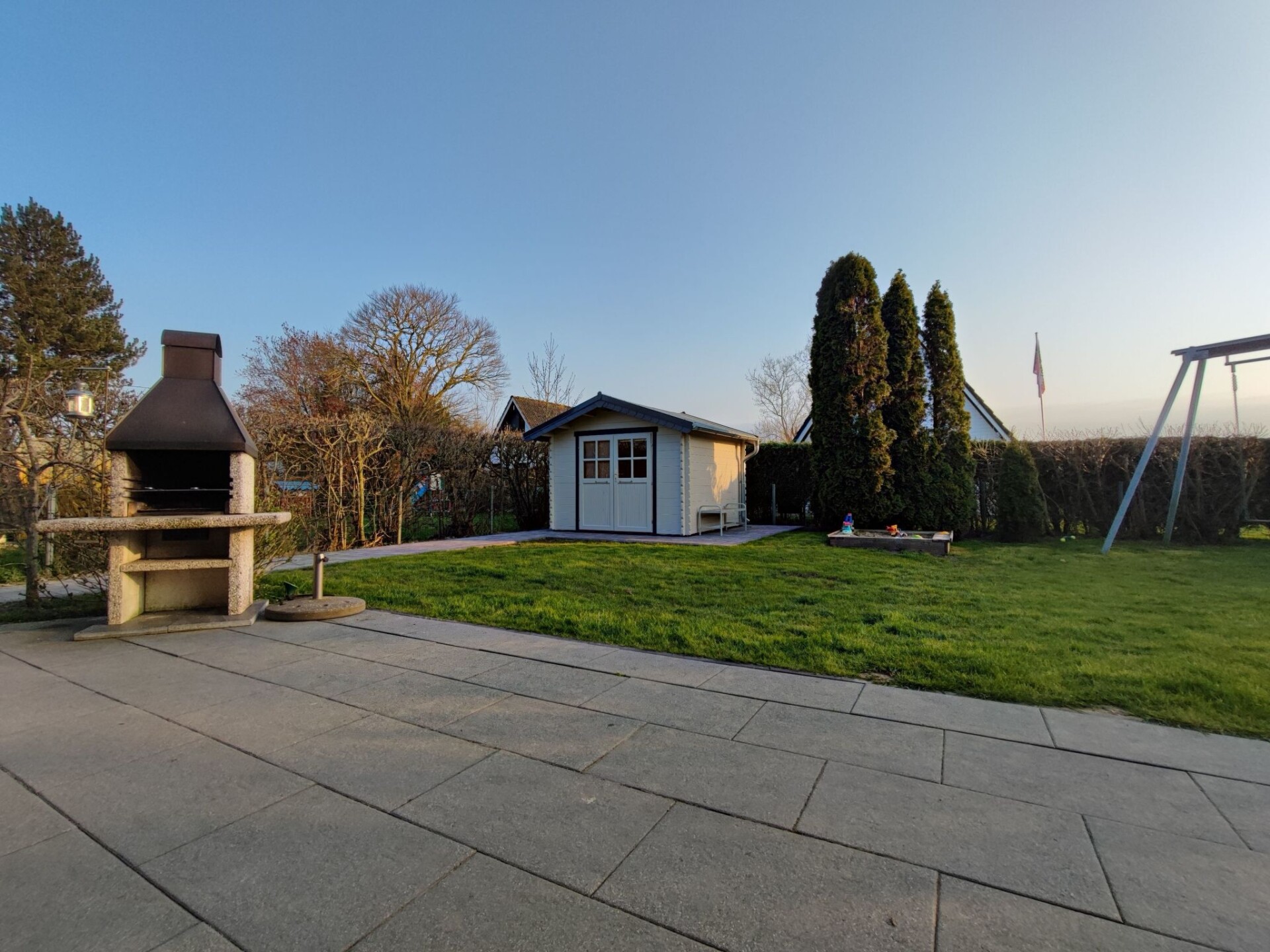 Maximaal 2 huisdieren/honden toegestaan. This detached roof-only house (non-smoking) is located approx. 300 metres from the dyke, at the end of a quiet holiday home estate with little traffic.The house can accommodate up to five people. The ground floor is approx. 50 m² in size and consists of the following rooms: Large living room with integrated kitchen and dining area, access to the terrace; small room with a bed, large bathroom with underfloor heating, walk-in shower, toilet and washbasin; utility room with washing machine and extra WC. On the upper floor there is a bedroom with a double bed and a bedroom with two single beds. With a travel cot (including pillow, duvet and extra mattress) and a children's high chair, which are provided free of charge by the owner, as well as a door gate at the top, a toilet seat for children and a stool in the bathroom, the house offers family-friendly facilities. Radio/CD, television (satellite TV) and DVD player are also available. Internet/WLAN is also provided free of charge by the owner.Large covered south/west-facing terrace with garden furniture and barbecue, where you can enjoy the sun from late morning until sunset. Garden with swing, sandpit and plenty of space to play. The property is completely fenced so that children and dogs can run around the house.Bicycles can be hired from the bike hire about 300 metres from the house next to the play barn.Cats and birds are not allowed! The complex is located directly on the North Sea dyke, so that you can reach the North Sea lagoon, the green beach of Burhave or the play barn in a few minutes on foot. The centre of Butjadingen-Burhave, which offers numerous restaurants and shopping facilities, is also within easy reach by bike or on foot. The proximity to the North Sea dyke offers a good starting point for long walks or cycle tours along the coast of Butjadingen. Just a few minutes' walk from the holiday home, the dog beach and another designated dog meadow behind the play barn offer the opportunity for your four-legged friends to romp around to their heart's content.