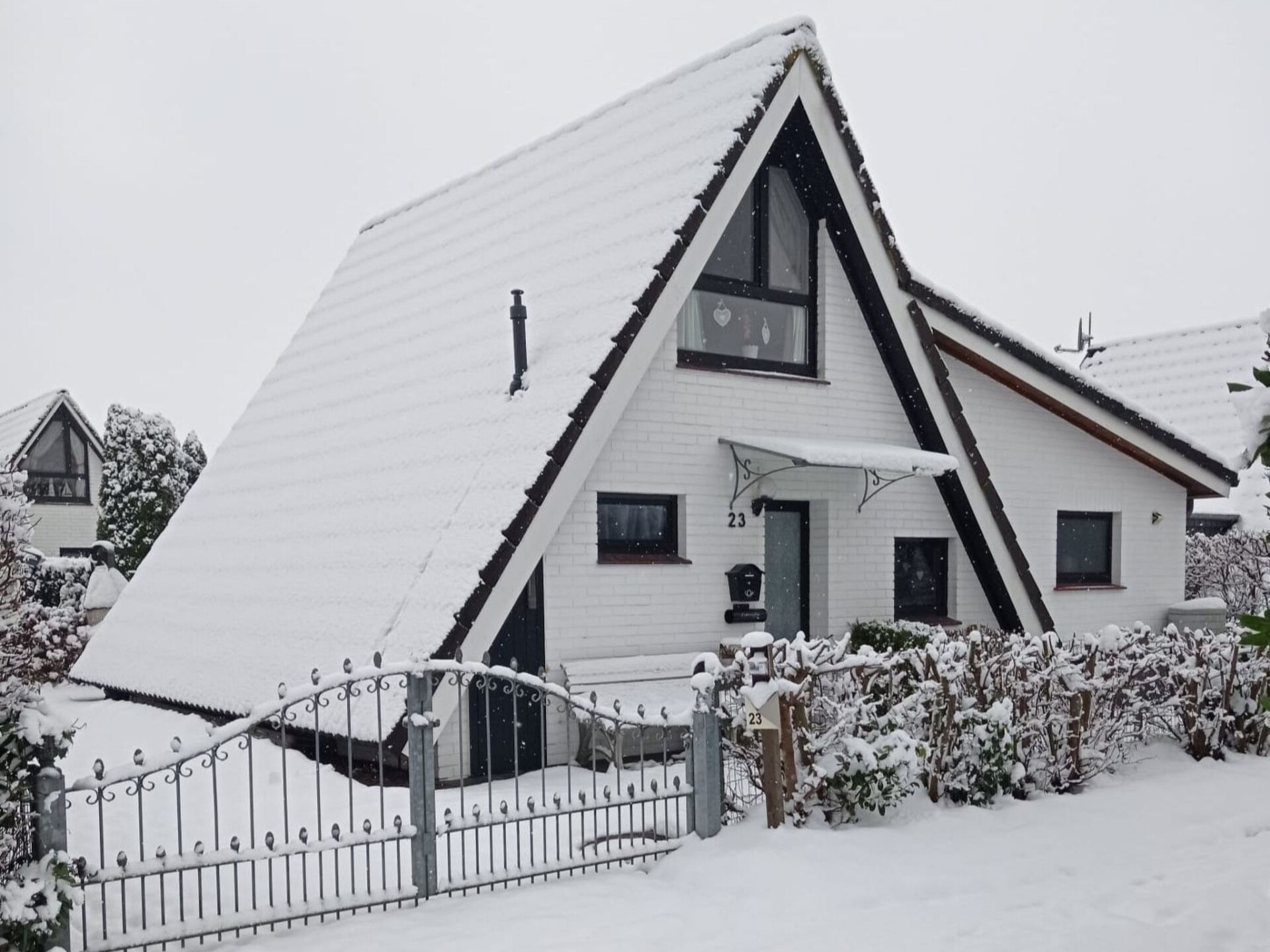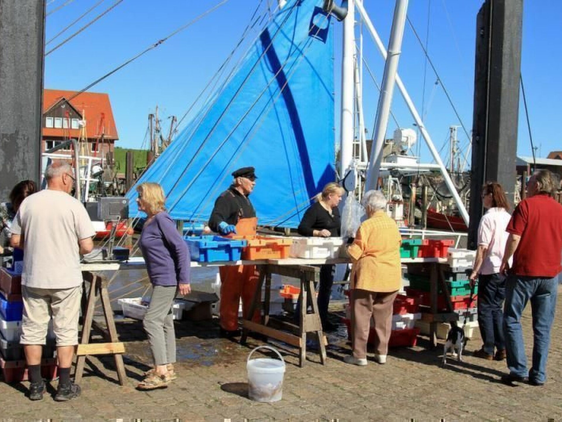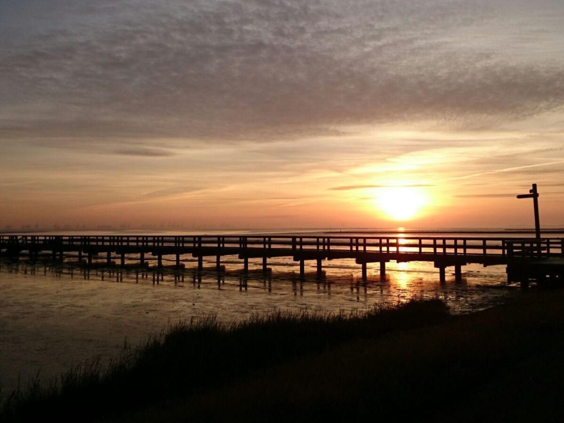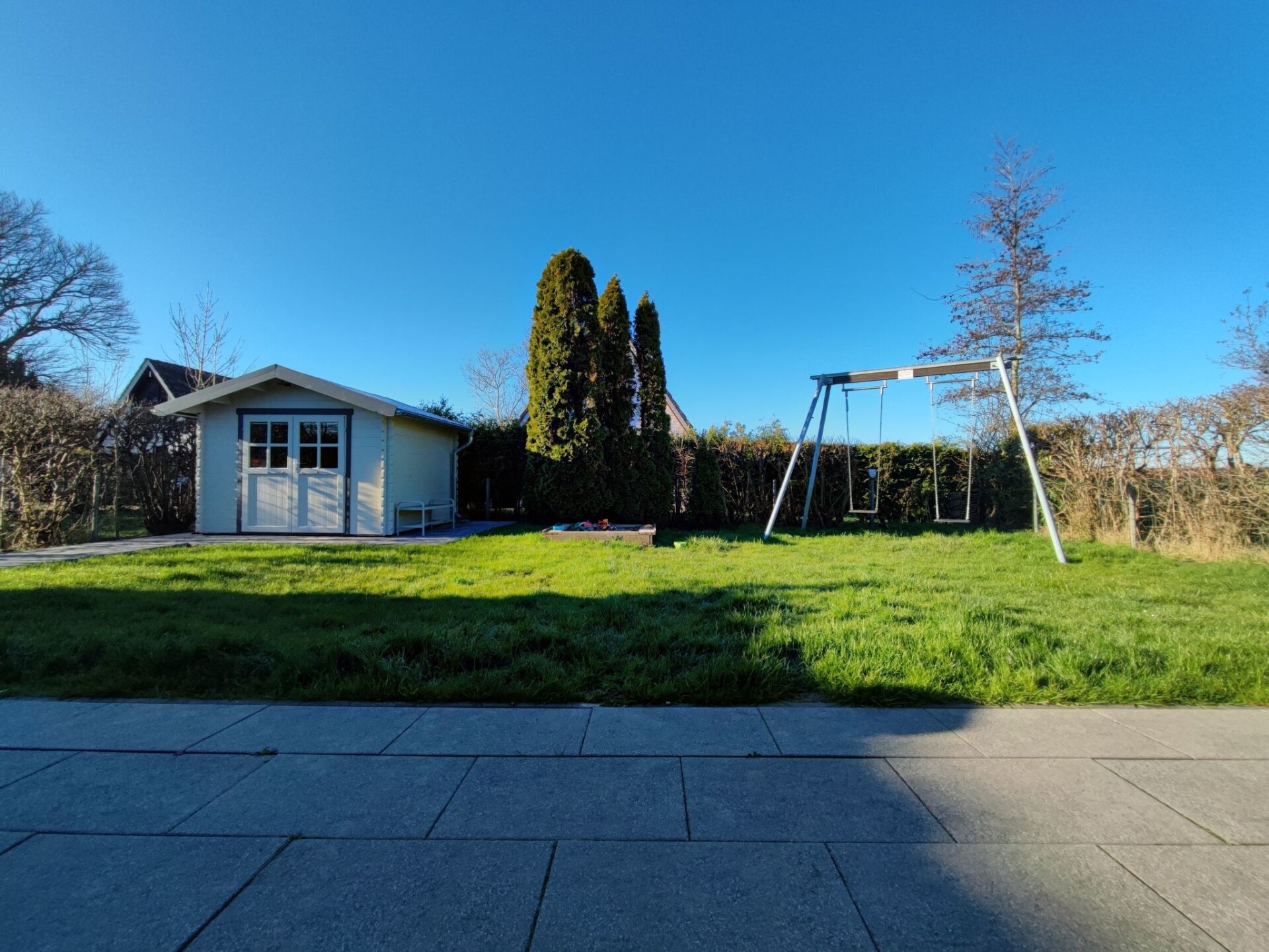 Maximaal 2 huisdieren/honden toegestaan. This detached roof-only house (non-smoking) is located approx. 300 metres from the dyke, at the end of a quiet holiday home estate with little traffic.The house can accommodate up to five people. The ground floor is approx. 50 m² in size and consists of the following rooms: Large living room with integrated kitchen and dining area, access to the terrace; small room with a bed, large bathroom with underfloor heating, walk-in shower, toilet and washbasin; utility room with washing machine and extra WC. On the upper floor there is a bedroom with a double bed and a bedroom with two single beds. With a travel cot (including pillow, duvet and extra mattress) and a children's high chair, which are provided free of charge by the owner, as well as a door gate at the top, a toilet seat for children and a stool in the bathroom, the house offers family-friendly facilities. Radio/CD, television (satellite TV) and DVD player are also available. Internet/WLAN is also provided free of charge by the owner.Large covered south/west-facing terrace with garden furniture and barbecue, where you can enjoy the sun from late morning until sunset. Garden with swing, sandpit and plenty of space to play. The property is completely fenced so that children and dogs can run around the house.Bicycles can be hired from the bike hire about 300 metres from the house next to the play barn.Cats and birds are not allowed! The complex is located directly on the North Sea dyke, so that you can reach the North Sea lagoon, the green beach of Burhave or the play barn in a few minutes on foot. The centre of Butjadingen-Burhave, which offers numerous restaurants and shopping facilities, is also within easy reach by bike or on foot. The proximity to the North Sea dyke offers a good starting point for long walks or cycle tours along the coast of Butjadingen. Just a few minutes' walk from the holiday home, the dog beach and another designated dog meadow behind the play barn offer the opportunity for your four-legged friends to romp around to their heart's content.