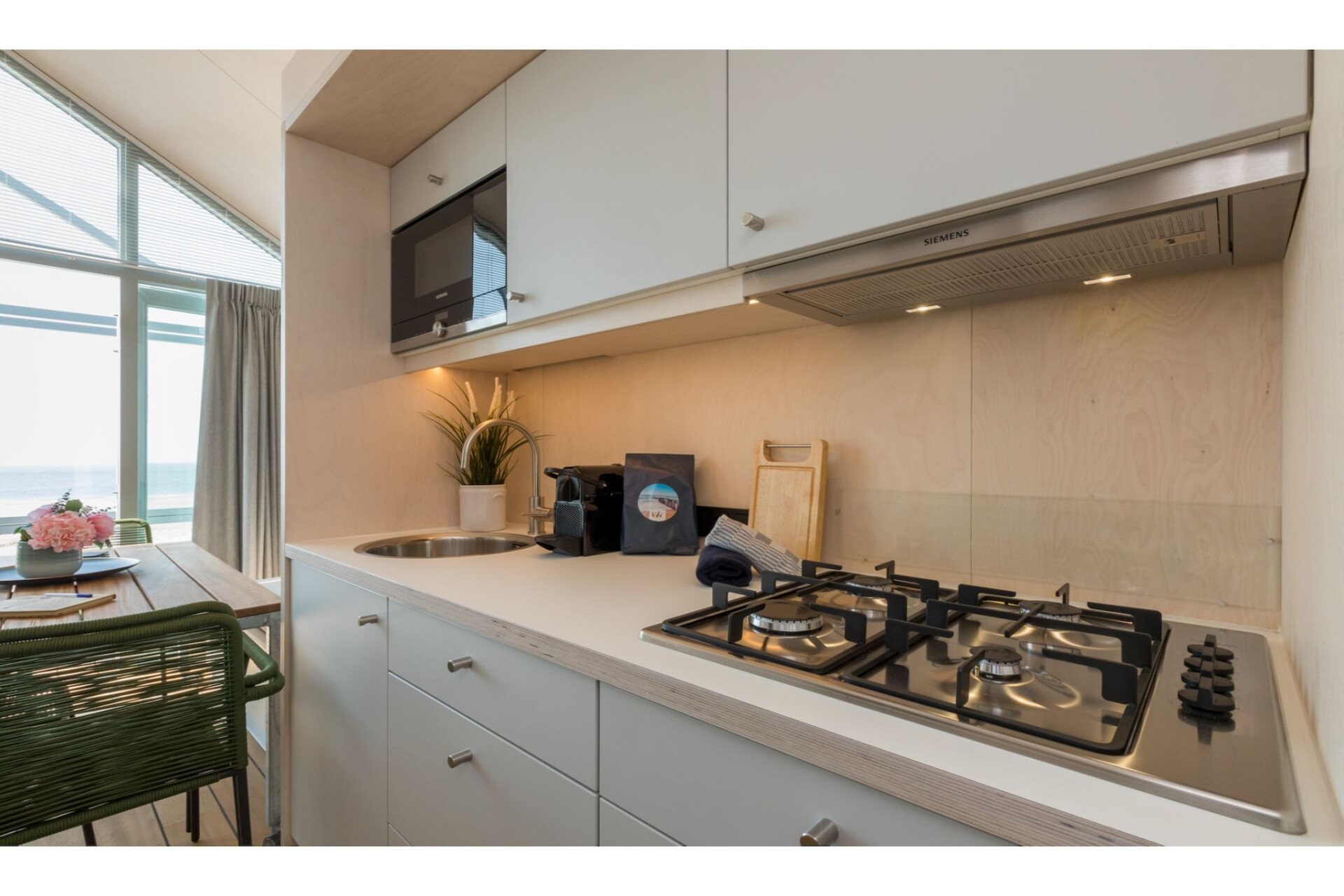 Het strandhuis geschikt voor 2 volwassenen en 3 kinderen heeft een fris en strak interieur en door de slimme indeling krijg je een heel ruimtelijk gevoel. Het gevoel wordt nog eens extra benadrukt door de grote glazen pui aan de voorkant die tevens helemaal open gezet kan worden. Het voorterras en de binnenkant van de woning worden hierdoor één groot geheel