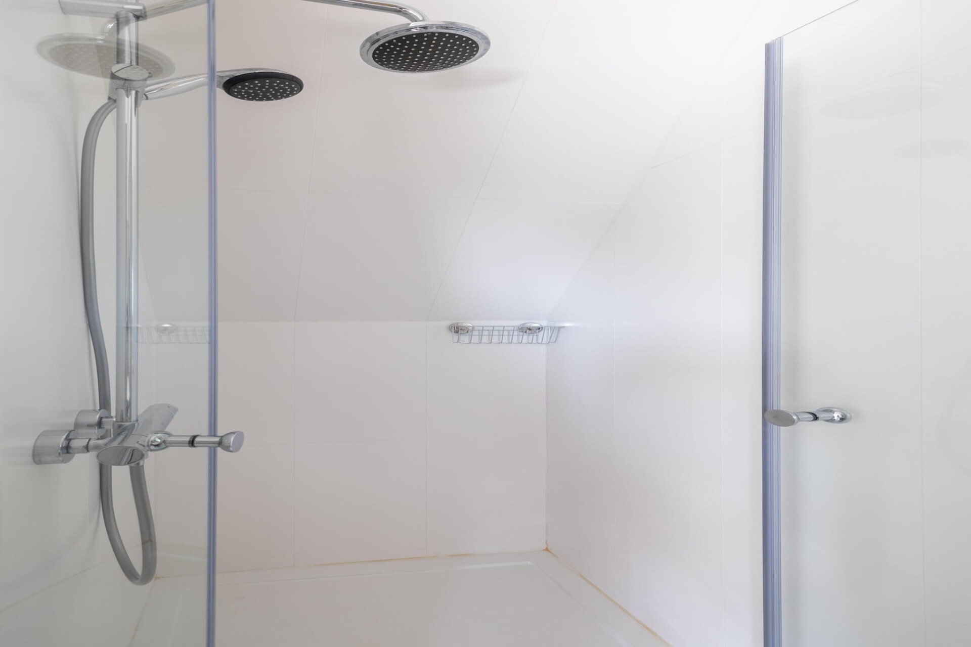 Op de eerste verdieping vindt u de slaapkamer en de aangrenzende badkamer. De slaapkamer is een oase van rust met een comfortabel tweepersoonsboxspring (160x200 cm), een gezellige zithoek met een eenpersoonsslaapbank die geschikt is voor een kind, en een tweede televisie voor extra entertainment. Een ruime kledingkast, planken en een passpiegel maken de kamer compleet, terwijl bedlampjes zowel functionele als sfeerverlichting bieden.