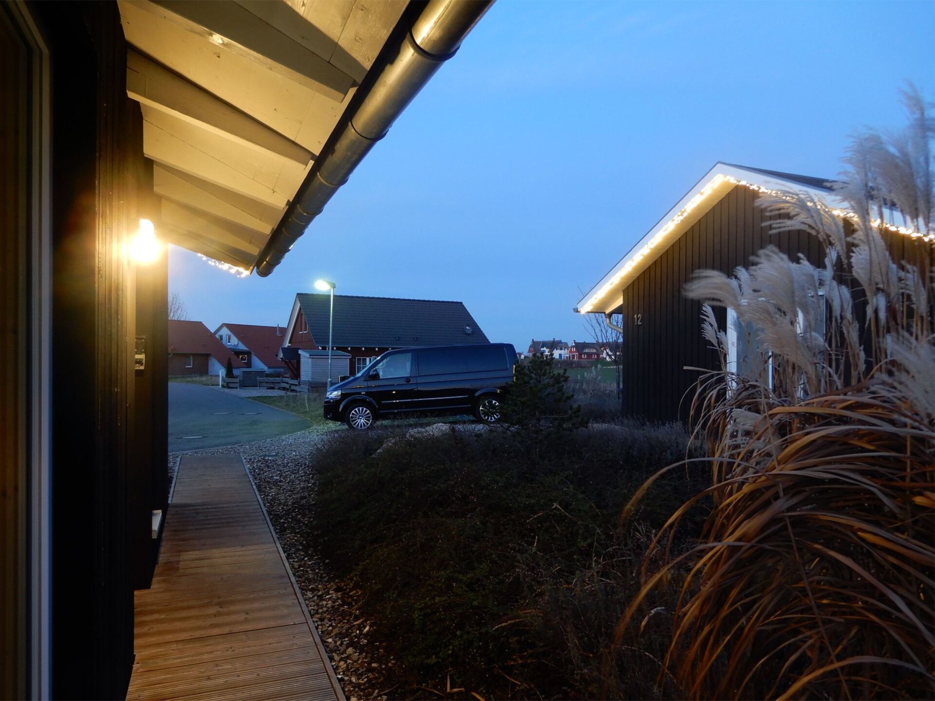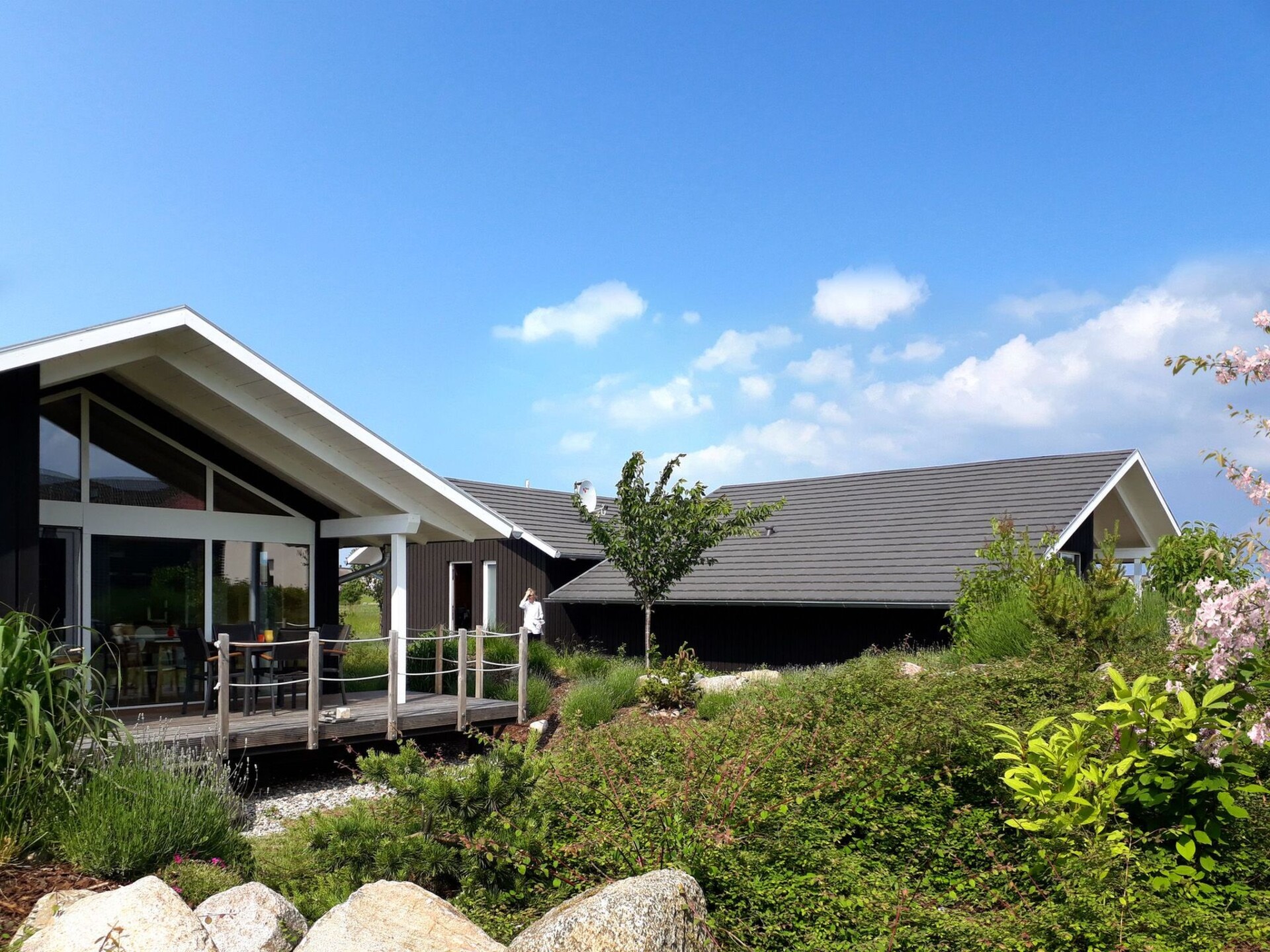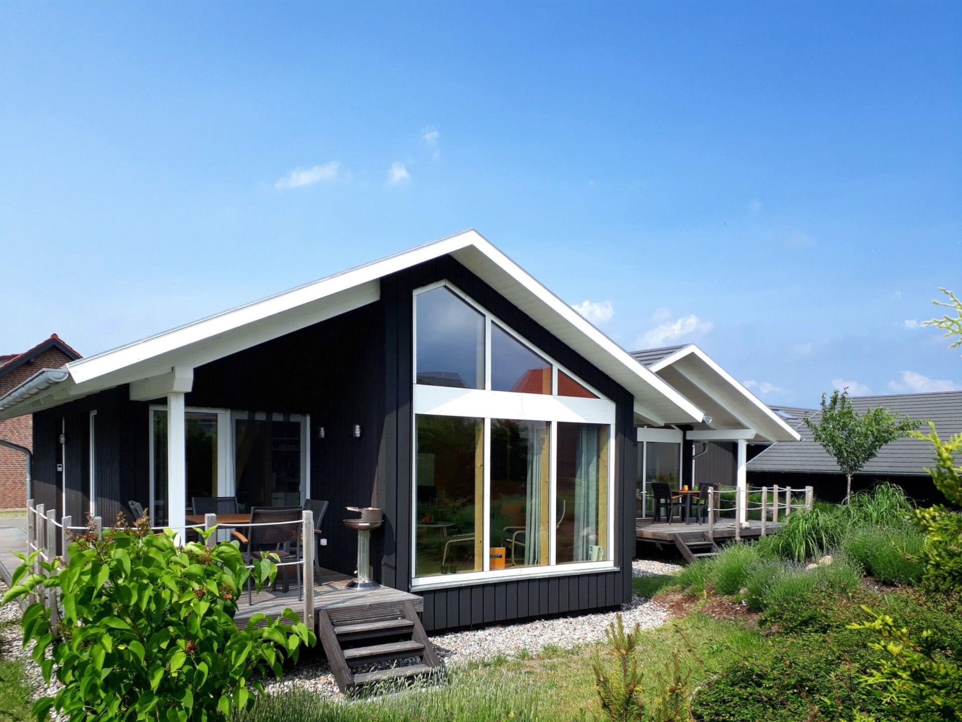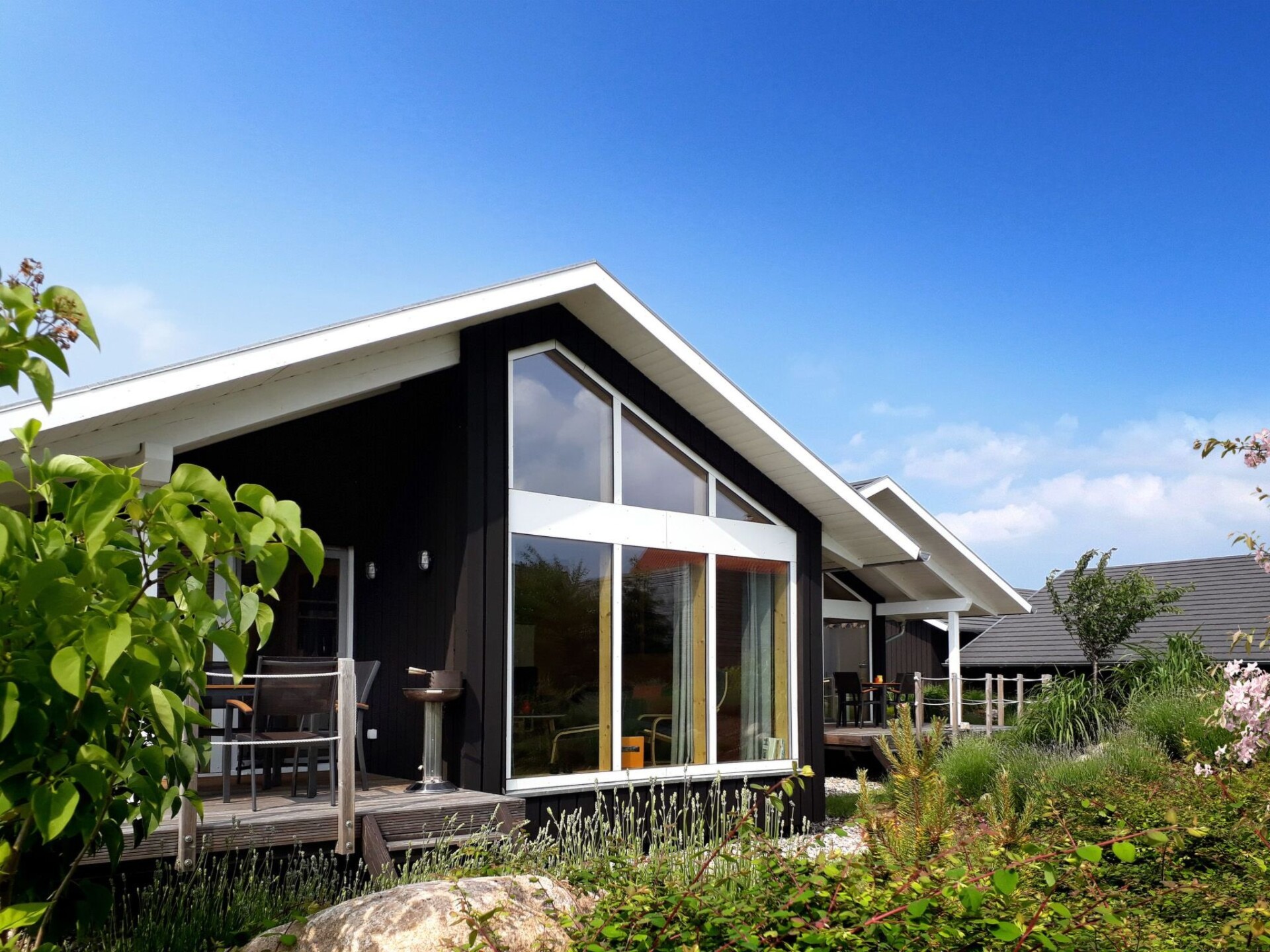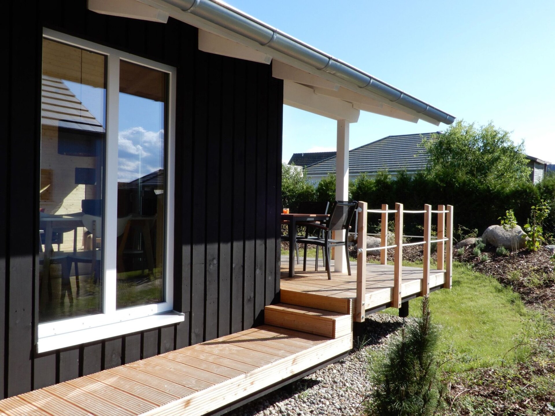 Discover the charm of our "Sonneneck" holiday home, which will remind you of Danish beach houses with its style. Inspired by the picturesque island of Rømø, this approx. 60 square metre cottage is finished in black ebony and offers a very special atmosphere both inside and out with its completely wooden construction. Oiled ash floorboards ensure a pleasant indoor climate at all times. The house is an oasis of peace and cosiness, ideal for anyone who wants to spend an unforgettable time alone, as a couple or with the family.Inside the house, you will find an individual and functional floor plan that offers a practical yet cosy room layout. The customised built-in furniture not only creates a cosy atmosphere in the bedrooms. The centrepiece is undoubtedly the open-plan kitchen-living room, from which you can look directly into the lushly landscaped garden through the large glass front. Thanks to the underfloor heating and an ecological geothermal heat pump, your feet will stay warm even in the colder months, and the spacious sauna, which is shared by all four holiday homes, invites you to relax.The outdoor area is characterised by niche, covered wooden terraces that invite you to linger and chat until the early hours of the morning. A secure play area fulfils children's dreams and makes the house a perfect place for families. For your convenience, the house has a private parking space and a barbecue for cosy evenings.In the immediate vicinity of the holiday home, Zierow is a small, tranquil holiday resort just 5 km west of the Hanseatic city of Wismar. The region offers wide bathing beaches, picturesque hiking trails and numerous opportunities for boat trips and fishing on the Mecklenburg lakes. In bad weather, the Wonnemar Wismar for swimming fun or the play paradise Mumpitz Wismar invite you to adventure. Excursions, bike and beach chair hire round off the offer for a varied holiday.Let yourself be enchanted by this unique holiday home, which has been created with great attention to detail. Here you will find everything you need for happy hours, whether alone or in company. Enjoy the luxury of being able to relax in a non-smoking house without pets and take advantage of our services for an even more comfortable stay. We look forward to welcoming you as our guests soon.