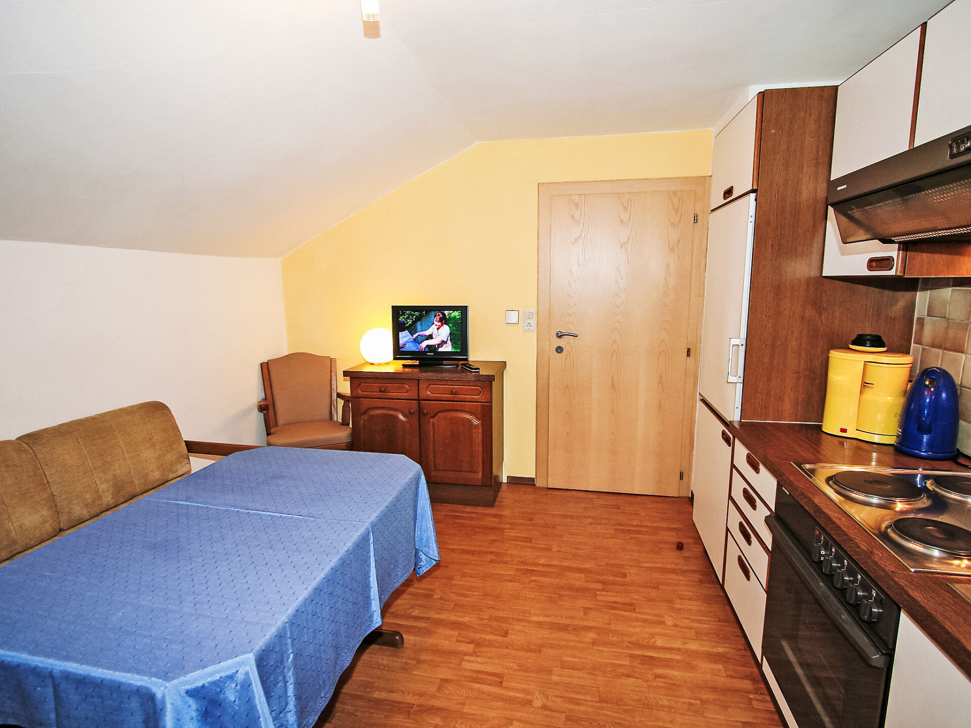 Appartement 3-kamers 50 m2, op de bovenste verdieping. Gezellig ingericht: hal. 1 2-pers. kamer. Uitgang naar het balkon. 1 2-pers. kamer. Woonkeuken (4-pits kookplaat, oven, afwasmachine, waterkoker, diepvriezer, elektrische koffiemachine) met eethoek en Sat-TV (Flatscreen TV). Uitgang naar het balkon. Douche, aparte WC. 2 balkons. Terrasmeubelen. Mooi uitzicht op de bergen en de plaats. Ter beschikking: Internet (Internet (WiFi), extra). Rookmelders.