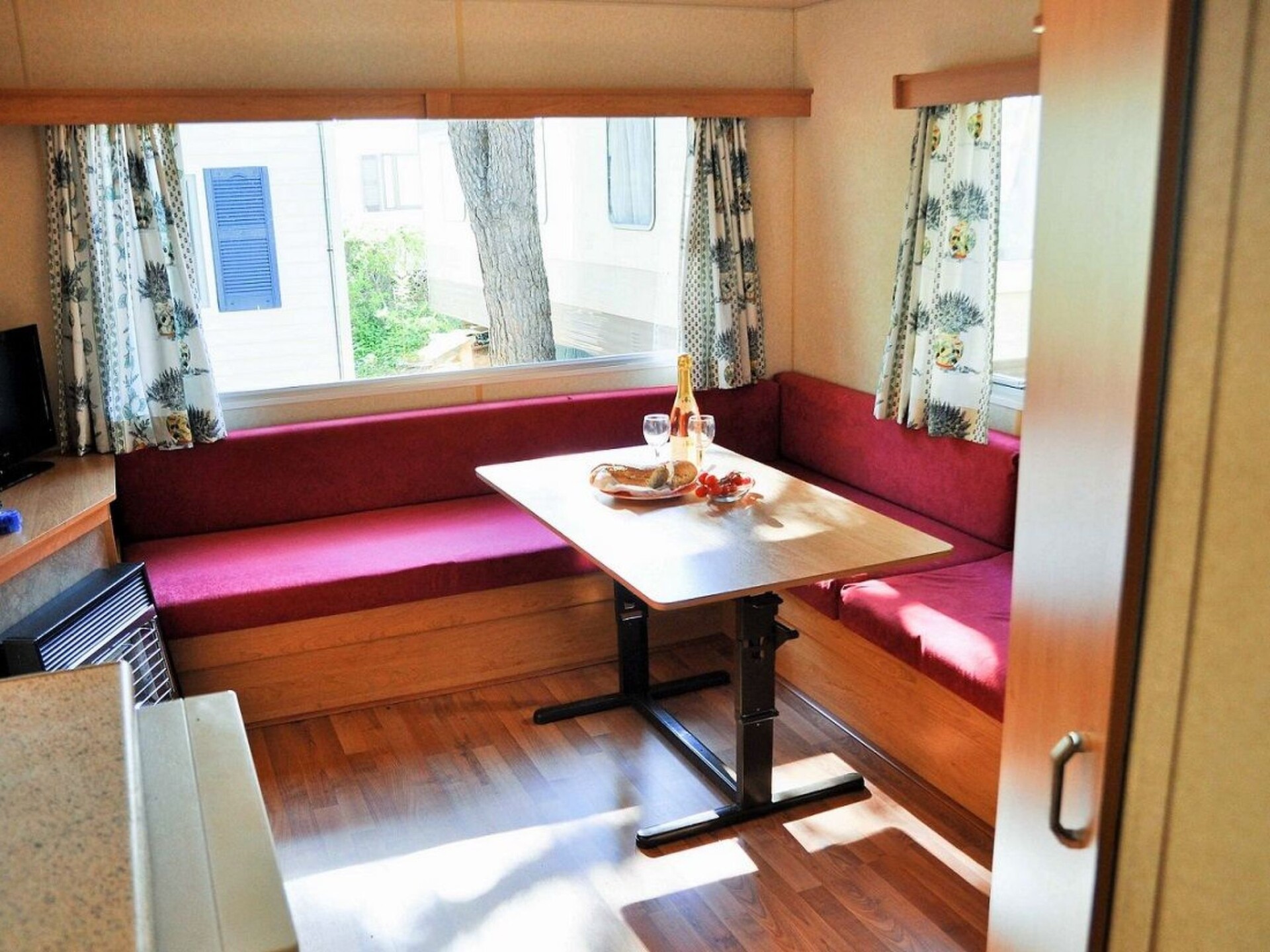 Buiten kunt u genieten van de grote overdekte veranda met een comfortabele loungeset, ideaal om te ontspannen en te dineren in de open lucht. De caravans bieden ook ruime plekken, deels beschut door de karakteristieke kurkeiken, waar uw auto naast de accommodatie geparkeerd kan worden. De camping zelf ademt een mediterrane sfeer uit, met bloeiende oleanders in de zomer en een omringend landschap dat roept om ontdekt te worden.