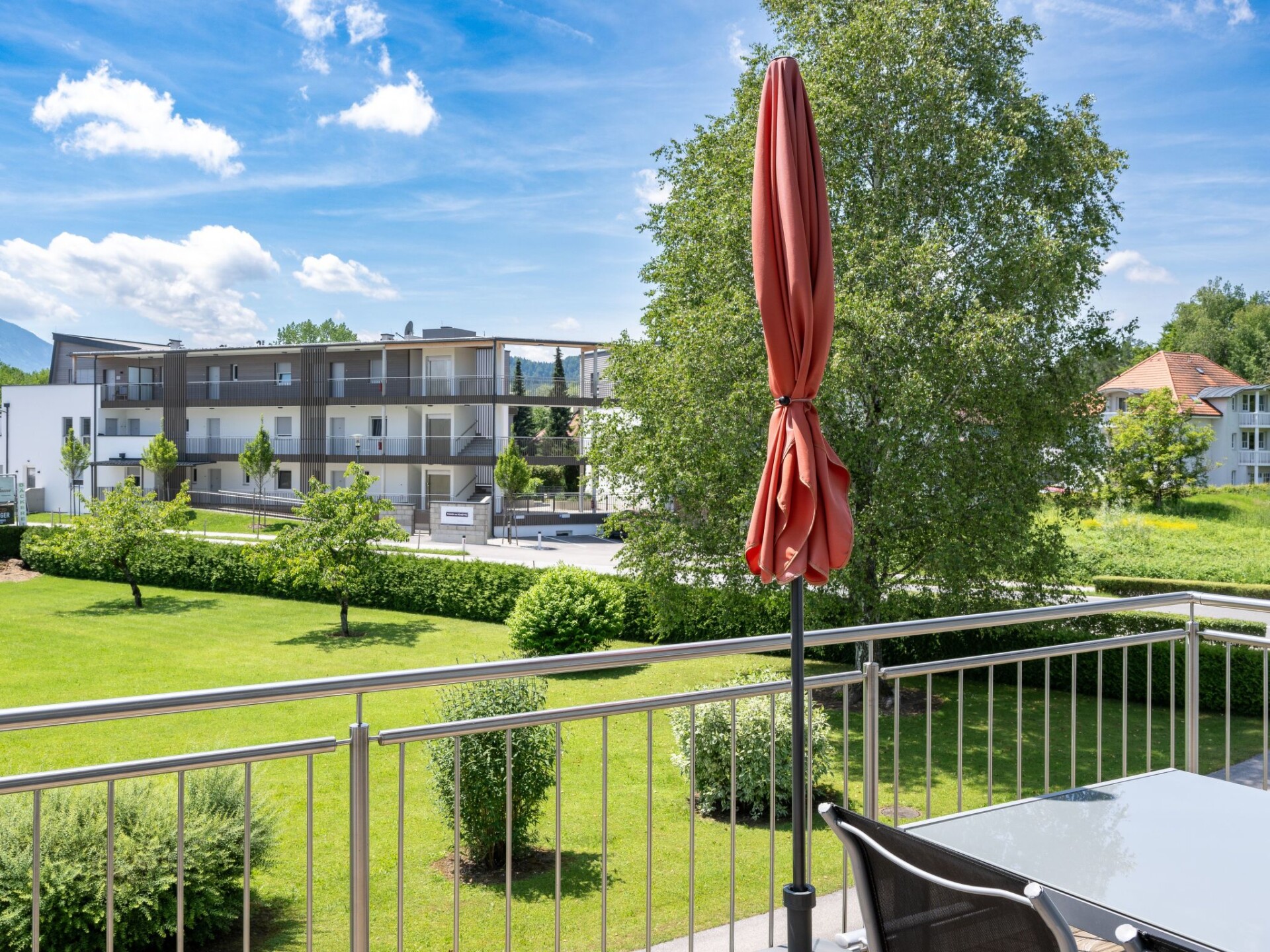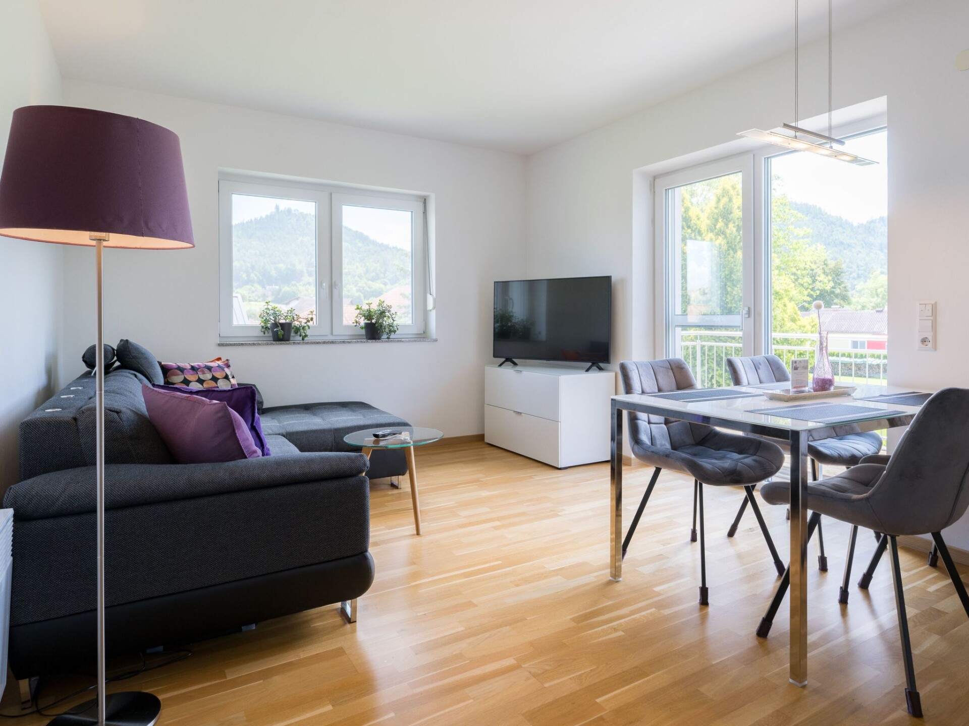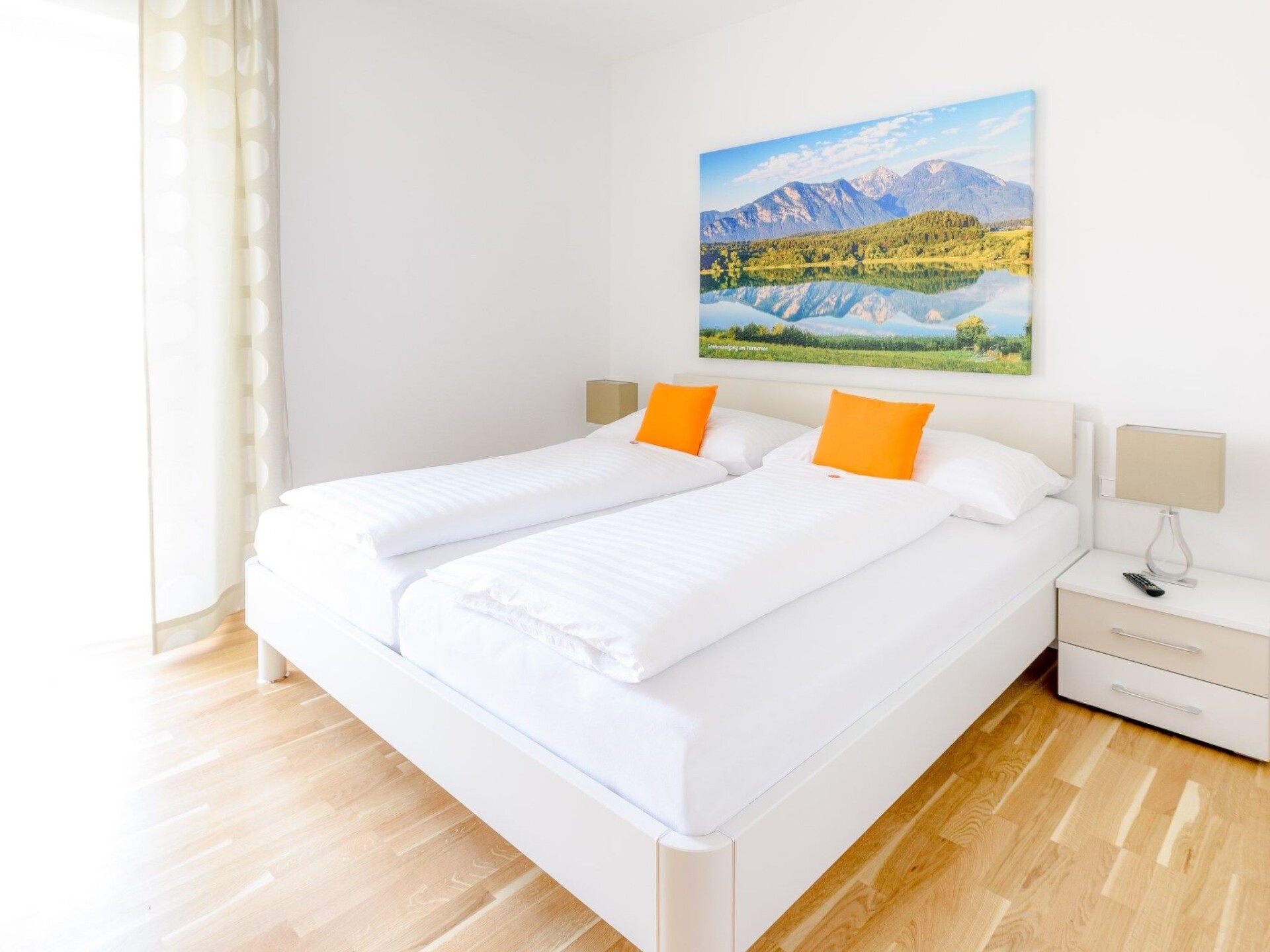 Maximaal 2 huisdieren/honden toegestaan. This holiday apartment is among the newest apartments in the area and provides 60m² of living space. Owing to being situated on the first floor, it affords an extensive view through the windows and of course also the balconies. The apartment comprises two double bedrooms, a daylight shower room with a WC and an open living room-kitchen with a cosy lounge area. You step through the front door and on the left side there are the bathroom and the bedrooms. On the right side there is the open living and dining room with a kitchen space and access to the balcony. The second balcony is accessed from the bedroom. The two bedrooms are opposite each other and share a balcony. Each bedroom is furnished with a generous double bed (180 x 200cm) with bedside tables and reading lamps on either side, as well as a spacious wardrobe for storing your clothing. The centrepiece of the apartment has a central dining table with chairs for meals together. There is an amply equipped corner kitchen for convenient self-catering, which provides everything you need. After a day trip you can relax on the leather corner sofa, with a large flatscreen TV providing entertainment in the evening. This pull-out sofa can be used as a bed for a fifth and sixth guest. The bathroom is fitted with a WC, a glass shower cubicle, a washbasin with an illuminated mirror, a makeup mirror, a window and a towel radiator.