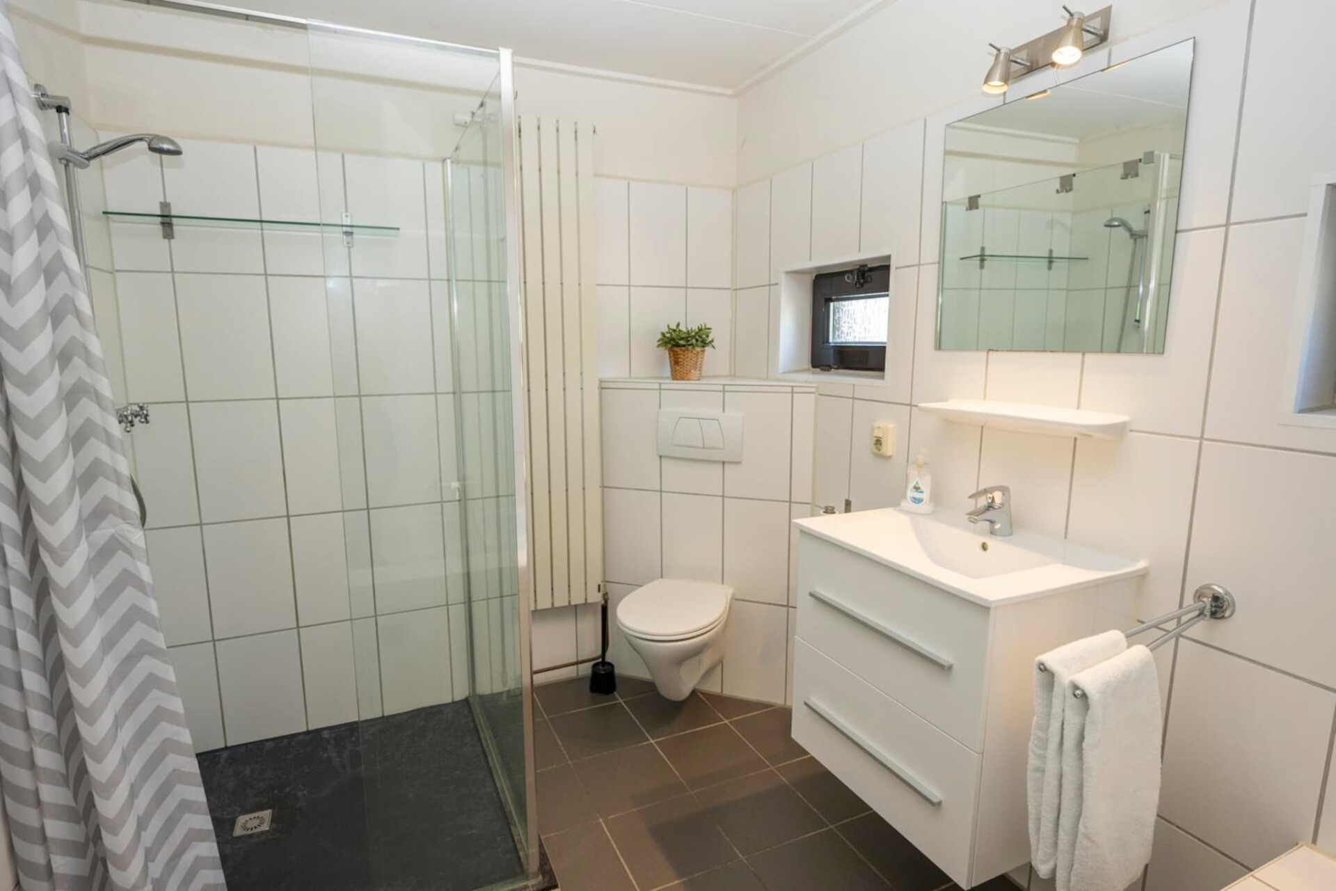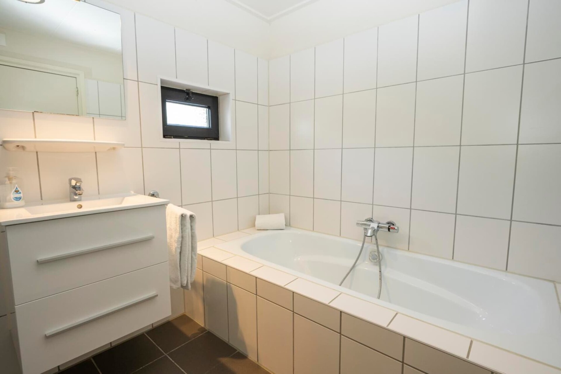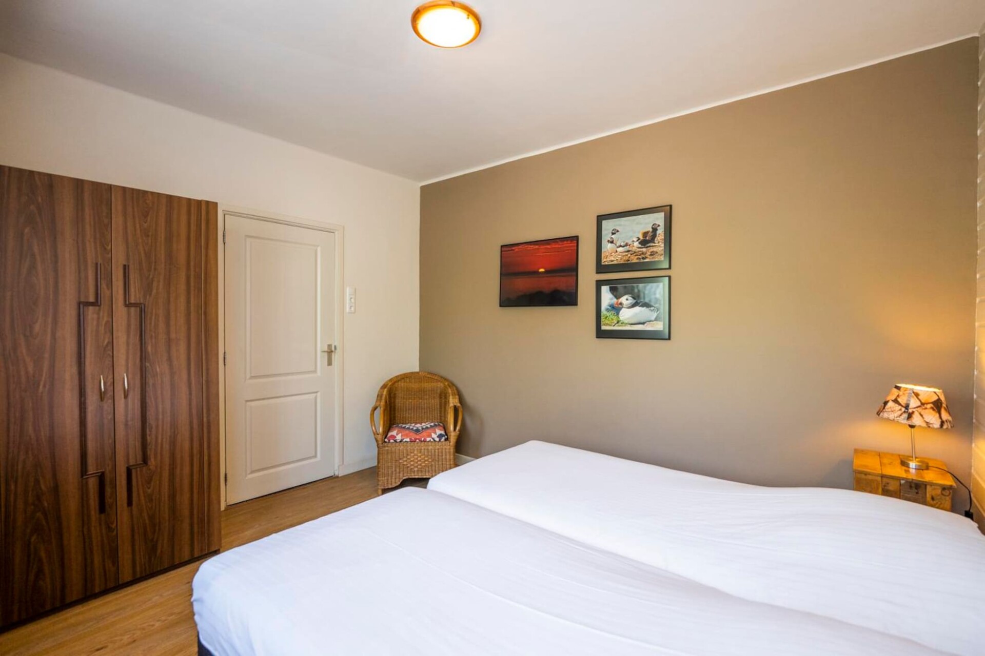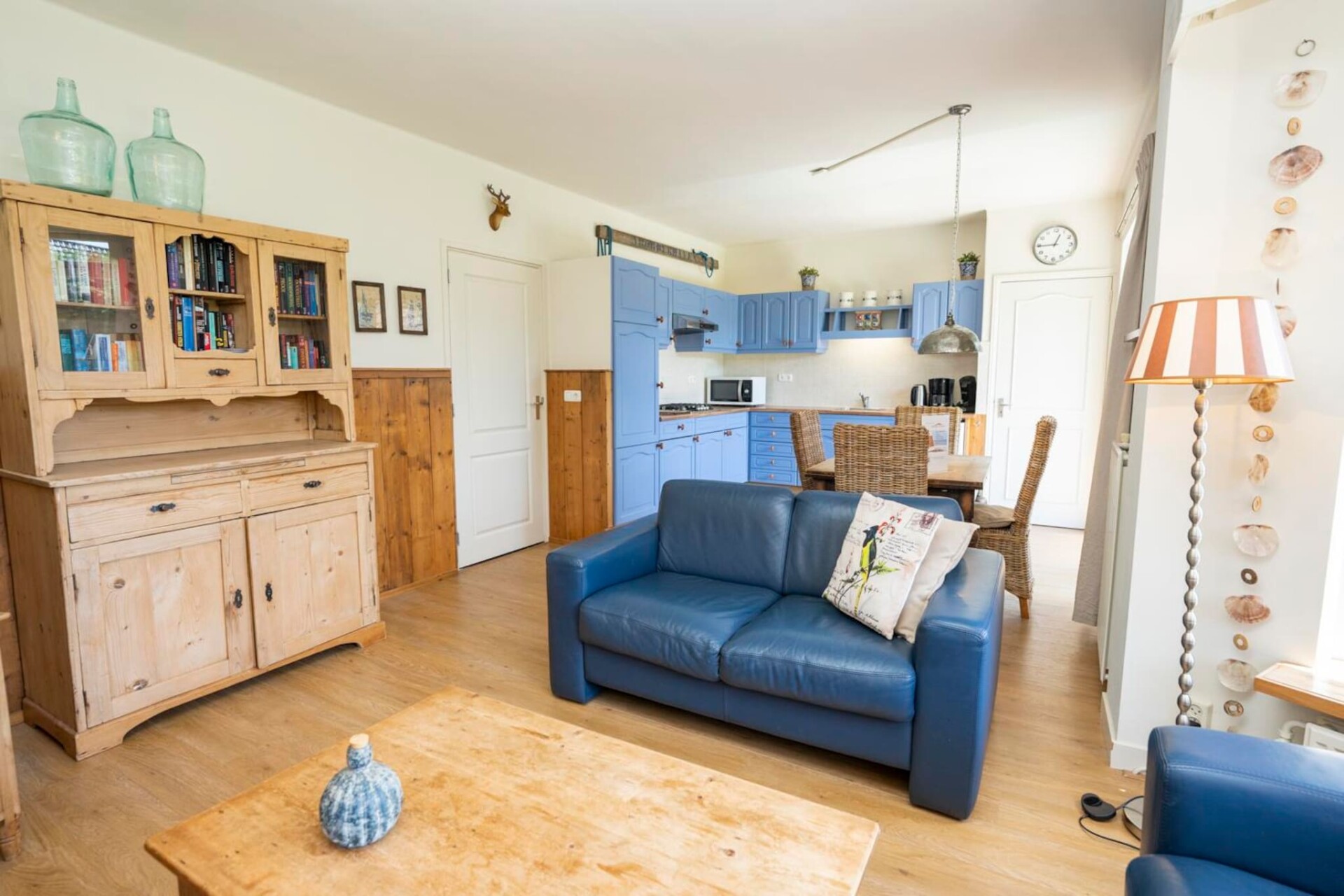 De ruime woonkamer is voorzien van een gezellige zithoek en een eettafel, waardoor het een perfecte omgeving is om te ontspannen of samen te eten. De open keuken is volledig uitgerust met een vaatwasser, koelkast en een combimagnetron, waardoor maaltijden bereiden gemakkelijk is. Het appartement heeft twee slaapkamers: één met twee eenpersoonsbedden en de andere met een stapelbed, ideaal voor gezinnen of vrienden. De badkamer is voorzien van een inloopdouche en toilet, en gasten kunnen gebruikmaken van de gedeelde wasmachine en droger voor extra gemak. Buiten kunt u genieten van het zonnige terras op het zuiden, ideaal om buiten te eten en te loungen in de frisse zeelucht.