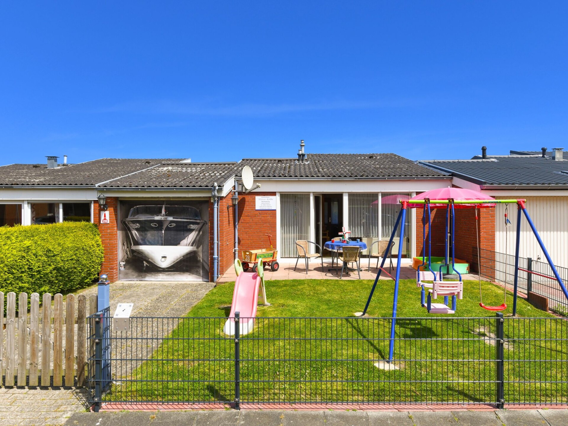 My holiday home "Weisse Robbe" is situated on a plot of approx. 200 square metres on the outskirts of the North Sea spa town of Bensersiel in an absolutely quiet location. No through traffic. The beach and the sea can be reached on foot in approx. 5 minutes, as can the centre of Bensersiel.When the weather is nice, you should definitely use the amenities of our terrace (garden furniture and barbecue available), while the children can enjoy our play facilities (children's slide, swing, sandpit and climbing frame). A handcart is also available free of charge. You can simply park your car in or in front of the garage.The 55 square metres of living space are divided into a living room, a bedroom with two beds and another bedroom with bunk beds. A cot, high chair and changing table are available free of charge. In the fitted kitchen you will find the usual crockery (pots and pans, coffee and dinner service, cutlery, etc.) as well as a coffee machine, toaster and egg cooker. You can prepare your meals on a 4-ring hob. A microwave and a separate kettle are also at your disposal. Television with satellite connection, BluRay player and a stereo system are a matter of course. A selection of DVDs and our games collection will help you to make your holiday entertaining. Free W-Lan is also available. Bed linen, hand and bath towels are provided free of charge. In the bathroom you will find a toilet, a shower and a washing machine with tumble dryer.The nearby North Sea invites you for a swim or a mudflat hike. On the sandy beach you can simply lie down and relax or build a sandcastle with your children. Long walks on the dyke also have their charm. How about a cycle tour through the flat East Frisian countryside. Bikes can be hired approx. 200 metres from the house. The indoor playground Klabautermann in Esens - 4 km away - offers a special experience for young and old.If it rains, simply visit the "Sonneninsel" adventure pool or the Vital-Aktiv Centre, which are only a 3-minute walk away, and your children are sure to enjoy themselves in Bennis Abenteuerland, the kibi-Ferientreff or the adventure playground right on the beach. There is something for all ages.NOTE:Please allow at least 3 days between booking and arrival. I would like to be able to maintain the quality standard I have set myself in your case.