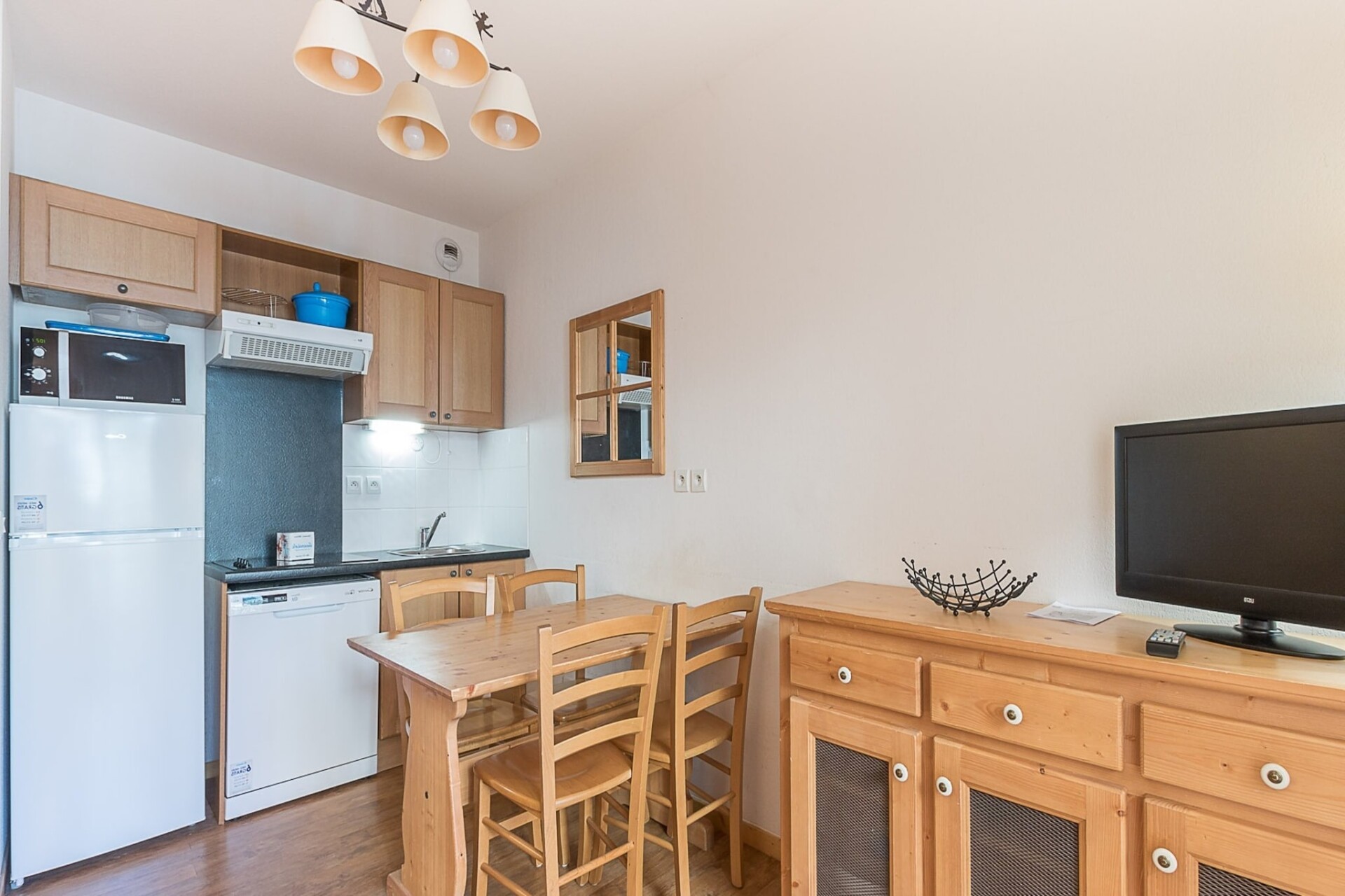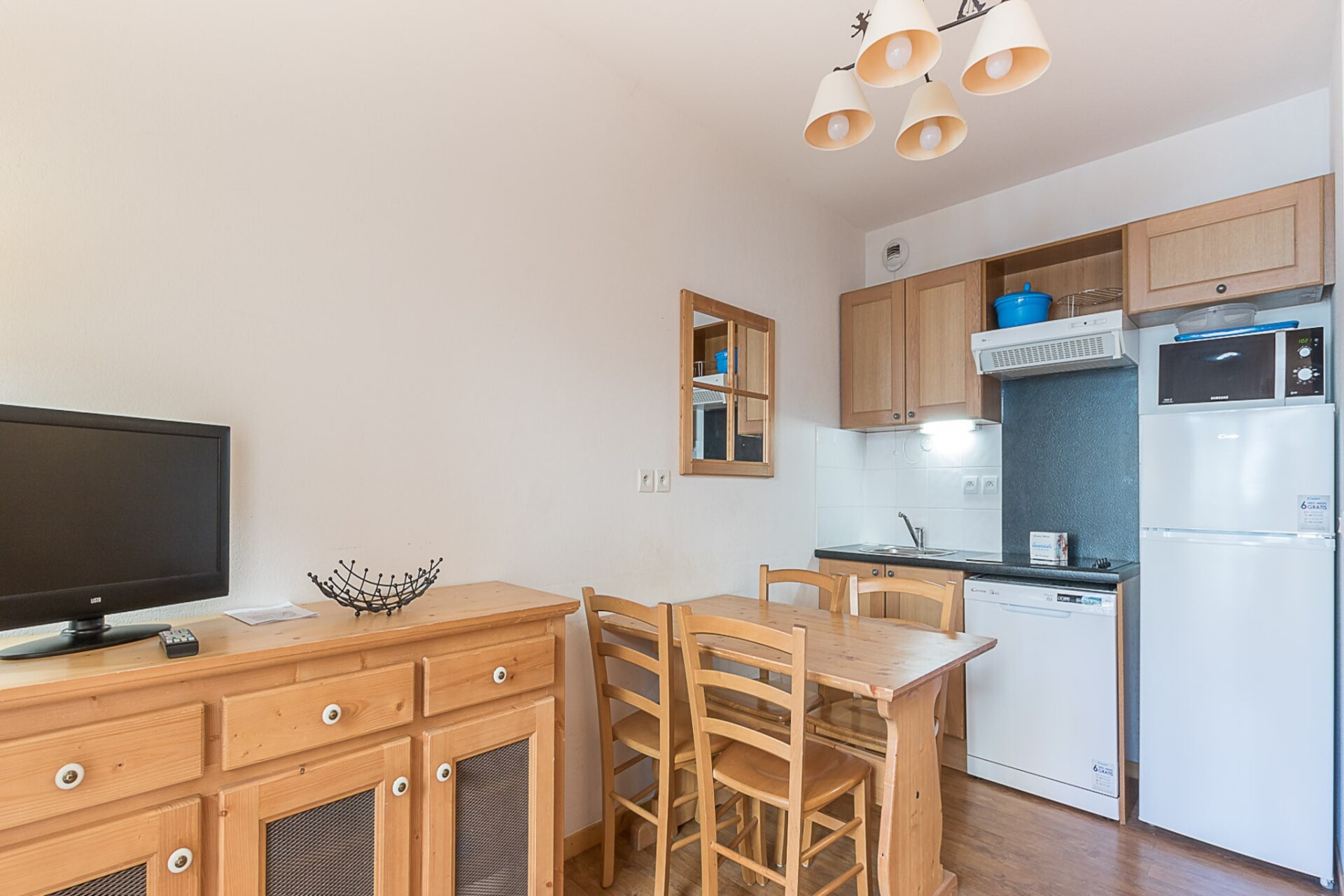 Het appartement is zorgvuldig ontworpen met een volledig uitgeruste keuken met een keramische kookplaat, koelkast, magnetron, vriezer, vaatwasser, koffiezetapparaat en broodrooster, perfect voor het bereiden van maaltijden. De gezellige badkamer is uitgerust met alle essentiële voorzieningen om een comfortabel verblijf te garanderen. Een privébalkon biedt een rustige ruimte om te genieten van het uitzicht op de bergen, waardoor dit appartement een perfect toevluchtsoord is na een dag vol avontuur.
