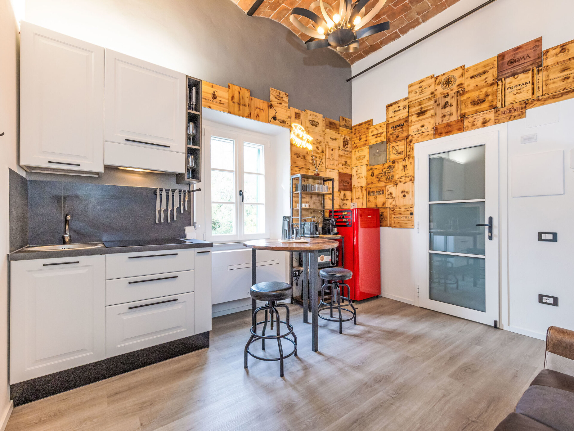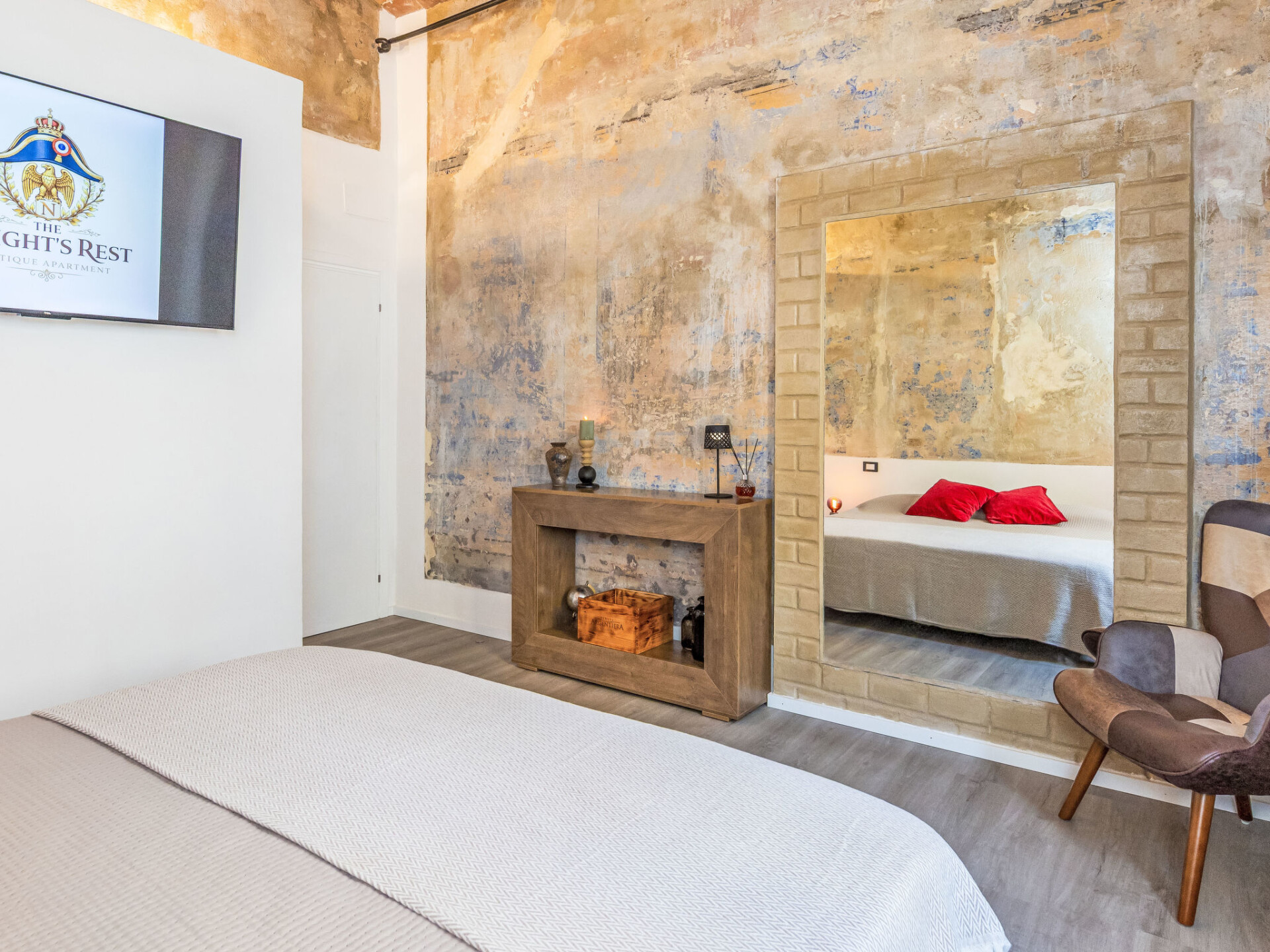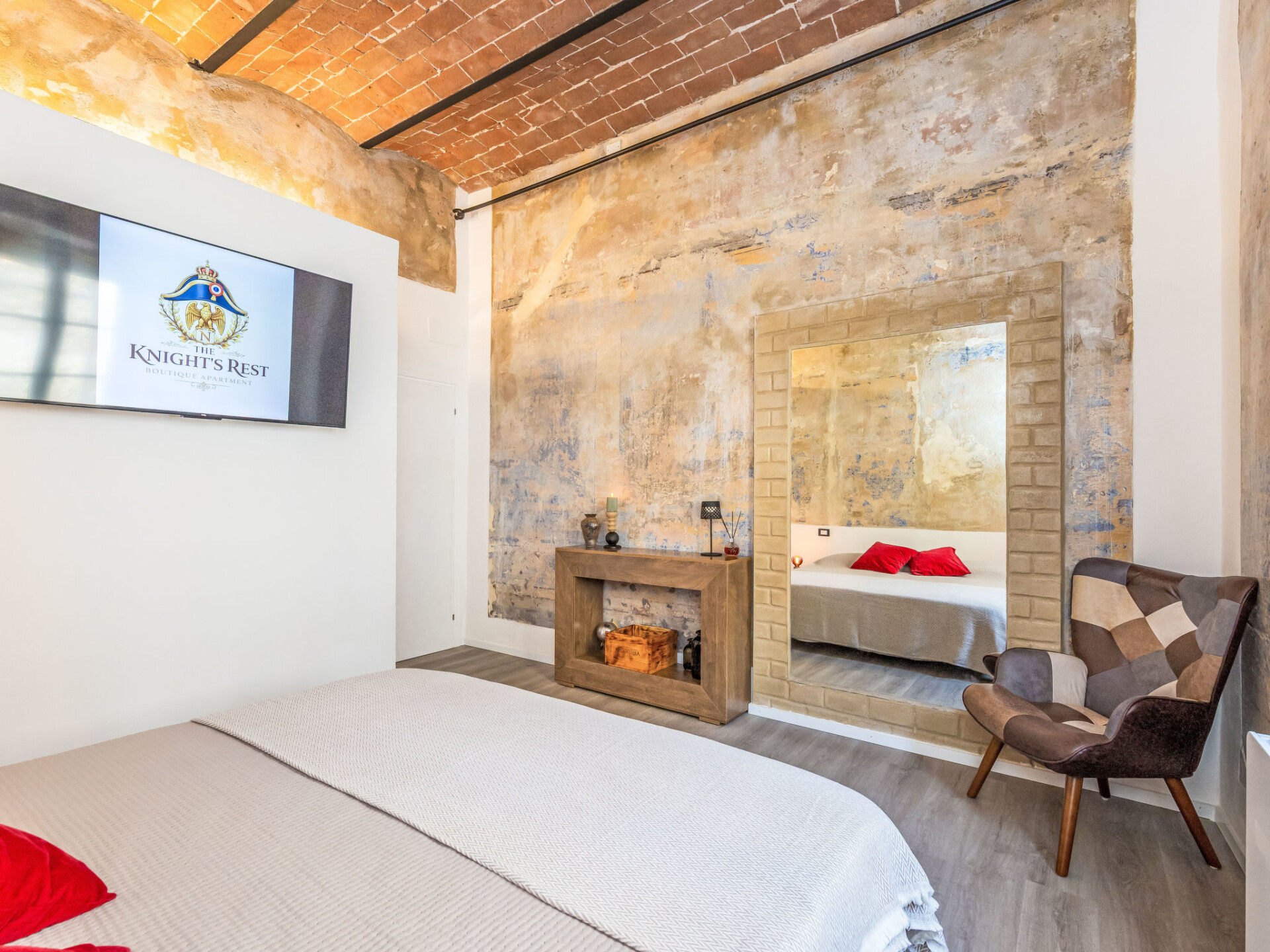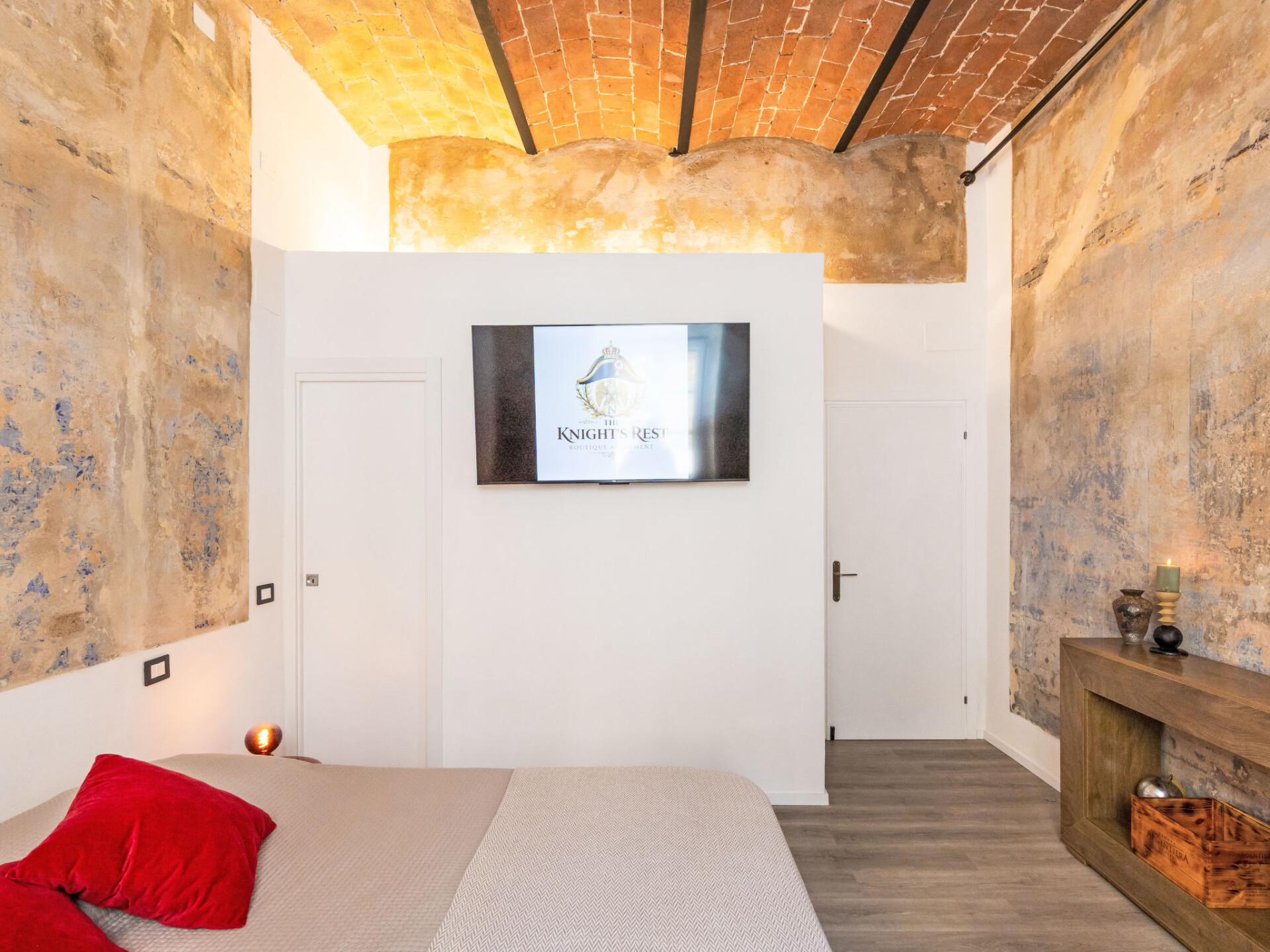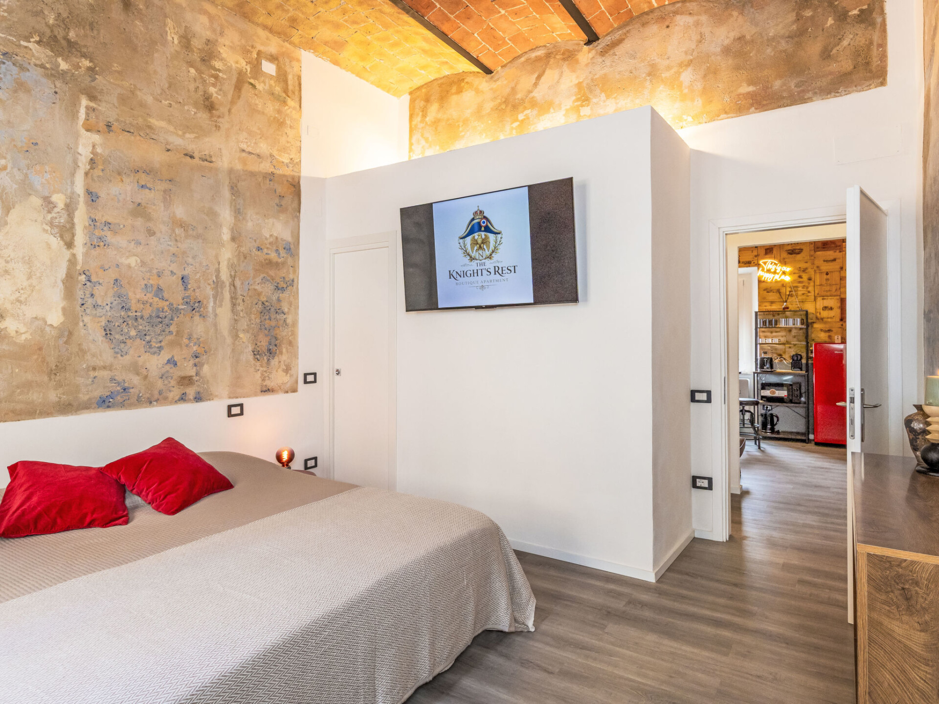 "The Knight’s Rest", appartement 2-kamers 35 m2 op de 1e verdieping. Ruim en licht, comfortabel en smaakvol ingericht: Bovenverdieping: (steile trap) woon-/eetkamer met eettafel. 1 2-pers. kamer met 1 2-pers bed (180 cm, lengte 200 cm). Open keuken (oven, 4 inductiekookplaten, broodrooster, waterkoker, magnetron, elektrische koffiemachine). Douche/bidet/WC. Elektrische verwarming, air-conditioning. Ter beschikking: wasmachine, strijkijzer, kinderbed tot 2 jaar, haardroger. Internet (WiFi, gratis). Brandblusser. IT049001C22O2D2G7I
