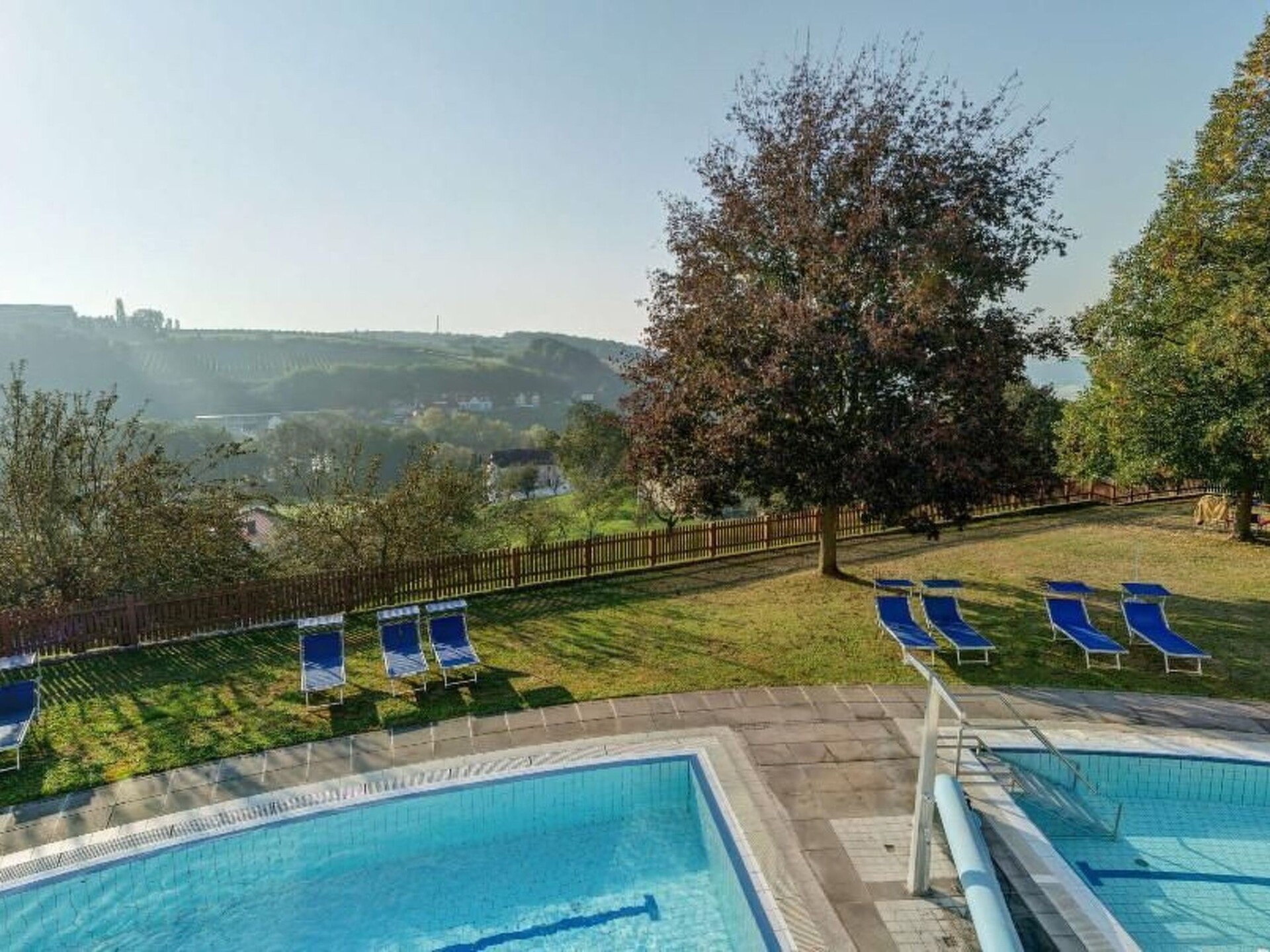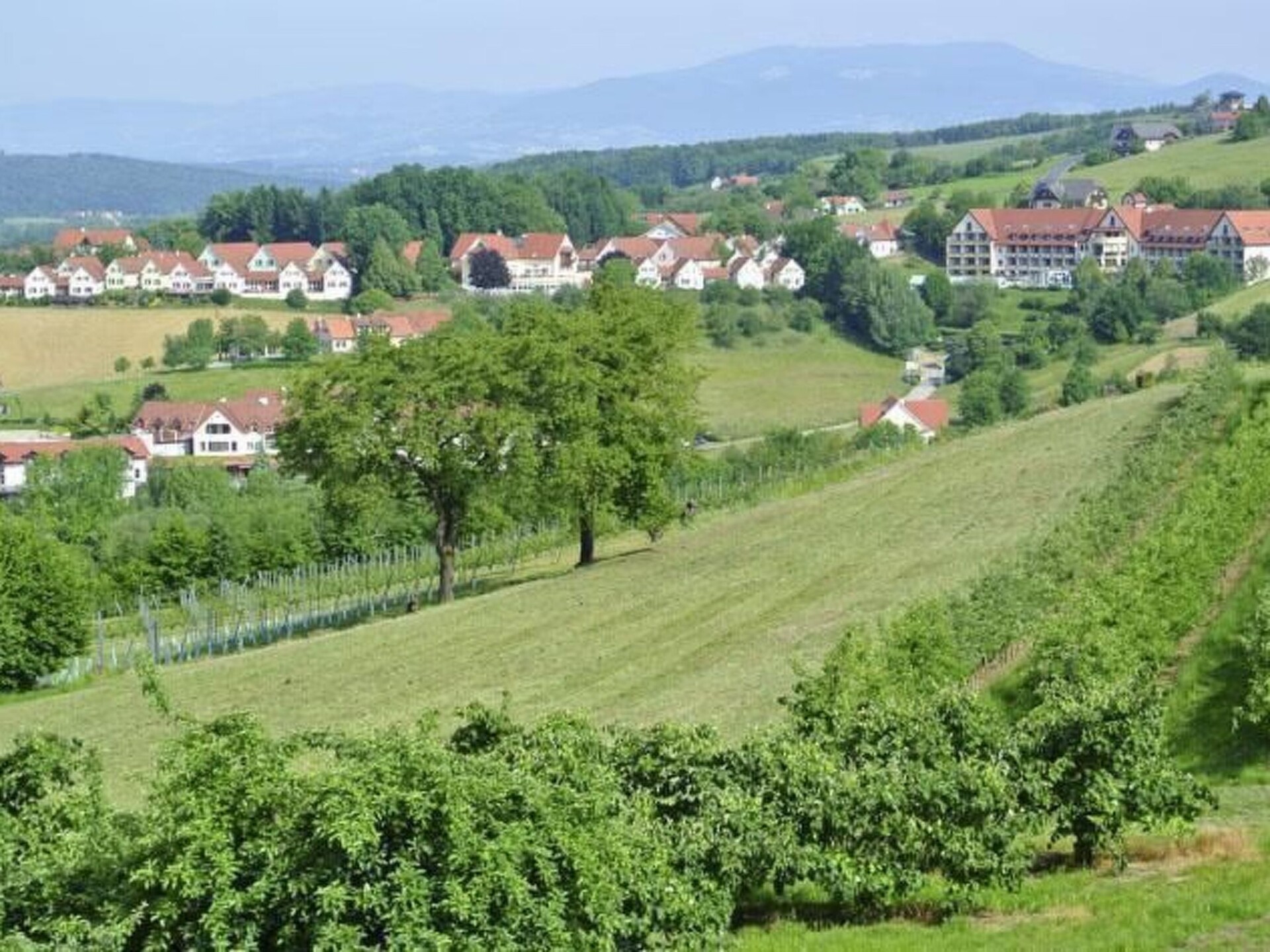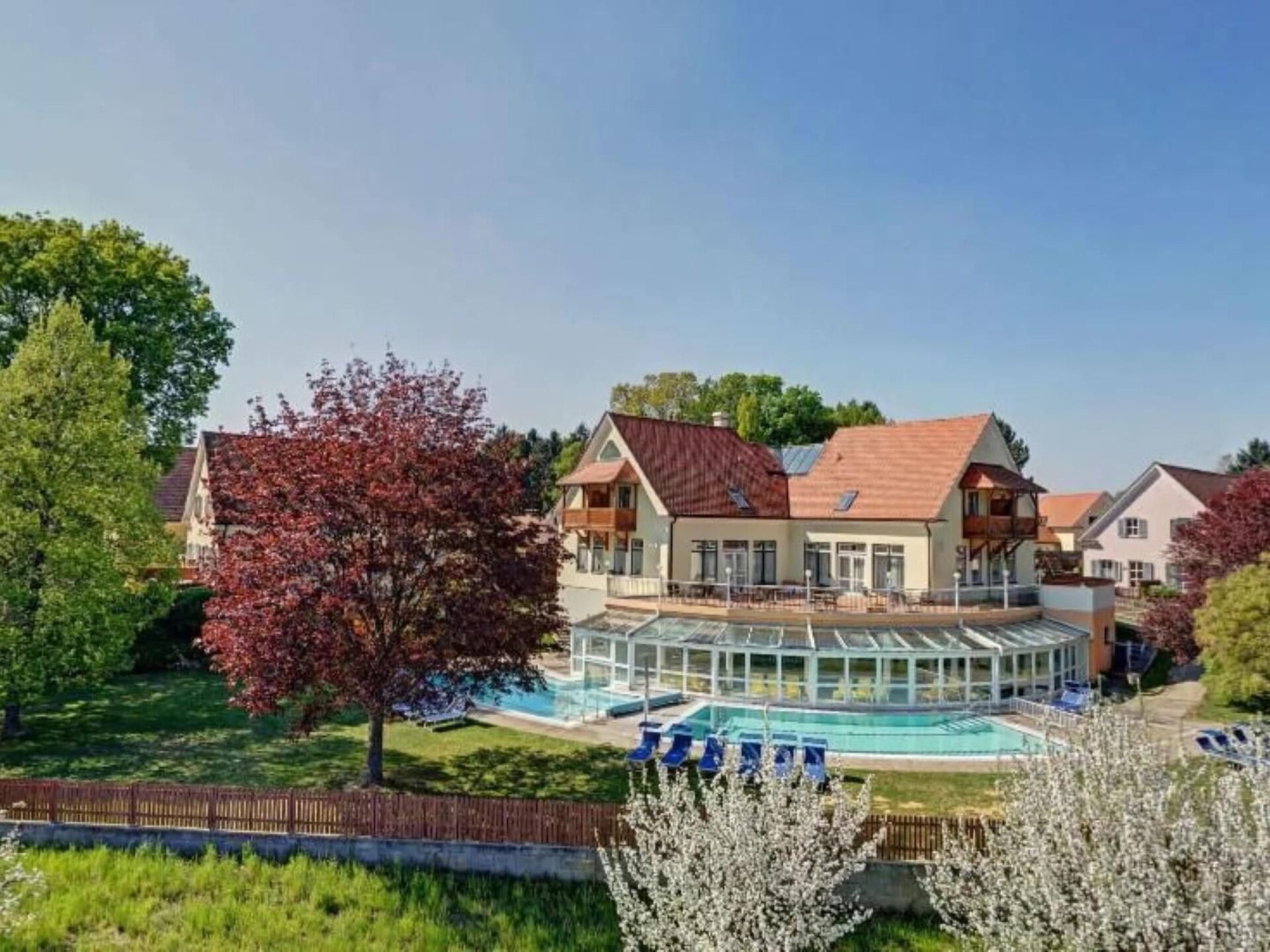 Experience pure relaxation and recreation in our charming flat, nestled in a quiet, traffic-free holiday village above the idyllic village of Bad Waltersdorf. Specially designed for up to four adults and one child, this holiday flat offers the perfect retreat for your holiday in the Styrian thermal spa region. With its own swimming and wellness area, you can enjoy an exclusive experience all year round - including access to the thermal spa, the year-round indoor pool and, depending on the season, the thermal panorama pool and sports pool.Inside, the flat awaits you with well thought-out furnishings: the living room/bedroom on the ground floor, with a pull-out double sofa bed and underfloor heating, gives the room a warm, inviting atmosphere. A well-equipped kitchenette, including cooker, fridge and small oven, allows you to prepare small meals. Upstairs you will find a cosy bedroom with TV, a fully equipped bathroom and additional amenities such as bed linen, towels, cable TV and free Wi-Fi to make your stay comfortable.Outdoor area: Enjoy private moments of relaxation on the 15m² terrace, equipped with awning, loungers and umbrella, which offers the perfect place to unwind. As a guest, you also have access to exclusive inclusive services such as use of the thermal and saltwater pool, various saunas and fitness facilities at the hotel.Surrounded by the picturesque Styrian thermal spa region, the flat is in an ideal location for nature and sports lovers. With 140 km of signposted cycle paths and 200 km of marked hiking trails through vineyards and orchards, the surrounding area is ideal for active exploration. Take advantage of the proximity to golf courses, tennis and squash facilities or discover local attractions such as the Schloss Herberstein zoo and the Hartberg vintage car museum. Various catering options and the proximity to typical Styrian inns provide culinary highlights during your stay.Leave the stress of everyday life behind you and immerse yourself in the soothing world of the Styrian thermal spa region. Our flat not only offers you a comfortable interior and an inviting outdoor area, but also direct access to a comprehensive range of wellness and activity programmes. Look forward to unforgettable holiday moments, supported by therapeutic thermal water, in the midst of the picturesque East Styrian landscape. A truly healing time-out awaits you!