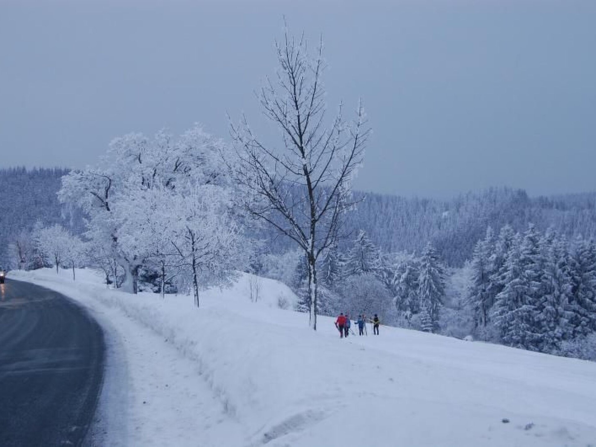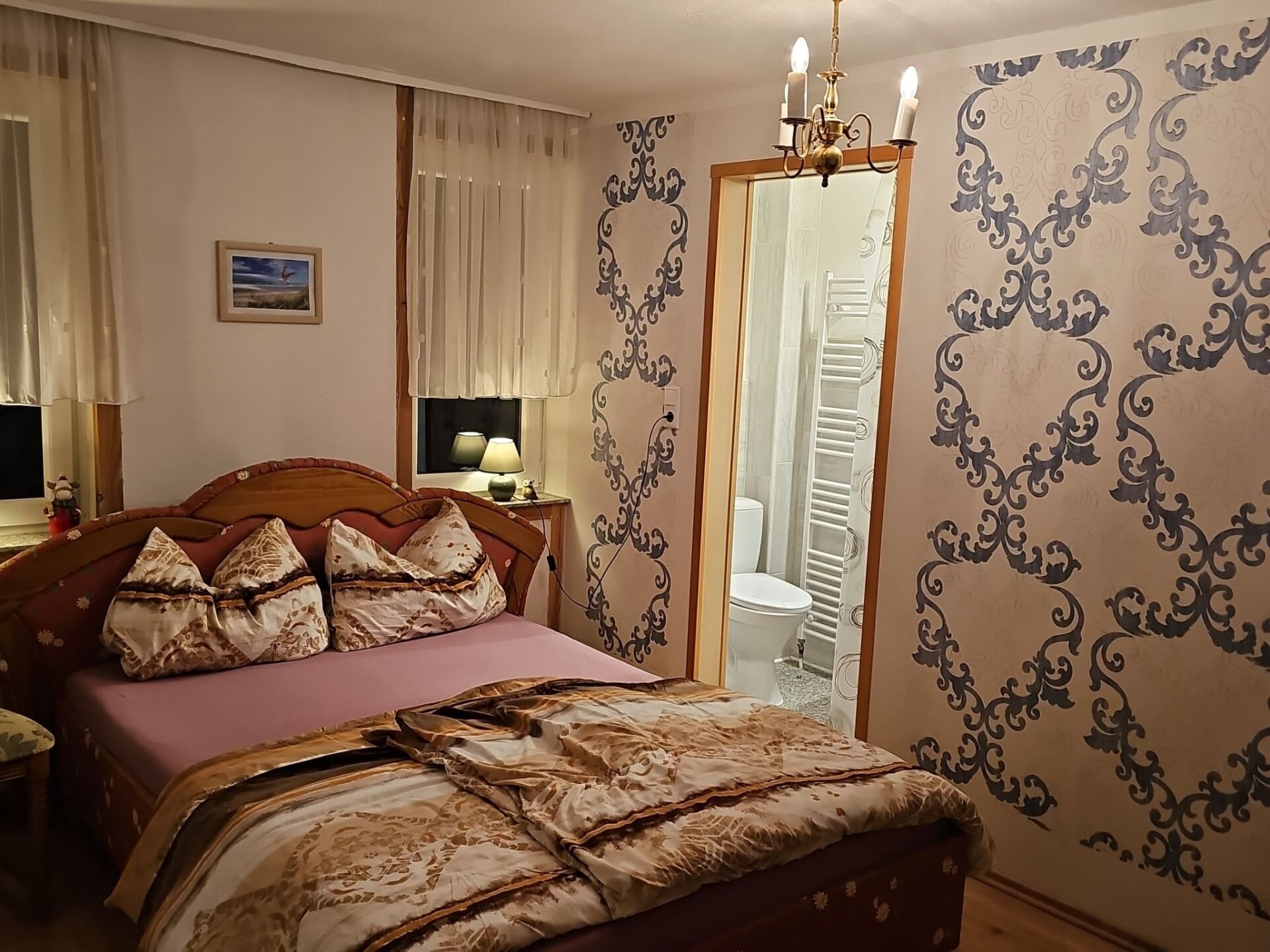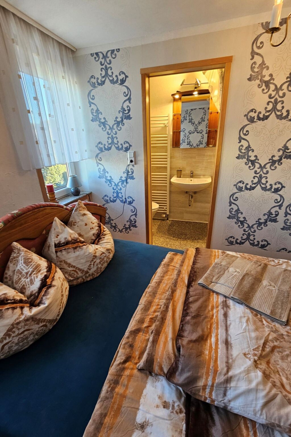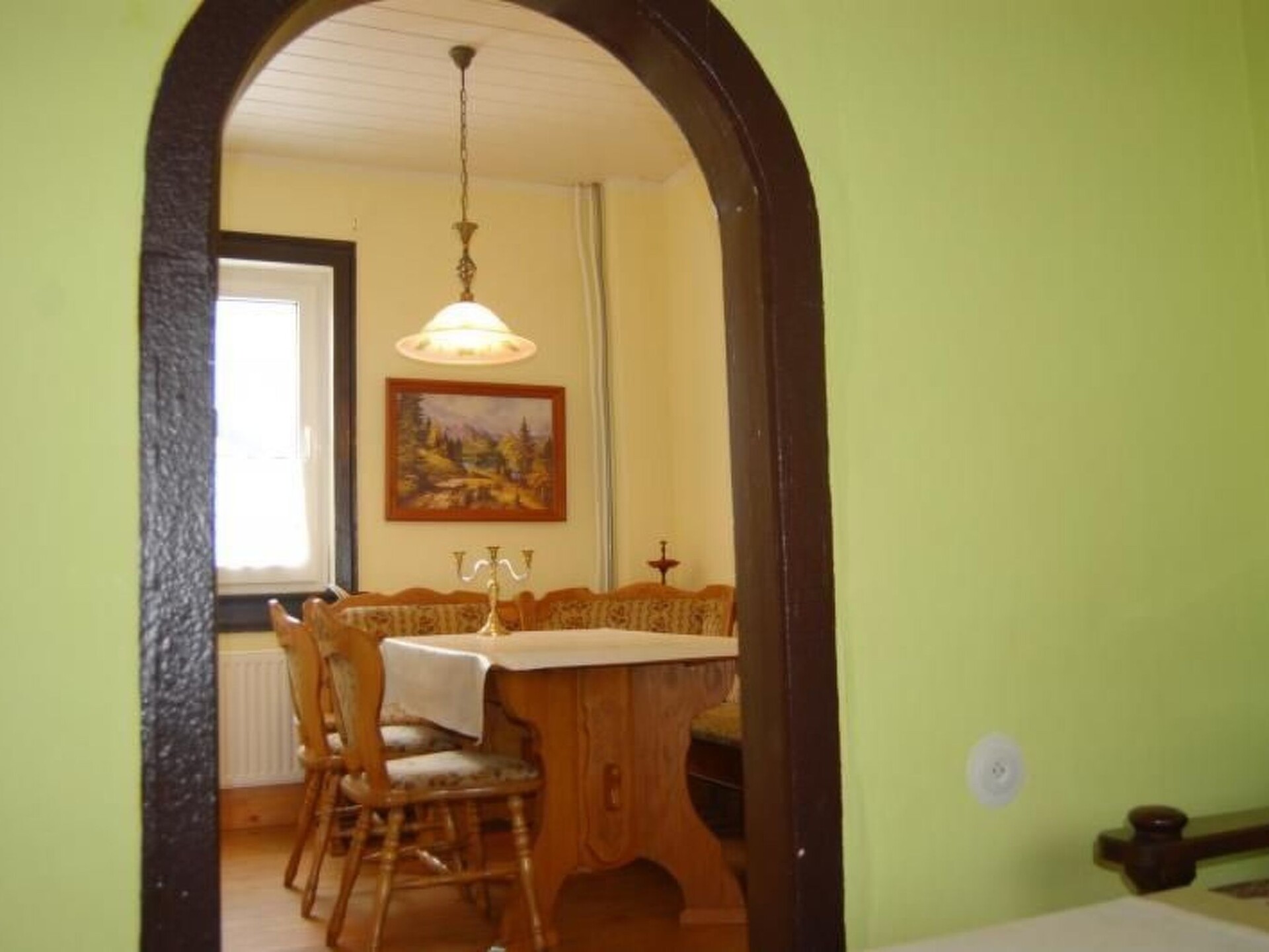 The Thuringian country house Gehlberg am Schneekopf with comfortable holiday flats and a unique mountain panorama is located on the Thuringian Forest nature park route not far from the Rennsteig trail on the Schneekopf, the Goethe hiking trail and the holiday resorts of Oberhof and Ilmenau. The outdoor area includes a garden seating area and patio furniture. A garden with barbecue area (fenced) is available for shared use. In the house: central heating. The car park is on the property next to the house. The house can accommodate up to eight people on 110 m² and is romantically furnished. Guests have two living rooms with cable TV and a stereo system at their disposal. There is also a bathroom, a fully equipped kitchen with cooker, microwave, coffee machine, kettle and fridge. The bathroom has a separate shower, a WC and a large washbasin. It is heated by central heating. There are four bedrooms in total. All bedrooms have double beds. There is a shop 300 metres away, a restaurant and bus stop 400 metres away, an outdoor pool 700 metres away, an indoor pool ten kilometres away and a cross-country ski trail 75 kilometres away. With the spa card you can use buses in the Rennsteig region free of charge and enjoy access to a private sauna. The house has a separate entrance.