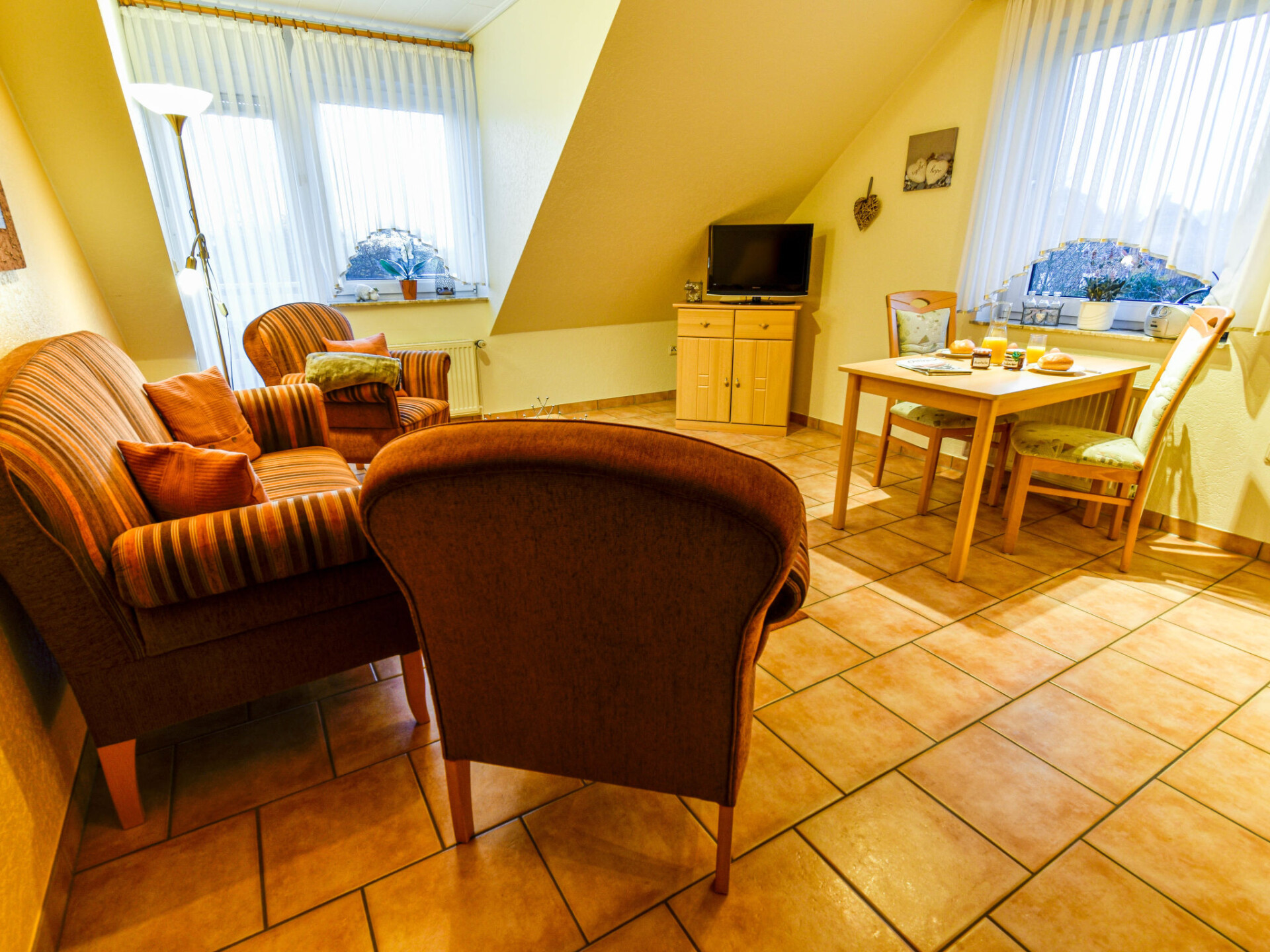 Appartement 2-kamers 40 m2, op de bovenverdieping. Woon-/eetkamer 18 m2, met afgeschuinde daken met Kabel-TV (Flatscreen TV), radio. Uitgang naar het balkon. 1 kamer 12 m2, met afgeschuinde daken met 1 2-pers bed (2 x 90 cm, lengte 200 cm). Kookhoek (4-pits kookplaat, oven, afwasmachine, broodrooster, waterkoker, magnetron, elektrische koffiemachine). Douche/WC. Balkon 6 m2. Balkonmeubilair. Ter beschikking: kinderstoel (extra). Internet (Internet (WiFi), gratis). Niet rokers woning. Rookmelders.