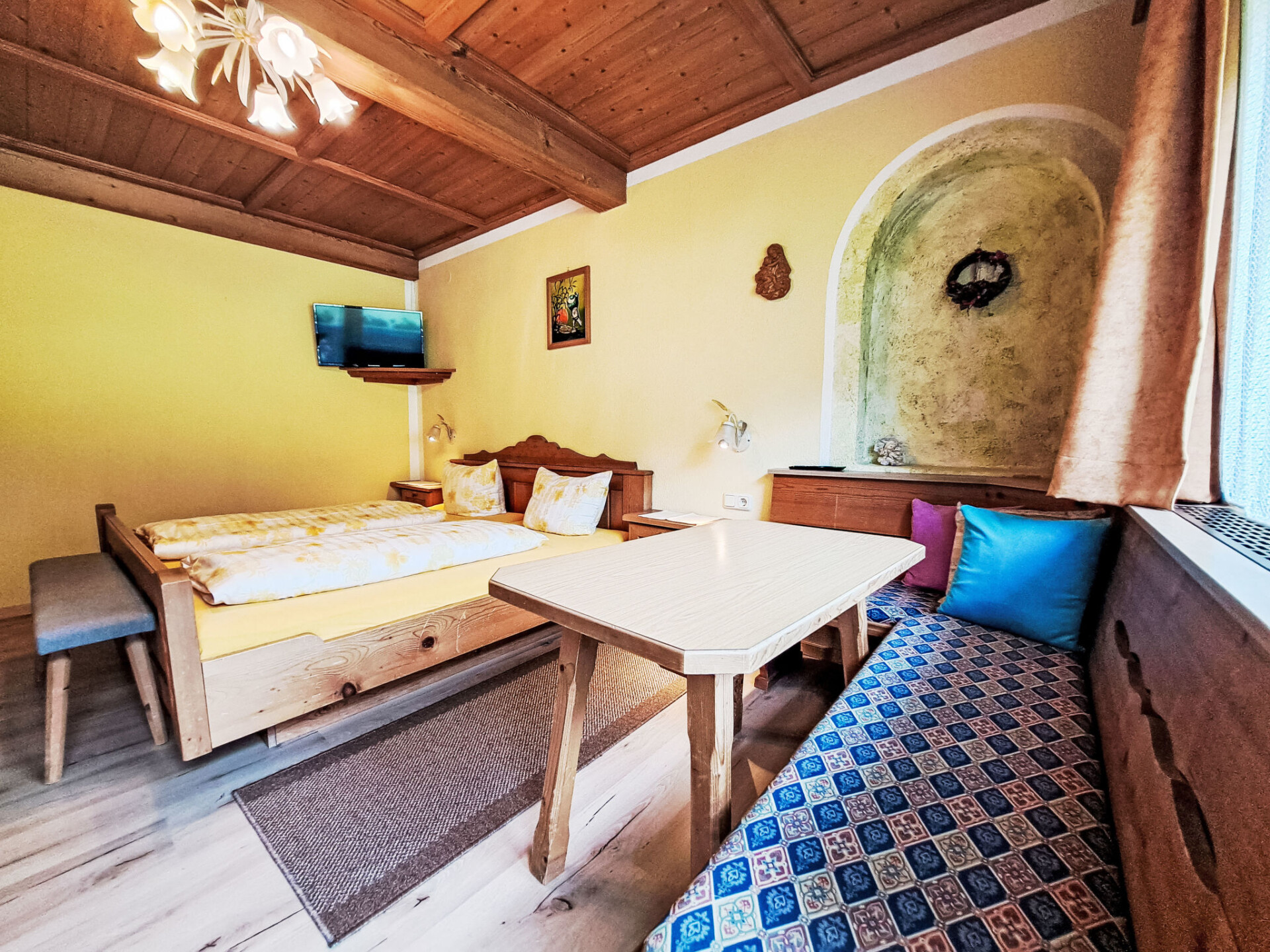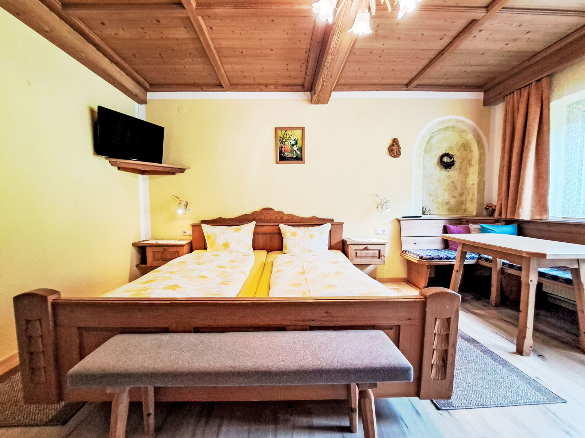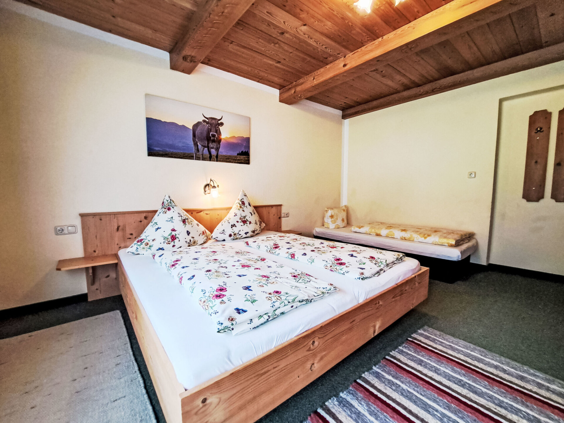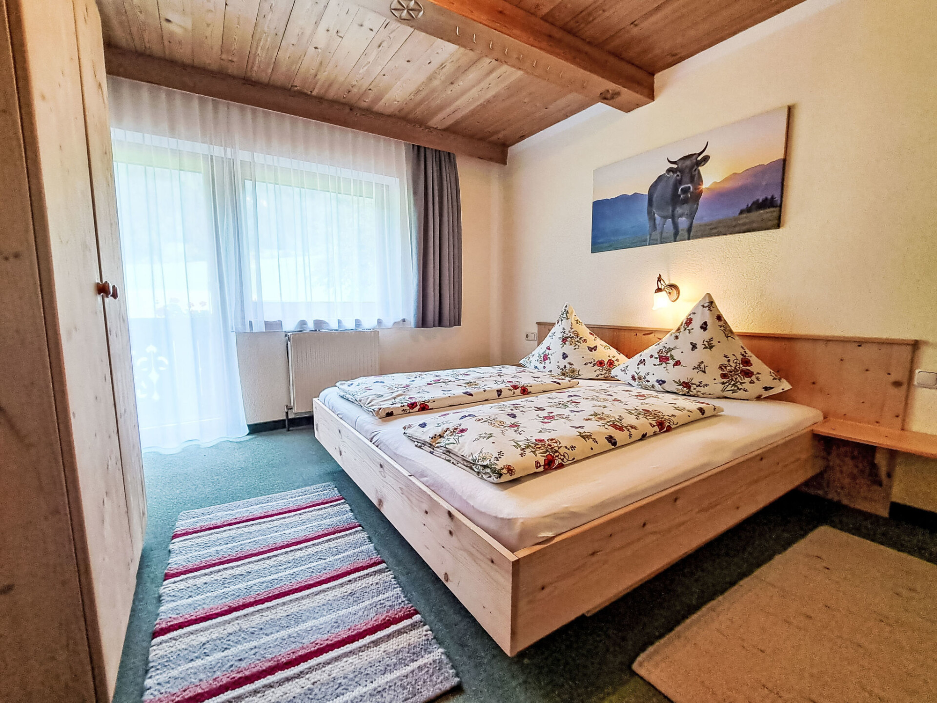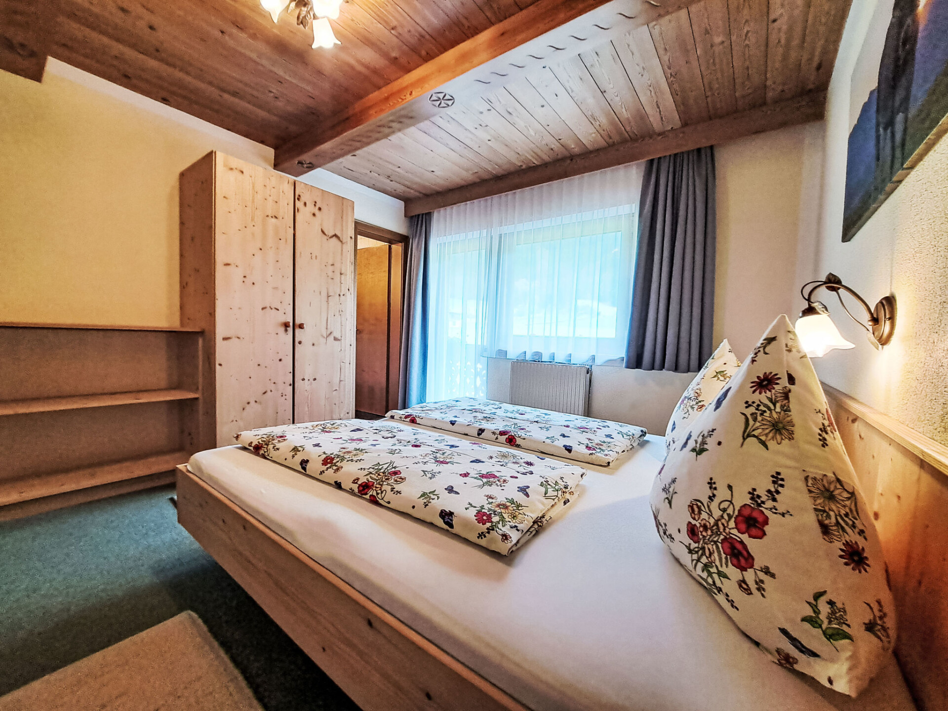 "Trojer", appartement 5-kamers 120 m2. Mooi en met veel hout ingericht: 2 2-pers. kamers, elke kamer heeft douche/WC. Uitgang naar het balkon. 1 2-pers. kamer. 1 kamer met 1 bed, 1 2-pers bed en douche/WC. Groot woonkeuken (oven, 4 keramische glas kookplaten, magnetron, diepvriezer, elektrische koffiemachine) met eettafel. Douche/WC. 2 balkons. Zeer mooi uitzicht op de bergen. Ter beschikking: kinderbed. Gratis. Niet rokers woning.