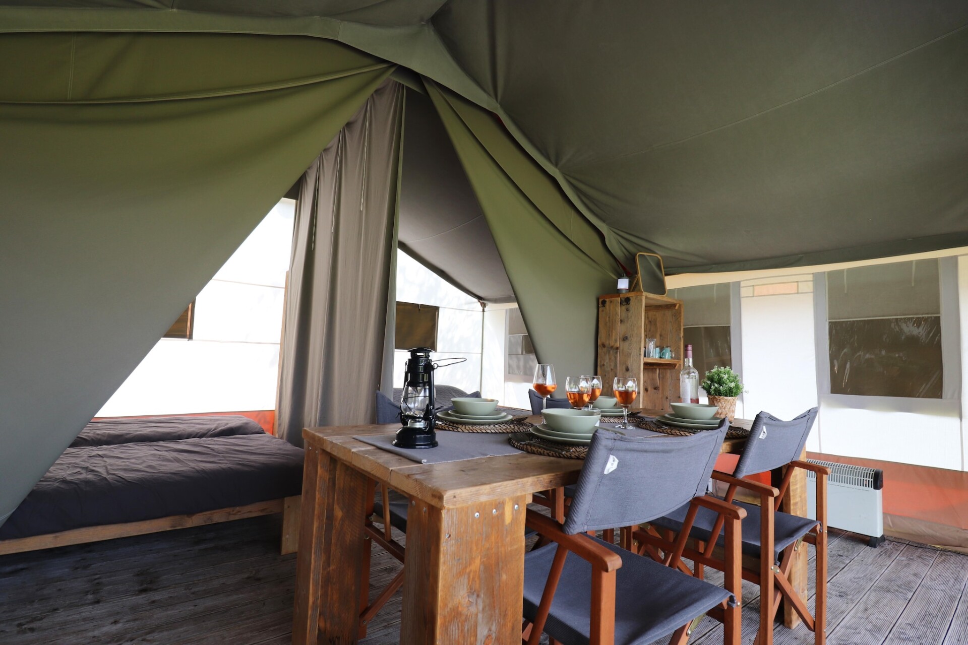 Ervaar de charme van kamperen met het comfort van een cottage in deze volledig ingerichte safaritenten, midden in de Friese natuur. De tenten staan op houten vlonders en zijn 5 x 7,5 meter groot. Ze beschikken over een knusse leefruimte, twee aparte slaapgedeeltes en stevig houten meubilair, en bieden comfortabel plaats aan maximaal 4 gasten. Het overdekte terras en de mobiele kitchenette met koelkast en 4-pits kooktoestel zorgen ervoor dat u op zonnige dagen heerlijk buiten kunt koken.