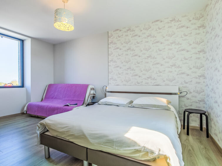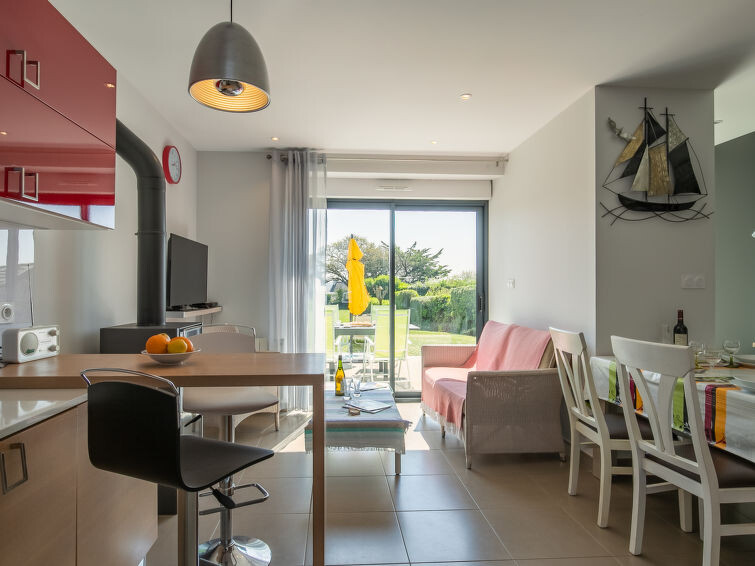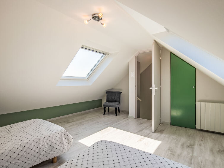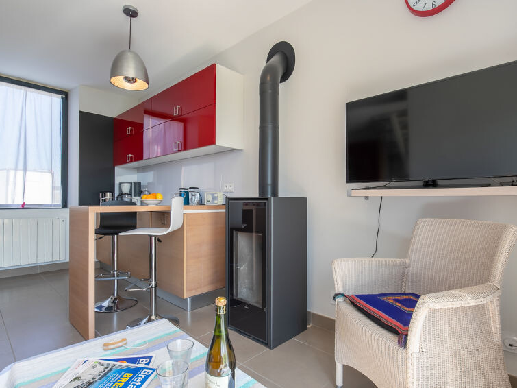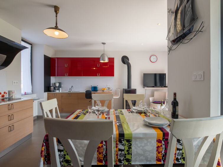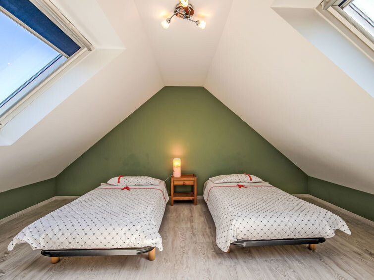 "Ty Angèle", huis 3-kamers 60 m2 op 3 verdiepingen. Licht, comfortabel en smaakvol ingericht: woon-/eetkamer met eettafel, TV, radio en houtkachel. Uitgang naar het terras. Open keuken (oven, afwasmachine, 3 inductiekookplaten, broodrooster, waterkoker, magnetron, diepvriezer, elektrische koffiemachine) met kleine eettafel. Aparte WC. Bovenverdieping: 1 kamer met 1 2-pers bed (160 cm, lengte 200 cm). Douche/WC. Elektrische verwarming. 2e Verdieping: 1 kamer met afgeschuinde daken met 2 bedden (90 cm, lengte 190 cm). Parketvloeren. Terras, op het zuiden gelegen. Terrasmeubelen, ligstoelen (2). Ter beschikking: wasmachine, kinderstoel, kinderbed. Internet (Internet (WiFi), gratis). Rookvrij huis. Rookmelders. 29185 000075 LU