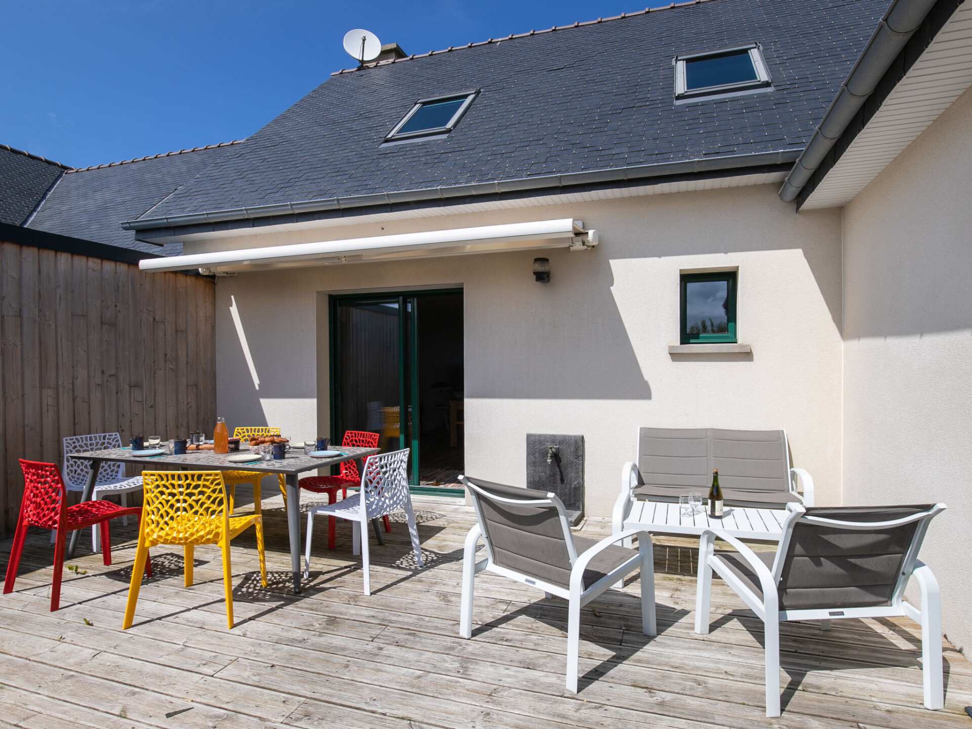 "Ty Mat", huis 5-kamers 80 m2. Volledig gerenoveerd in 2022, mooi en smaakvol ingericht: groot woon-/eetkamer met eettafel, TV en Flatscreen TV. Uitgang naar het terras, naar het zwembad. Open keuken (oven, afwasmachine, 4 inductiekookplaten, broodrooster, waterkoker, magnetron, elektrische koffiemachine, pads voor de koffiemachine (Philipps) extra). Aparte WC. Bovenverdieping: 1 kamer met 1 2-pers bed (160 cm, lengte 200 cm). 2 kamers, elke kamer heeft 2 bedden (90 cm, lengte 200 cm). Bad/douche, aparte WC, dubbele wastafels. Elektrische verwarming. Terras 15 m2, op het zuiden gelegen. Terrasmeubelen, barbecue (verrijdbaar), ligstoelen (2). Uitzicht op zee. Ter beschikking: wasmachine, droger, strijkijzer, kinderstoel, kinderbed tot 2 jaar, haardroger. Internet (WiFi, gratis). Rookvrij huis. Maximaal 1 huisdier/hond toegestaan. Rookmelders. Aanbod door een particulier volgens art. 155, IV van CGI.