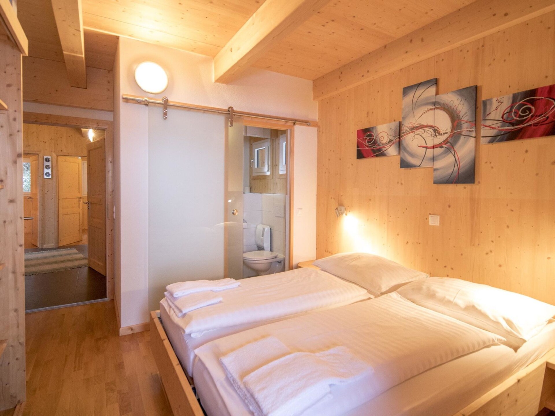 " 29 mit IR-Sauna und Sprudelbad Innen", chalet 7-kamers 130 m2. Ruim, luxueus en met veel hout ingericht: 3 2-pers. kamers, elke kamer heeft douche/WC. 2 kinderkamers, elke kamer heeft 2 x 2 stapelbedden. Souterrain: 1 2-pers. kamer. Bovenverdieping: groot woonkamer met eethoek en Sat-TV (Flatscreen TV), gaskachel. Open keuken (oven, afwasmachine, 4 keramische glas kookplaten, diepvriezer, elektrische koffiemachine). Douche/WC, hydro massage bad, Sauna. Balkon of terras. Balkonmeubilair. Mooi uitzicht op de bergen en het landschap. Ter beschikking: Internet (Internet (WiFi), gratis). Parkeerplaats (2 Auto's) bij het huis. Niet rokers woning. Rookmelders. De beschrijving betreft een voorbeeld van dit type woning in dit complex.
