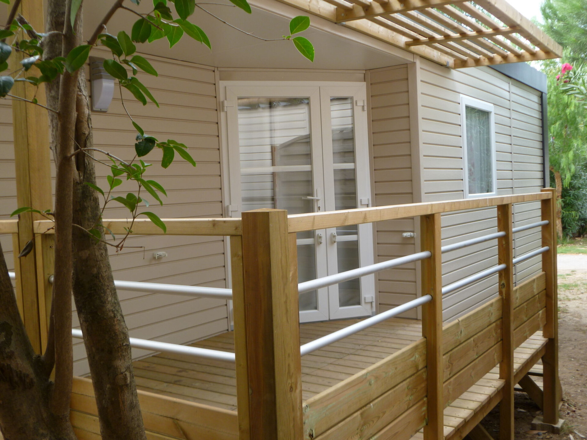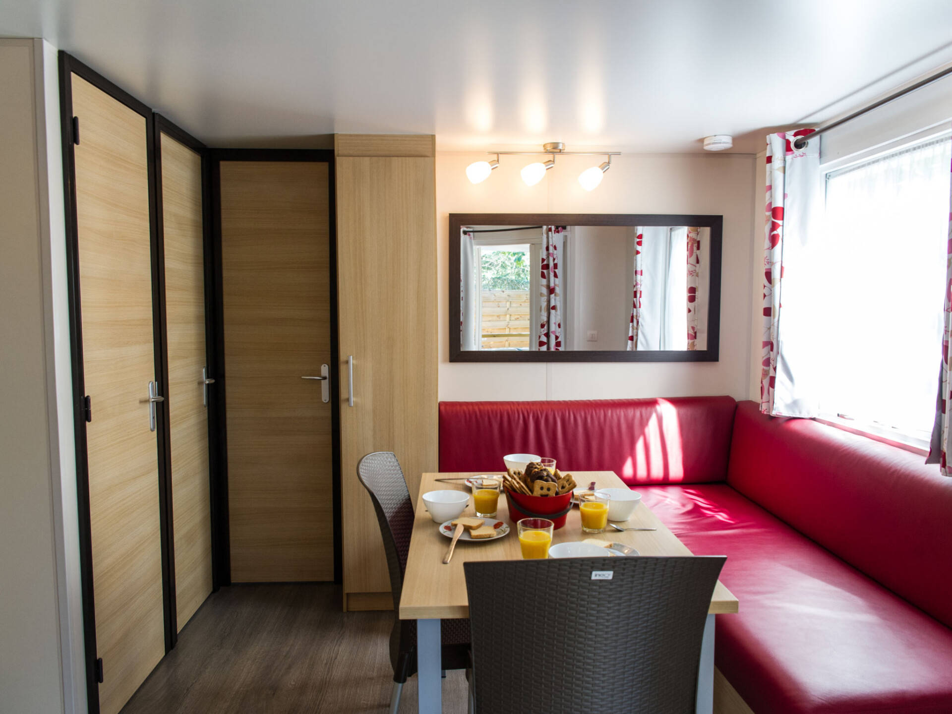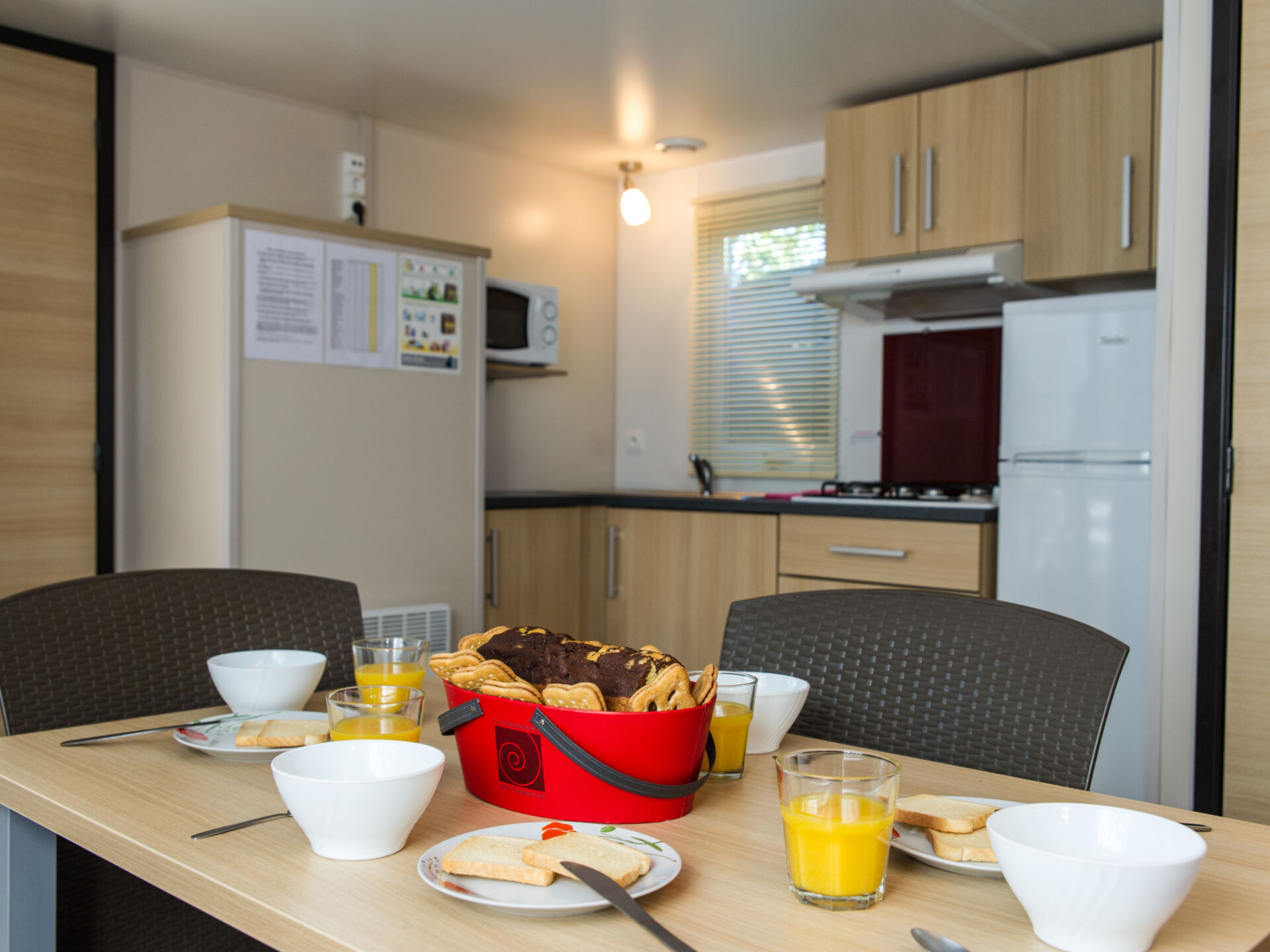 "Camping La Plage", 3-kamers mobilhome 31 m2. Doelmatig ingericht: woon-/eetkamer met TV (Flatscreen TV). Uitgang naar het terras. 1 kamer met 1 2-pers bed (140 cm, lengte 190 cm). 1 kamer met 2 bedden (70 cm, lengte 190 cm). Kookhoek (4 kookpitten (vlammen), magnetron, diepvriezer, elektrische koffiemachine). Douche, aparte WC. Elektrische verwarming, air-conditioning. Terras gedeeltelijk overdekt. Terrasmeubelen. Ter beschikking: kinderstoel, kinderbed tot 2 jaar (extra). Internet (WiFi, extra). Maximaal 1 huisdier/hond toegestaan. Rookmelders.
