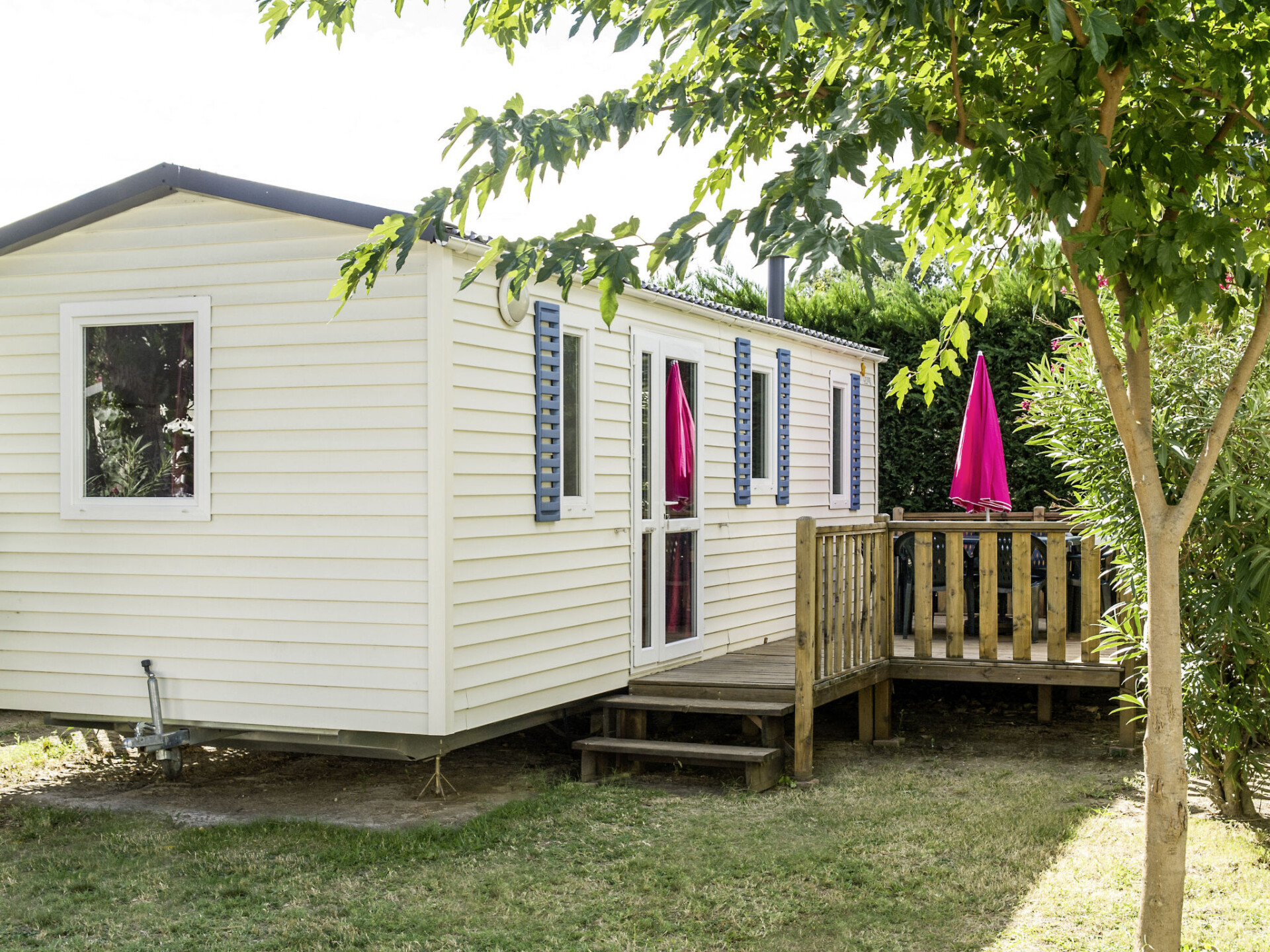 "Camping La Plage", 3-kamers mobilhome 21 m2. Doelmatig ingericht: woon-/eetkamer met eettafel, TV en Flatscreen TV. Uitgang naar het terras. 1 kamer met 1 2-pers bed (140 cm, lengte 190 cm). 1 kamer met 2 bedden (70 cm, lengte 190 cm). Kookhoek (2 kookpitten (vlammen), magnetron, diepvriezer, elektrische koffiemachine). Douche, aparte WC. Elektrische verwarming. Terras gedeeltelijk overdekt. Terrasmeubelen. Ter beschikking: kinderstoel, kinderbed tot 2 jaar (extra). Internet (WiFi, extra). Maximaal 1 huisdier/hond toegestaan. Rookmelders.