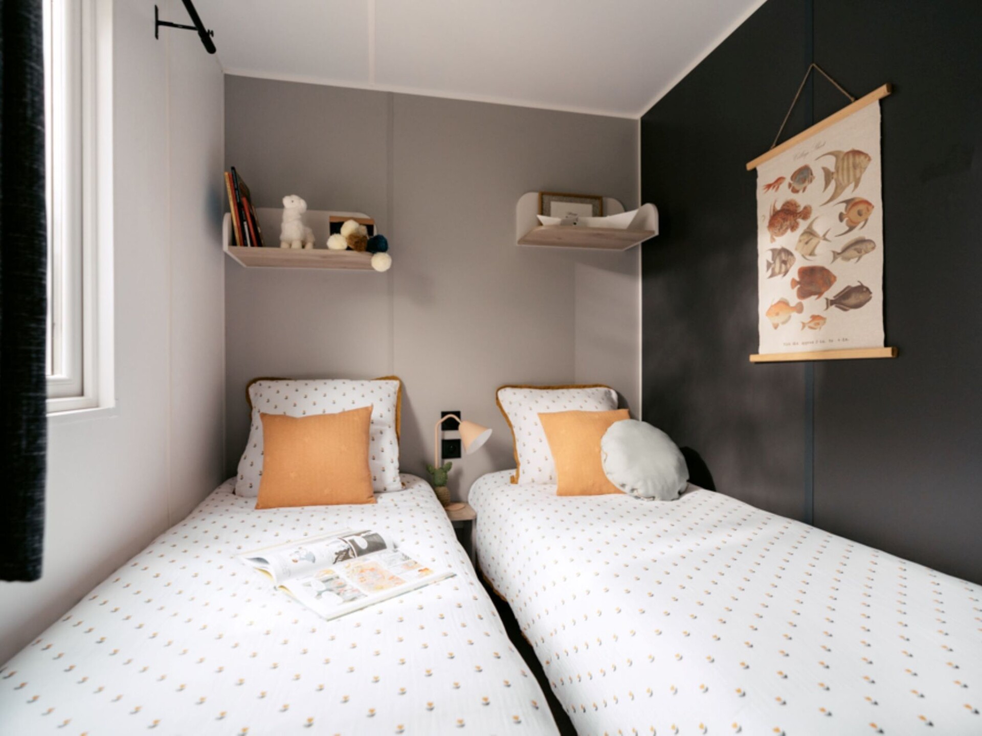 "Camping La Plage", 3-kamers mobilhome 23 m2. Doelmatig ingericht: woon-/eetkamer met TV (Flatscreen TV). Uitgang naar het terras. 1 kamer met 1 2-pers bed (140 cm, lengte 190 cm). 1 kamer met 2 bedden (70 cm, lengte 190 cm). Kookhoek (4 kookpitten (vlammen), magnetron, diepvriezer, elektrische koffiemachine). Douche, aparte WC. Air-conditioning, heteluchtverwarming. Terras gedeeltelijk overdekt. Terrasmeubelen. Ter beschikking: kinderstoel, kinderbed tot 2 jaar (extra). Internet (WiFi, extra). Maximaal 1 huisdier/hond toegestaan. Rookmelders.