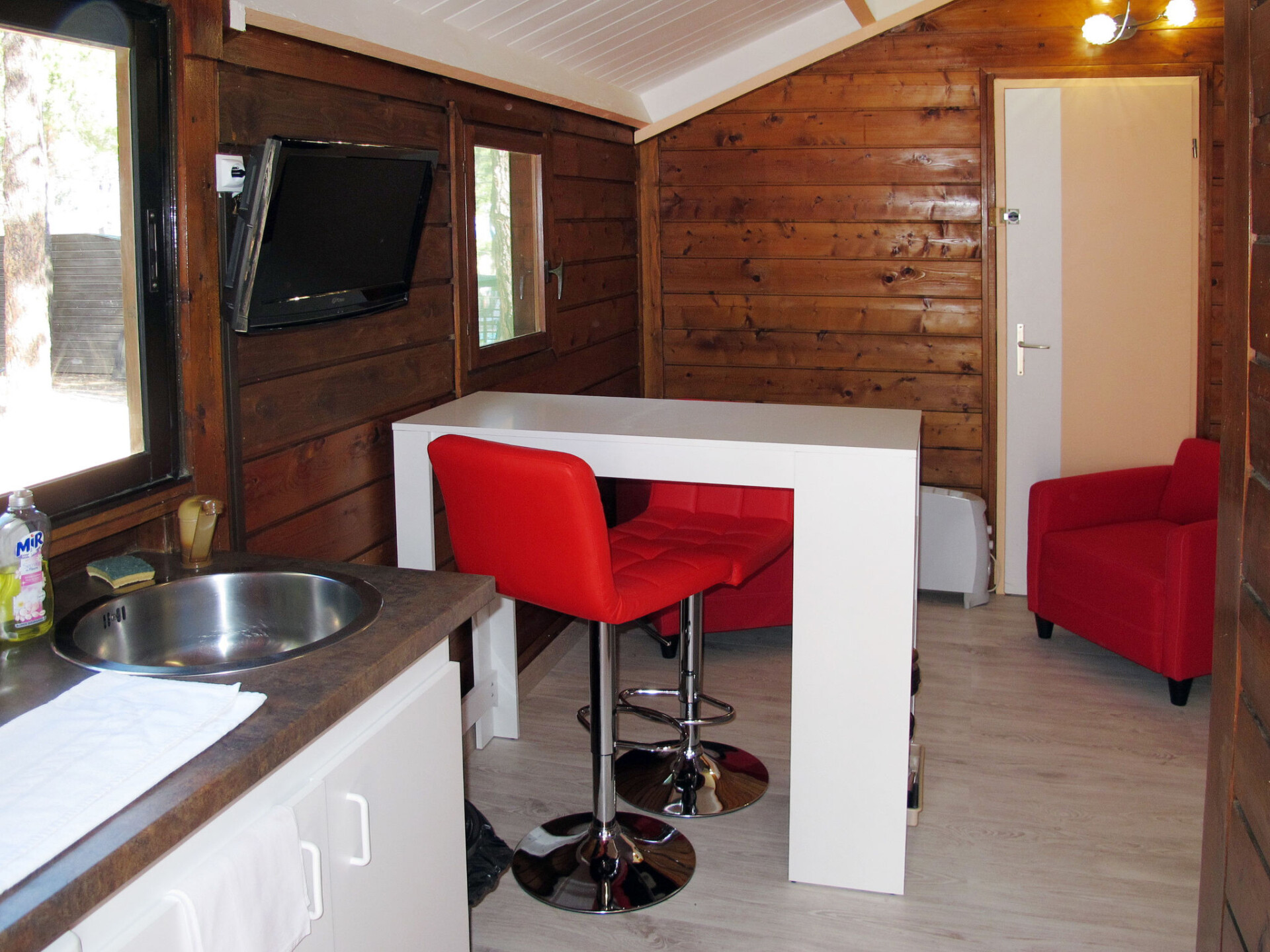 "Chalet 2 pers", bungalow 2-kamers 25 m2. Doelmatig ingericht: woon-/eetkamer met eettafel, TV en elektrische kachel. 1 kleine kamer met 1 2-pers bed (140 cm, lengte 190 cm), ventilator. Kleine kookhoek (2-pits kookplaat, broodrooster, waterkoker, magnetron, elektrische koffiemachine). Douche/WC. Zithoek in de tuin. Terrasmeubelen. Niet rokers woning. Maximaal 2 huisdieren/honden toegestaan. Rookmelders. Aanbod door een commerciële eigenaar volgens art. 155, IV, CGI FR9260.609.2