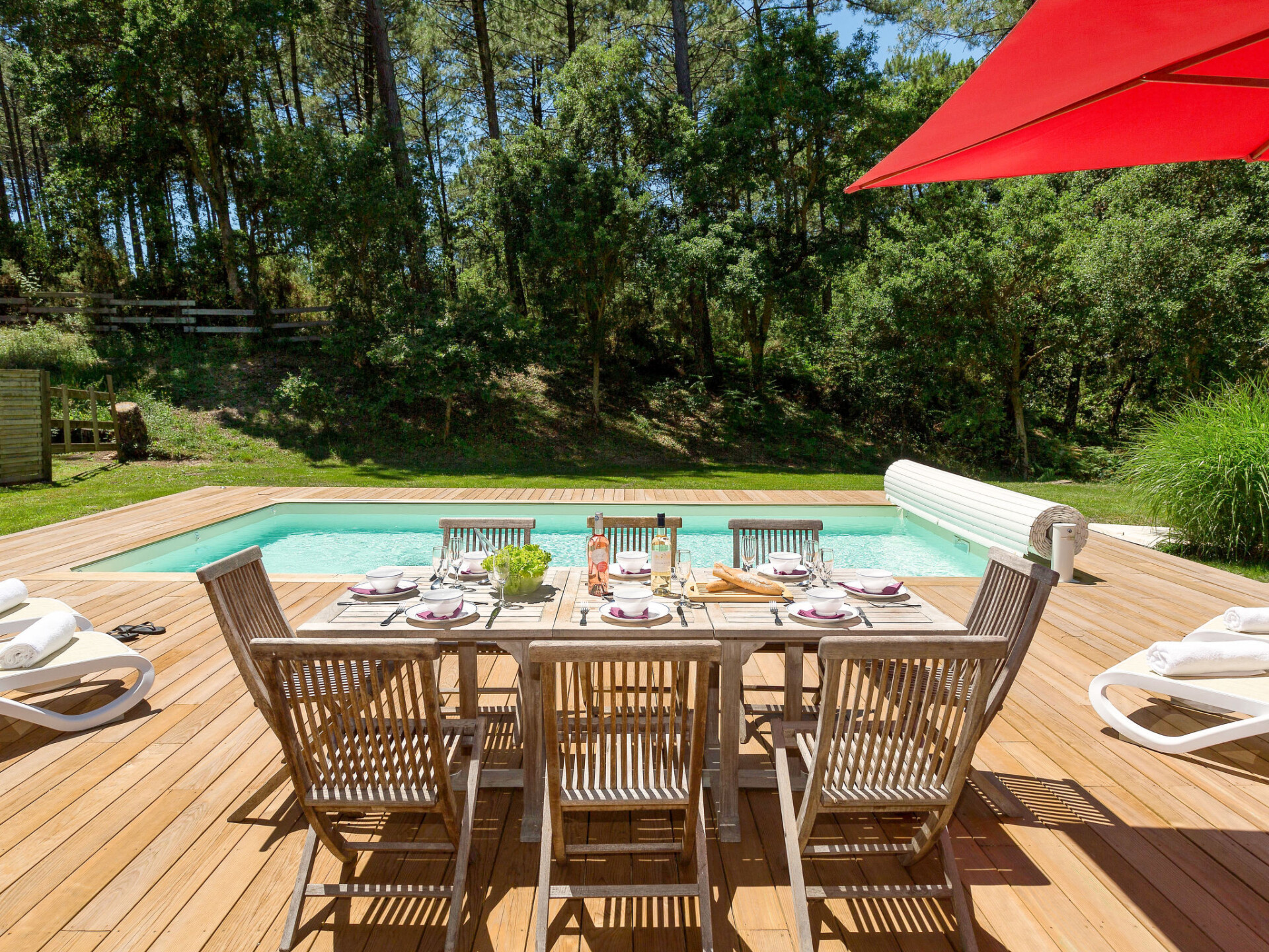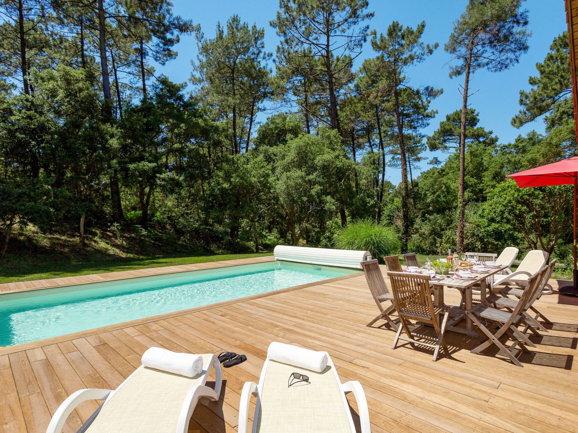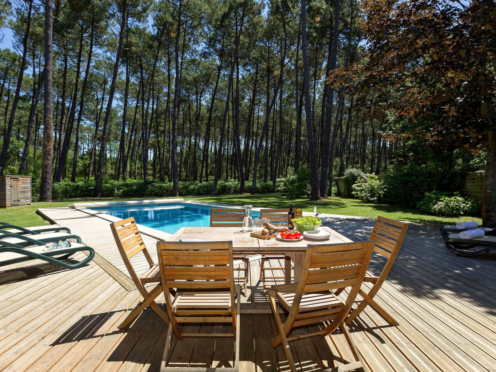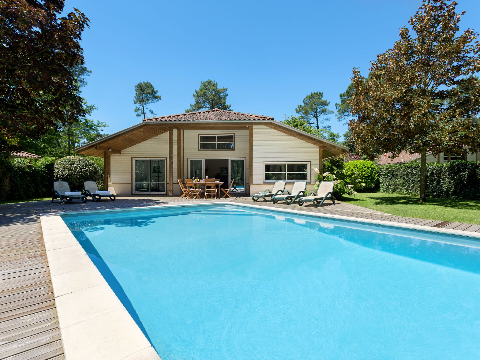 Mooi, comfortabel vakantiecomplex "Clairière aux Chevreuils". 29 huizen in de plaats. 2 km van het centrum van Moliets-Bourg, 8 km van het centrum van Vieux Boucau, 35 km van het centrum van Dax, 1.8 km van zee. Voor alleengebruik: terrein 600 m2 met gazon en bomen, openluchtzwembad (seizoensgebonden beschikbaarheid: 23.Mei. - 03.Okt.). In het complex: receptie, Internet (WiFi). Broodjesservice. Parkeerplaats op het terrein. Winkel 2 km, supermarkt 6 km, treinstation "Dax" 35 km, zandstrand 2.5 km. Jachthaven 30 km, golfterrein (18 holes) 1.5 km. De afgebeelde foto is slechts een voorbeeld. De huurobjecten kunnen wb. Woonoppervlak, kamerindeling verschillen.