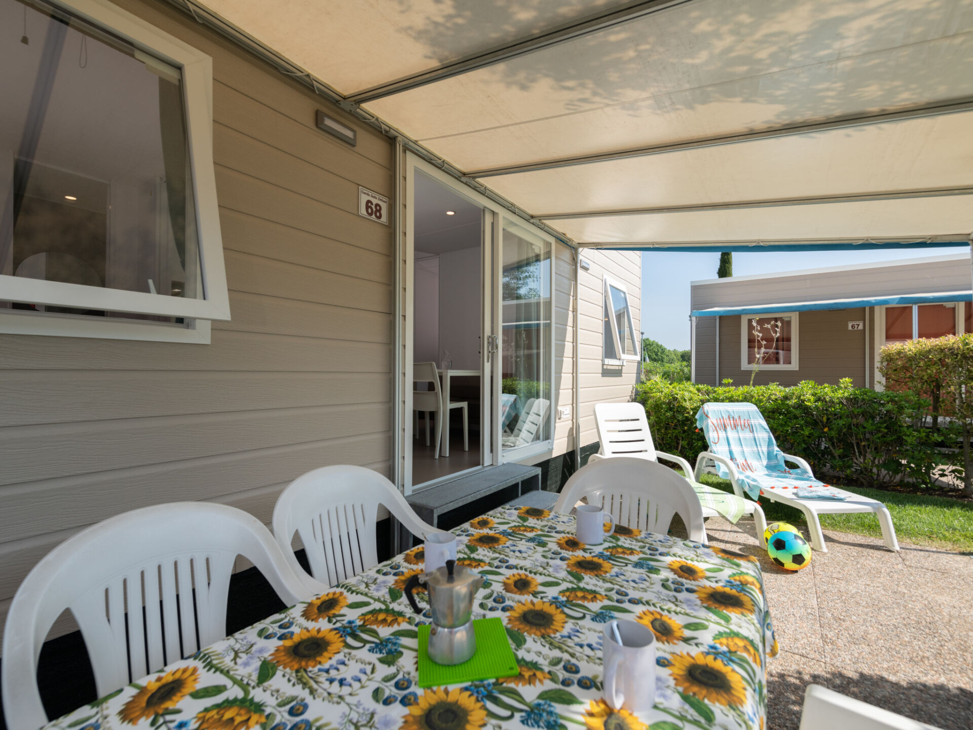 "Garda Suite Deluxe", 3-kamers mobilhome 32 m2. Het objekt is geschikt voor 4 volwassenen + 1 kinderen. Mooi en modern ingericht: woon-/slaapkamer met 1 slaapplaats (77 cm, lengte 190 cm), eettafel, TV, air-conditioning en heteluchtverwarming. 1 kamer met 1 2-pers bed (140 cm, lengte 190 cm), douche/WC. 1 kamer met 2 bedden (80 cm, lengte 190 cm). Open keuken (4 kookpitten (vlammen), magnetron). Douche/WC. Zithoek in de tuin. Terrasmeubelen, barbecue, ligstoelen (2). Ter beschikking: kluis, klamboe, haardroger. Parkeerplaats (1 Auto). Maximaal 1 huisdier/hond toegestaan. IT017067B1HII4DV9G