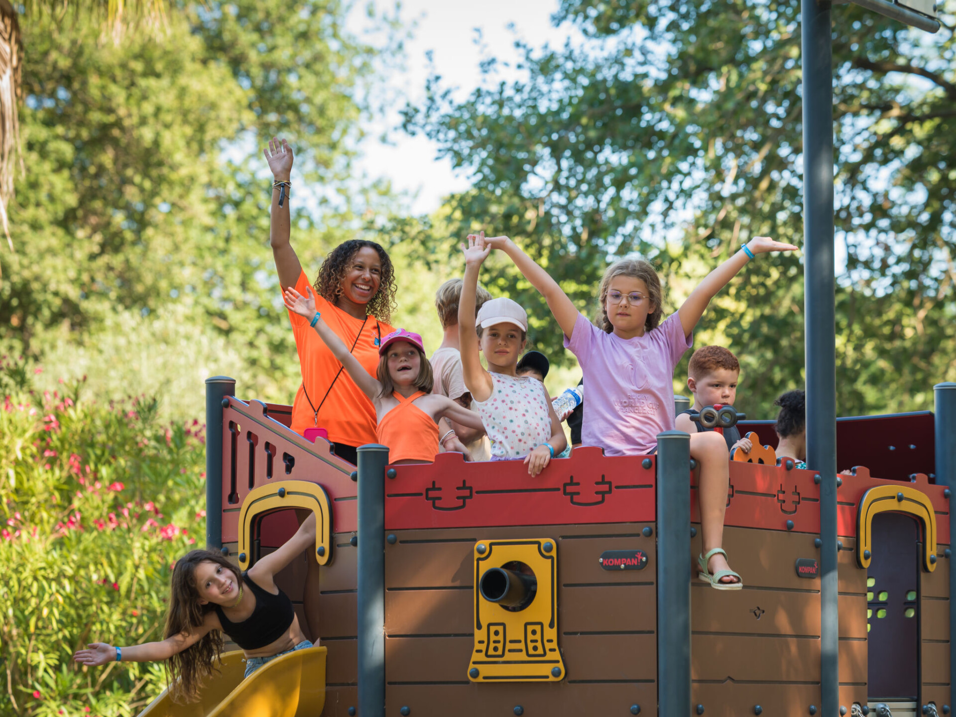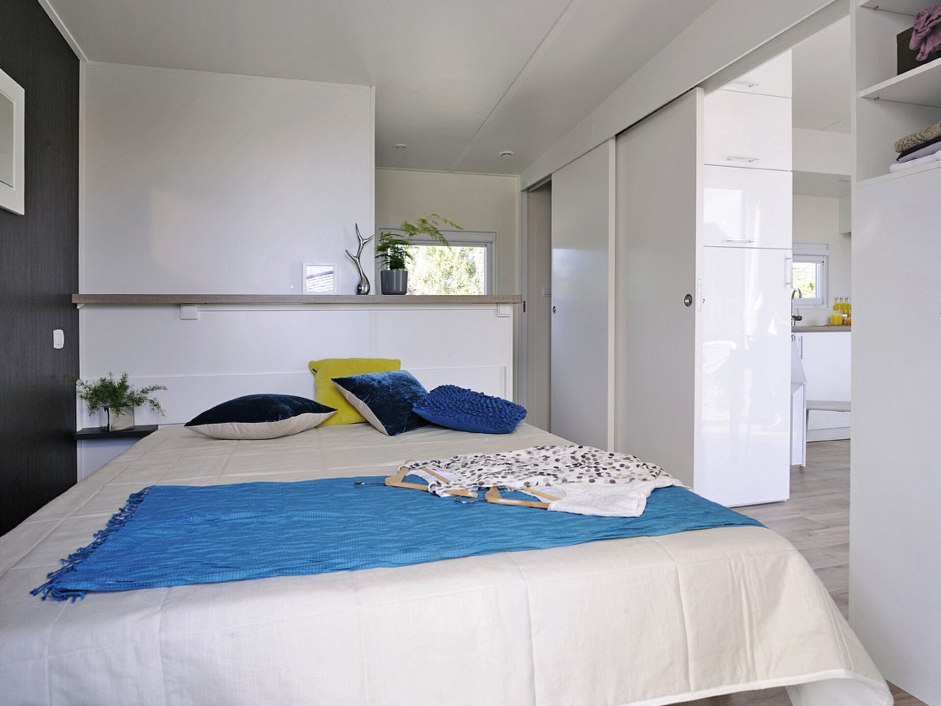 "Le Mediterranée", 3-kamers mobilhome 35 m2. Comfortabel ingericht: woon-/eetkamer met eettafel en Sat-TV (Flatscreen TV). Uitgang naar het terras. 1 kamer met 1 2-pers bed (160 cm, lengte 200 cm), aparte WC en douche. 1 kamer met 2 bedden (80 cm, lengte 190 cm), douche/WC. Open keuken (afwasmachine, 4 kookpitten (vlammen), broodrooster, waterkoker, magnetron, diepvriezer, elektrische koffiemachine). Elektrische verwarming, air-conditioning, heteluchtverwarming. Terras. Terrasmeubelen, barbecue (verrijdbaar), ligstoelen (2). Ter beschikking: kinderstoel, kinderbed tot 2 jaar (extra). Internet (WiFi, gratis). Maximaal 1 huisdier/hond toegestaan. Rookmelders.