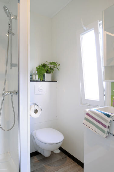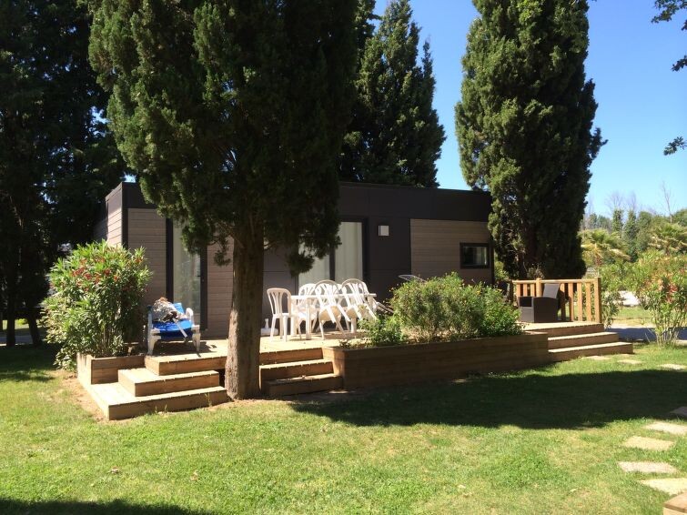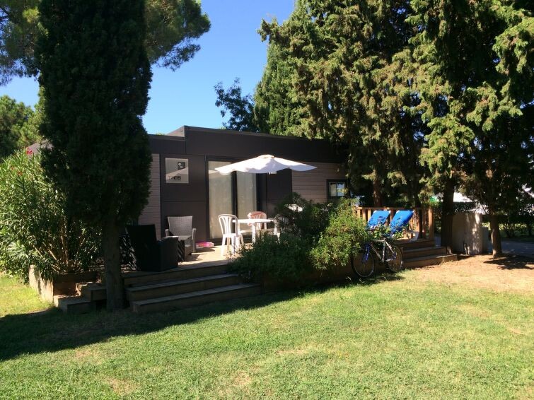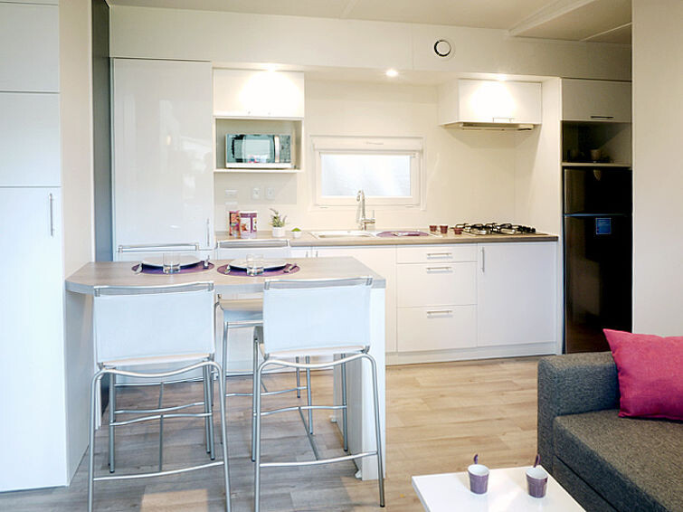 "Le Mediterranée", 3-kamers mobilhome 35 m2. Doelmatig ingericht: woon-/eetkamer met eettafel, Sat-TV en internationale TV-zenders. Uitgang naar het terras. 1 kamer met 1 2-pers bed (160 cm), aparte WC en douche. 1 kamer met 2 bedden (80 cm), douche/WC. Open keuken (afwasmachine, 4 kookpitten (vlammen), broodrooster, waterkoker, magnetron, diepvriezer, elektrische koffiemachine). Elektrische verwarming, air-conditioning. Terras. Terrasmeubelen, barbecue, ligstoelen (2). Ter beschikking: kinderstoel, kinderbed tot 2 jaar (extra). Internet (WiFi, gratis). Maximaal 1 huisdier/hond toegestaan.