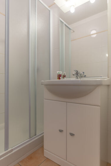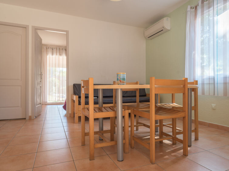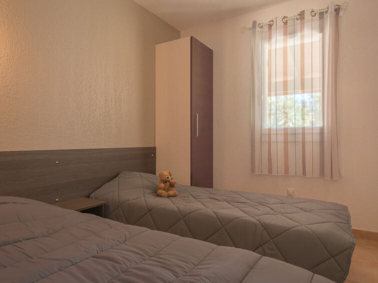 "Le Mediterranée", huis in een rij 3-kamers 39 m2. Gerenoveerd in 2009, doelmatig ingericht: woon-/slaapkamer met 1 2-pers divanbed, eettafel, Sat-TV, internationale TV-zenders en air-conditioning. 1 kamer met 1 2-pers bed (160 cm). 1 kamer met 2 bedden (80 cm). Kookhoek (2-pits kookplaat, afwasmachine, broodrooster, waterkoker, magnetron, diepvriezer, elektrische koffiemachine). Douche, aparte WC. Elektrische verwarming. Terras. Terrasmeubelen, ligstoelen. Ter beschikking: kinderstoel, kinderbed tot 2 jaar (extra). Internet (WiFi, extra). Maximaal 1 huisdier/hond toegestaan.