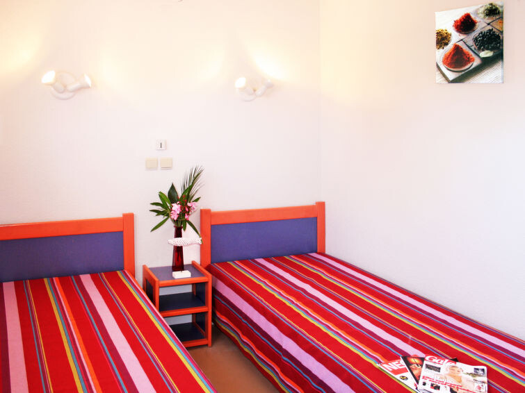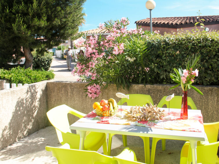 "Les Jardins de Neptune", huis in een rij 3-kamers 39 m2 op 2 verdiepingen. Mooi ingericht: woon-/slaapkamer met 1 2-pers divanbed, eettafel en TV. 1 kamer met 1 2-pers bed. Kookhoek (3-pits kookplaat, afwasmachine, magnetron). Badkamer, aparte WC. Elektrische verwarming. Bovenverdieping: 1 kamer met 2 bedden. Terras. Terrasmeubelen. Ter beschikking: kluis, kinderstoel, kinderbed (extra). Internet (Internet (WiFi), extra). Niet rokers woning. Maximaal 2 huisdieren/honden toegestaan. Rookmelders, brandblusser.