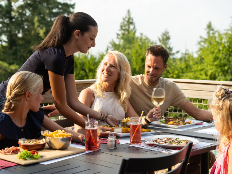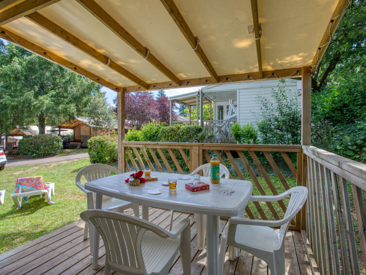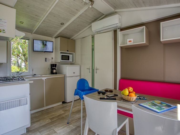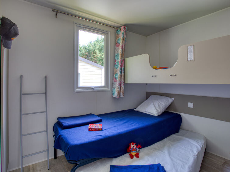 "Prestige 2 chambres 5 personnes", bungalow 3-kamers 32 m2. Doelmatig ingericht: woon-/eetkamer met 1 2-pers divanbed (1 x 140 cm, lengte 190 cm), TV (Flatscreen TV), air-conditioning. Uitgang naar het terras. 1 kamer met 1 2-pers bed (1 x 140 cm, lengte 190 cm). 1 kamer met 1 x 2 stapelbedden (80 cm, lengte 190 cm). Kookhoek (4 kookpitten (vlammen), broodrooster, magnetron, diepvriezer, elektrische koffiemachine). Douche, aparte WC. Elektrische verwarming, air-conditioning. Terras 6 m2 gedeeltelijk overdekt. Terrasmeubelen. Ter beschikking: kinderstoel, kinderbed tot 2 jaar (extra). Internet (WiFi, extra). Parkeerplaats (1 Auto). Niet rokers woning. Maximaal 1 huisdier/hond toegestaan. Rookmelders. Aanbod door een commerciële eigenaar volgens art. 155, IV, CGI