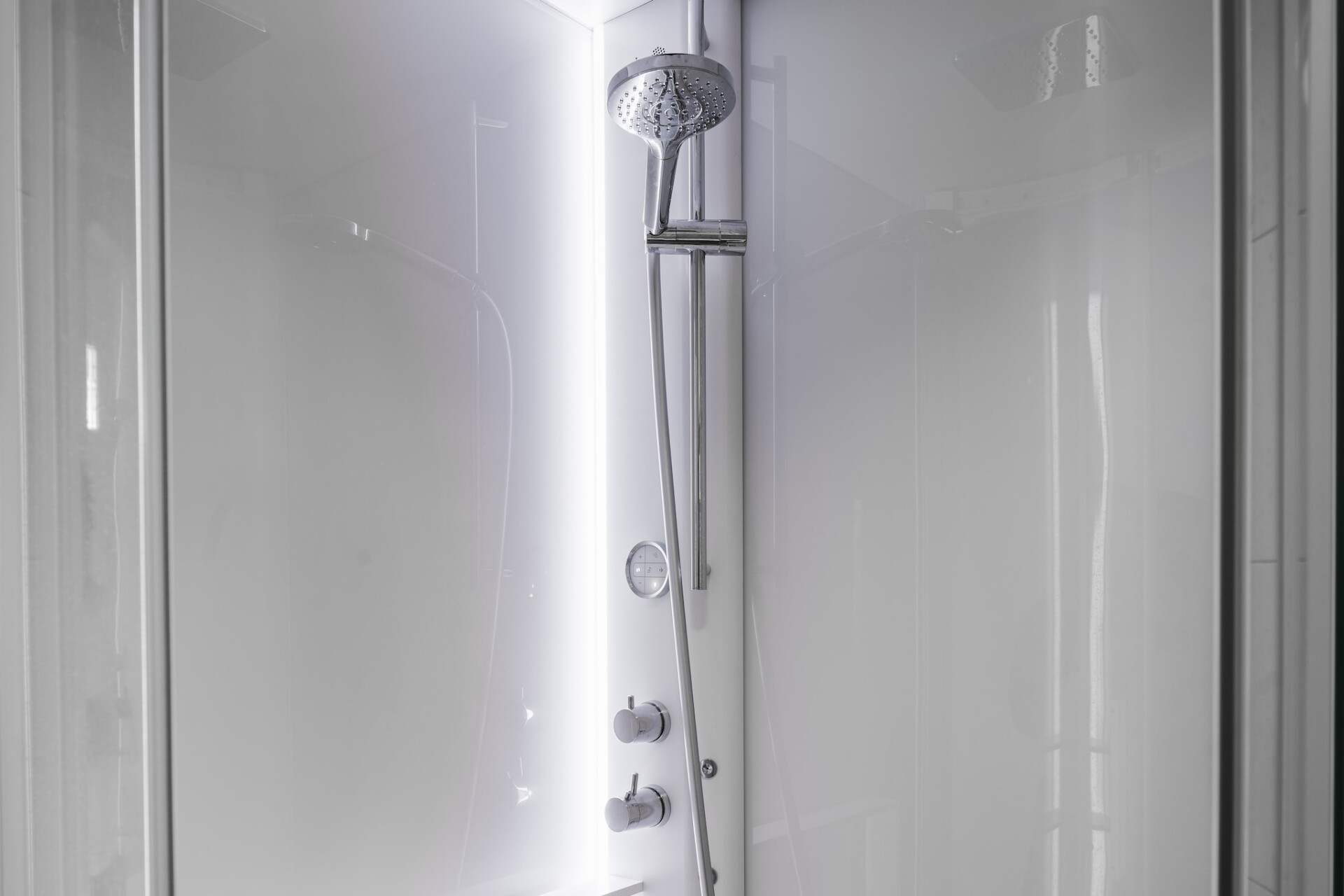 Binnen heeft u alles wat u van een moderne villa mag verwachten: een mooie woonkamer met tv en serre, een open keuken met onder andere een vaatwasser en een magnetron en twee slaapkamers, waarvan één met een eigen badkamer met inloopdouche. Er is ook een tweede badkamer met inloopdouche en toilet. Boven vindt u nog twee slaapkamers. Alle bedden zijn eenpersoons boxspringbedden, die tegen elkaar kunnen worden geschoven om een tweepersoonsbed te vormen of apart kunnen worden gebruikt in een tweepersoonskamer. De derde badkamer, op de eerste verdieping, heeft een inloopdouche. Er is ook een apart toilet in de hal en op de overloop. Als kers op de taart heeft deze villa een stoomdouche en een traditionele sauna. De slaapkamers, badkamer en toilet liggen drie treden lager dan de rest van de begane grond.