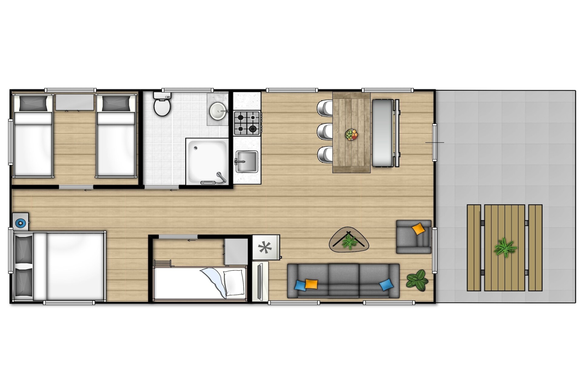In de safaritent kunt u genieten van luxe kamperen, ook wel glamping genoemd; de sfeer van een tent, maar dan met net iets meer comfort. In de woonkamer vindt u een tv en een elektrische kachel. De open keuken is voorzien van een koelkast met vriesvak. Er zijn drie slaapkamers, één met een tweepersoonsbed, één met twee eenpersoonsbedden en één met een stapelbed. In de badkamer vindt u een douche en een toilet.