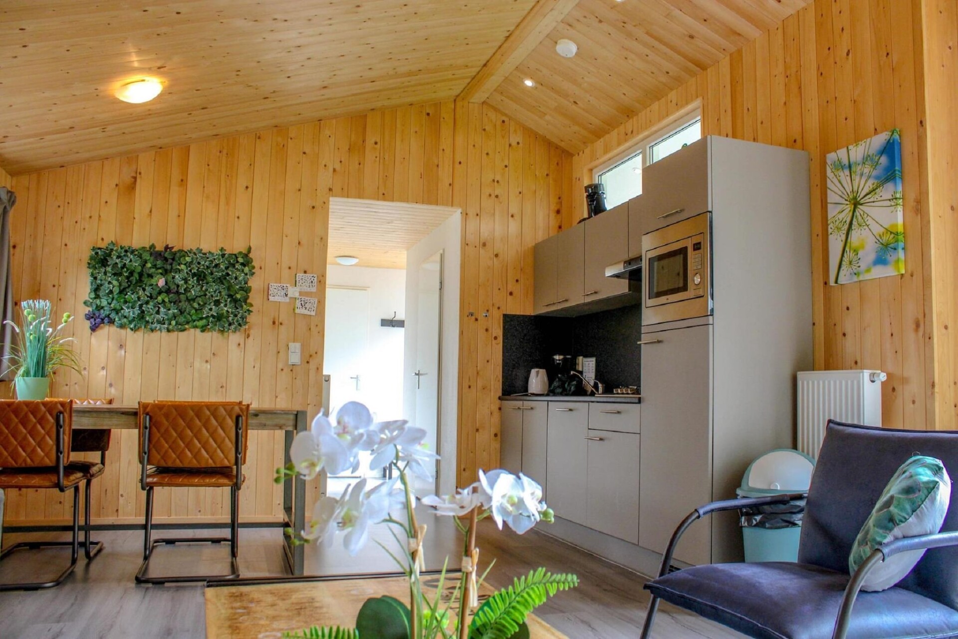 De open woon- en eetkamer beschikt over een volledig uitgeruste keuken, een comfortabele zithoek en een tv voor ontspannen avonden. Twee goed ingerichte slaapkamers zorgen voor een rustgevende slaap - kies tussen boxspringbedden of een comfortabele stapelbedopstelling, afhankelijk van de beschikbaarheid. Stap door de tuindeuren en u vindt een ruim terras met hoogwaardig tuinmeubilair, ideaal om onder de bomen te dineren of in alle privacy van de zon te genieten.