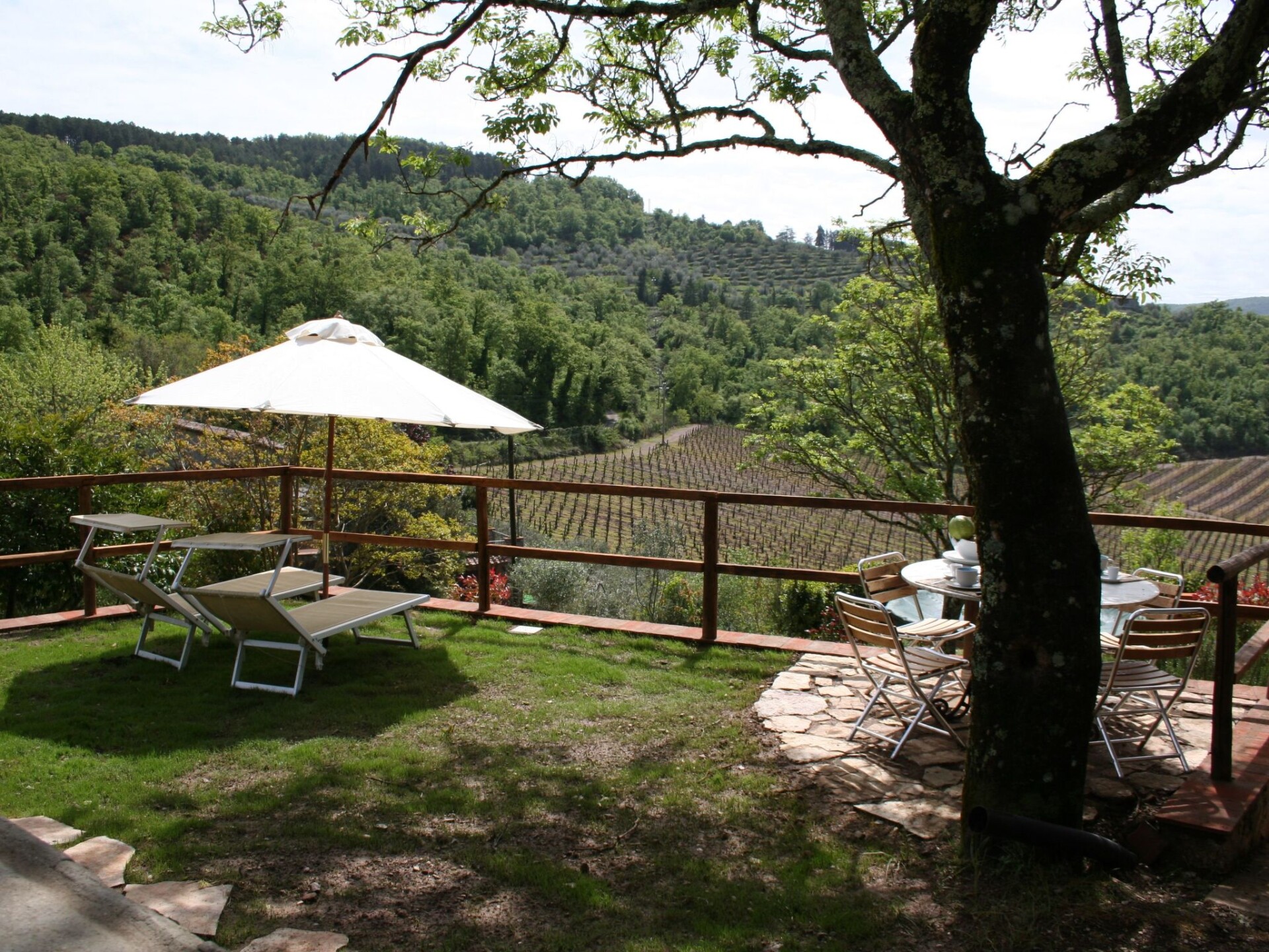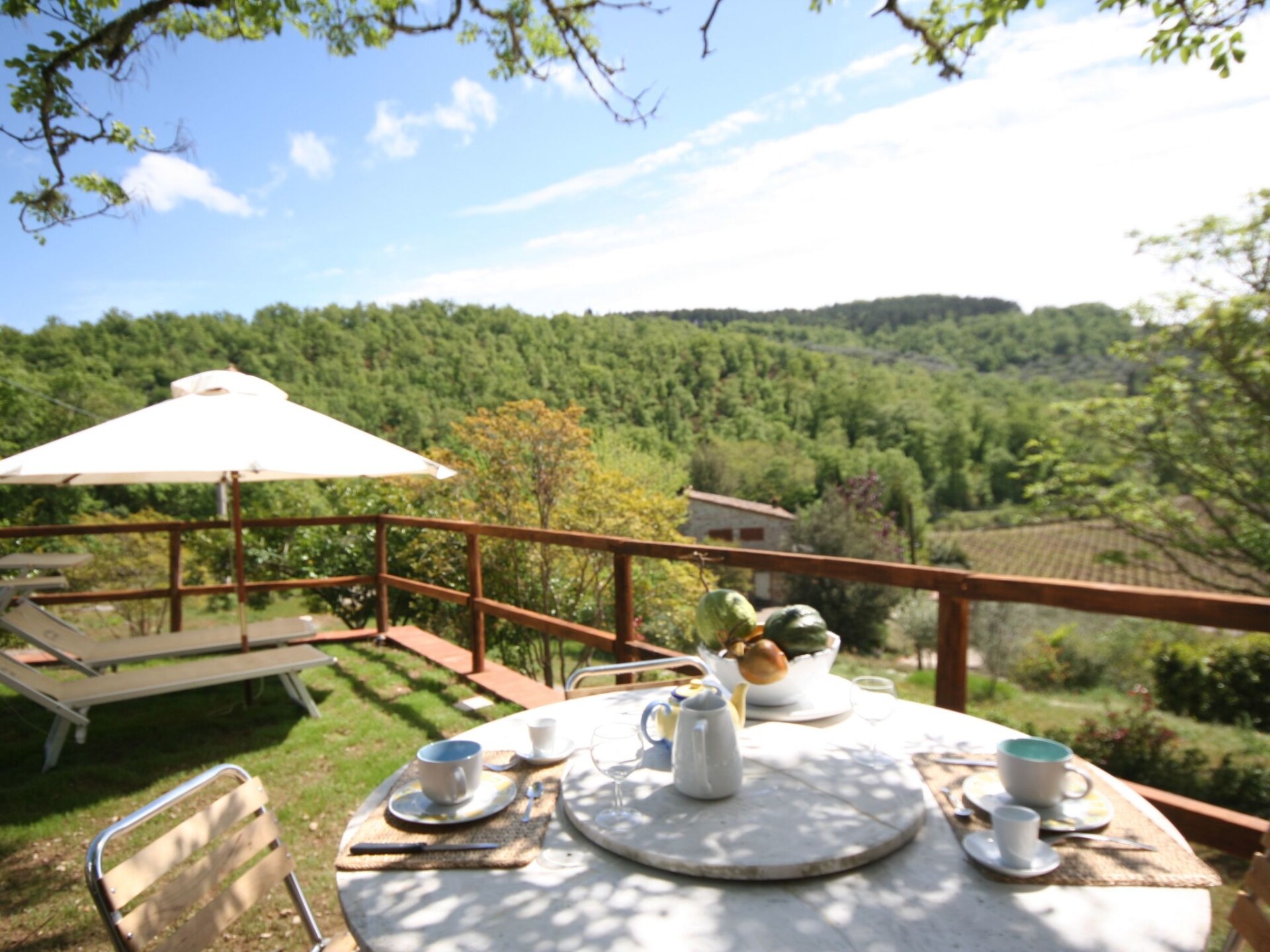 The impressive design continues outside. The sloping property allows direct access from both the ground floor and the first floor. A terrace, offering picturesque views of the Chianti hills and furnished with a table and two sun loungers, invites you to relax. A highlight is the outdoor hot tub, an attractive alternative to traditional small pools. Guests also have exclusive use of a private 5-meter diameter pool.