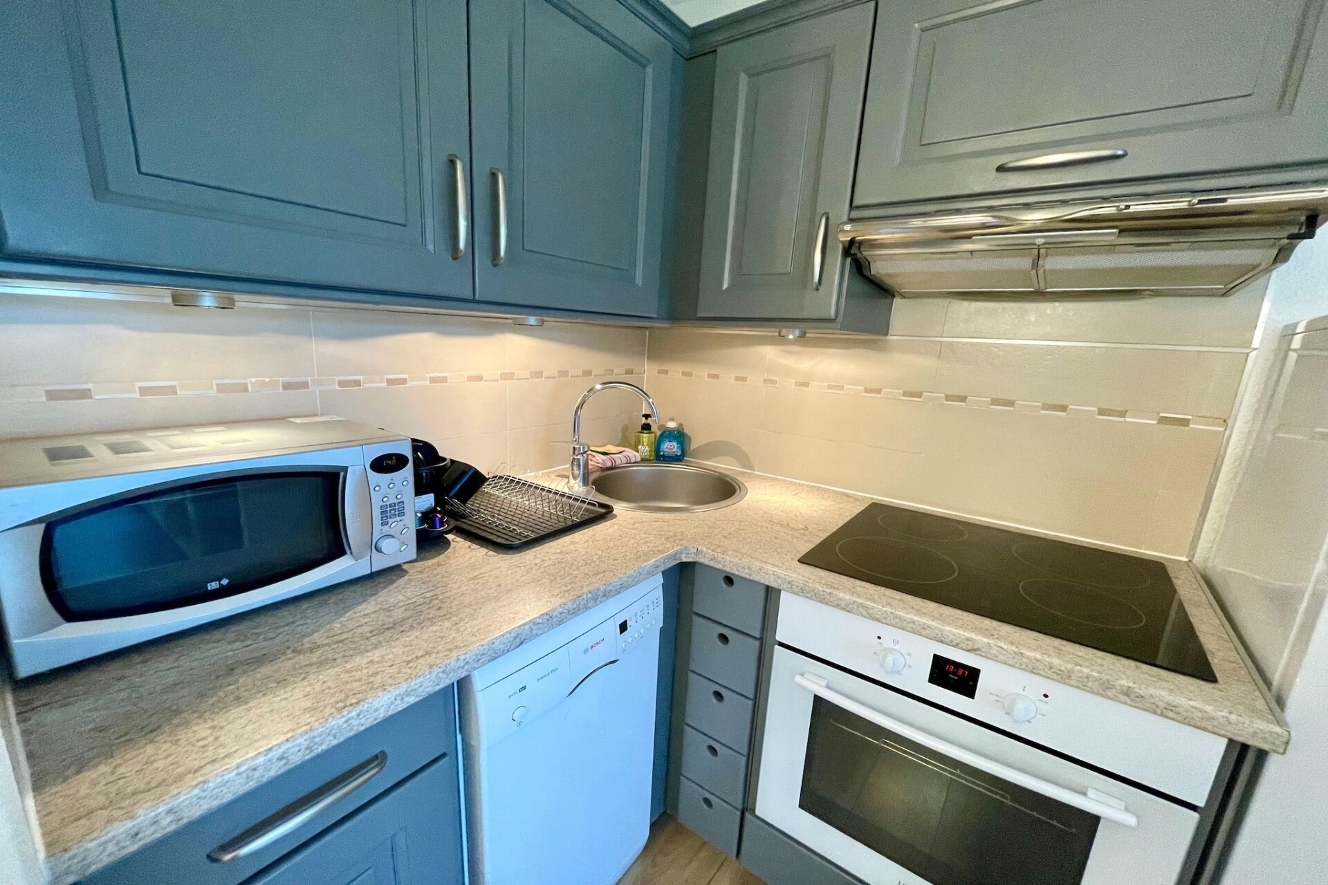 Het appartement beschikt over een aparte slaapkamer met een tweepersoonsbed en een gezellige woonkamer. De volledig uitgeruste open keuken zorgt ervoor dat u zich direct thuis voelt, of u nu ontbijt klaarmaakt voordat u naar het strand gaat of geniet van een diner na een zonnige dag. Een moderne badkamer met douche en wasmachine, evenals een apart toilet, zorgen voor extra comfort, ook voor gedeelde verblijven. Airconditioning, beddengoed en handdoeken, en doordachte toiletartikelen maken uw verblijf aangenaam.