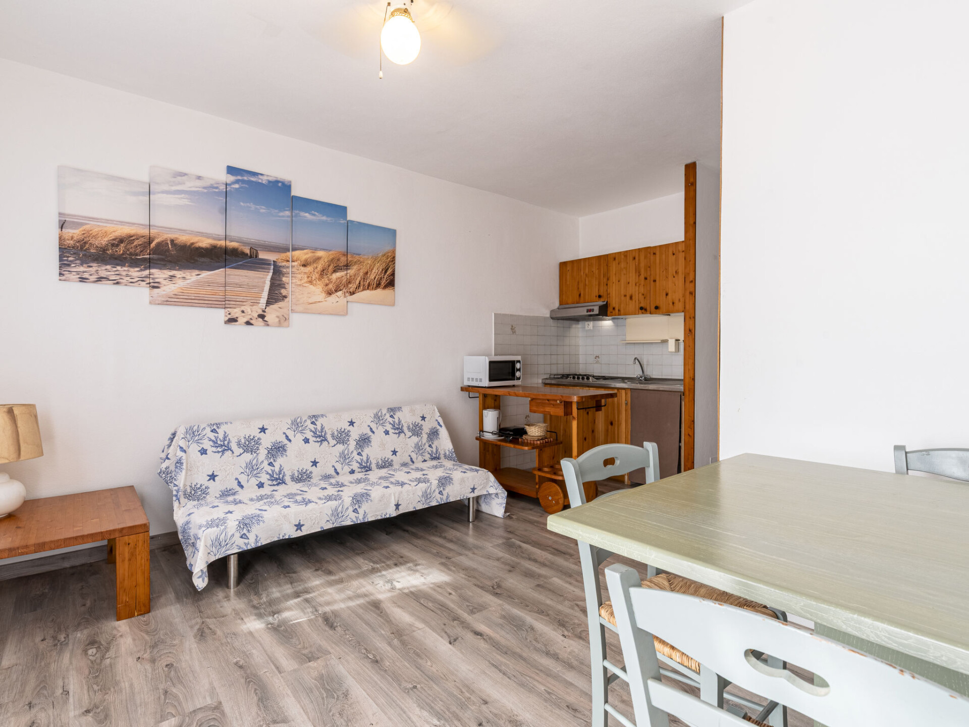 "Villa 12", huis in een rij 3-kamers 60 m2. Doelmatig en mooi ingericht: woon-/eetkamer met 1 divanbed (90 cm, lengte 190 cm), eettafel. Uitgang naar het terras. 1 kamer met 1 2-pers bed (160 cm, lengte 190 cm). 1 kamer met 1 x 2 stapelbedden (90 cm, lengte 190 cm). Open keuken (4 kookpitten (vlammen), broodrooster, waterkoker, magnetron). Douche/bidet/WC. Elektrische verwarming, air-conditioning. Terras gedeeltelijk overdekt, gazon. Terrasmeubelen. Mooi uitzicht op zee. Ter beschikking: wasmachine. Parkeerplaats (omheind). Maximaal 1 klein huisdier/hond toegestaan. Rookmelders. 2A04100074513