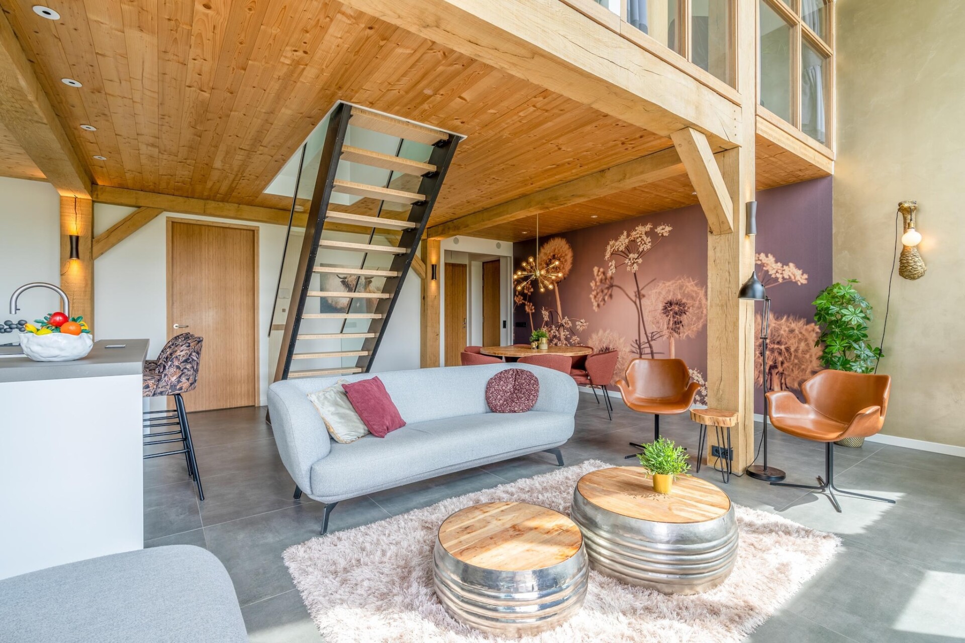 De royale living beschikt over een zithoek met open haard, smart TV en muzieksysteem. Er is een eethoek met een grote eettafel voor 6 personen. De open keuken is compleet ingericht met diverse inbouwapparatuur, zoals een combimagnetron, stoomoven, vaatwasser, Quooker en koffiezetapparaat.