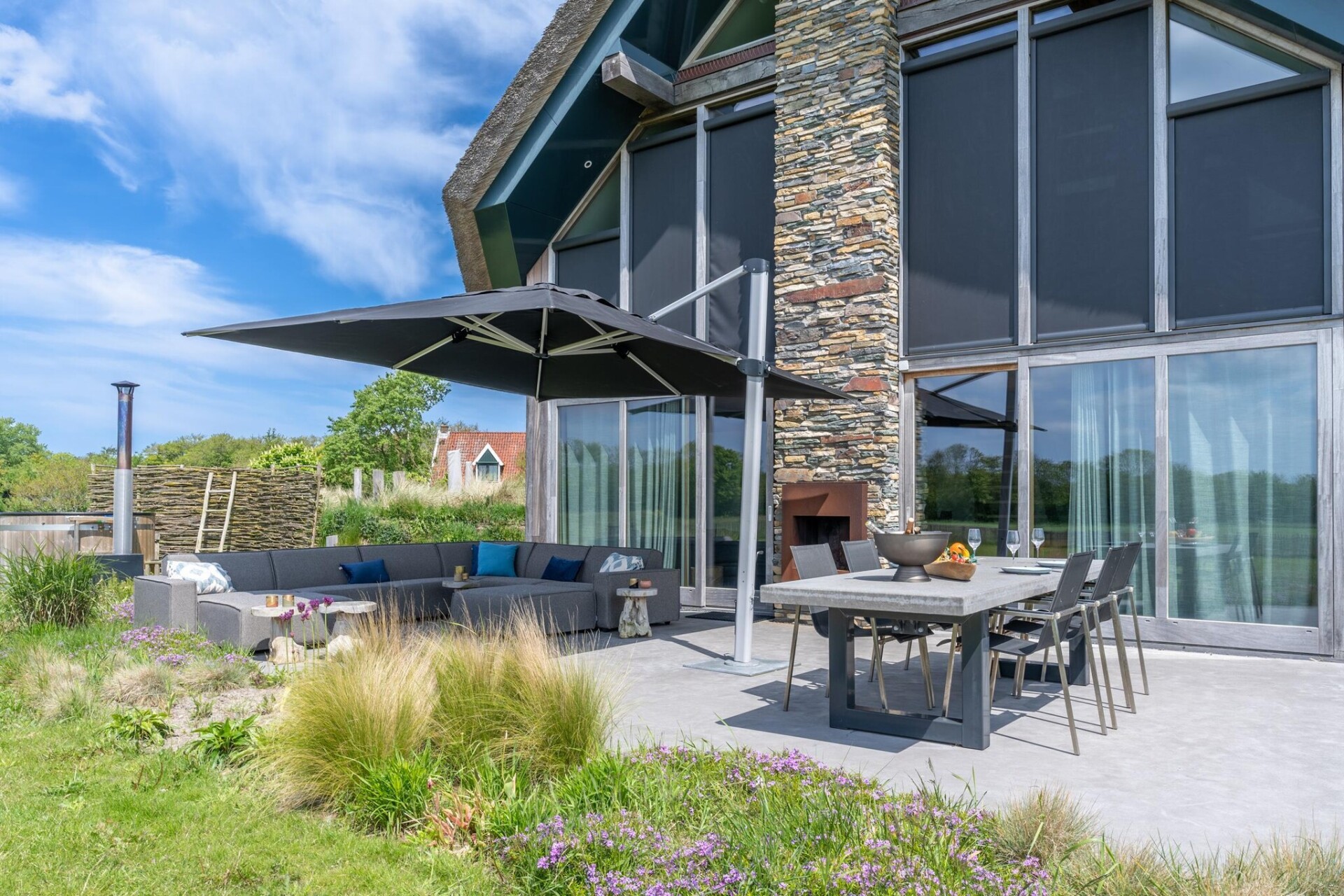 De woonruimte staat in directe verbinding met het terras door de schuifdeuren. Het terras is voorzien van tuinmeubilair en gelegen op het zuiden. Trampoline voor de kinderen. Er is een complete buitenkeuken met The Bastard BBQ. De houtgestookte hottub kan het hele jaar door gebruikt worden. Geniet van de heerlijke geur, het geluid van de natuur, het vlammende houtvuur en de sterren aan de hemel. De tuin is omheind, deels met een hek en deels met een natuurlijke "Texelse tuunwal".