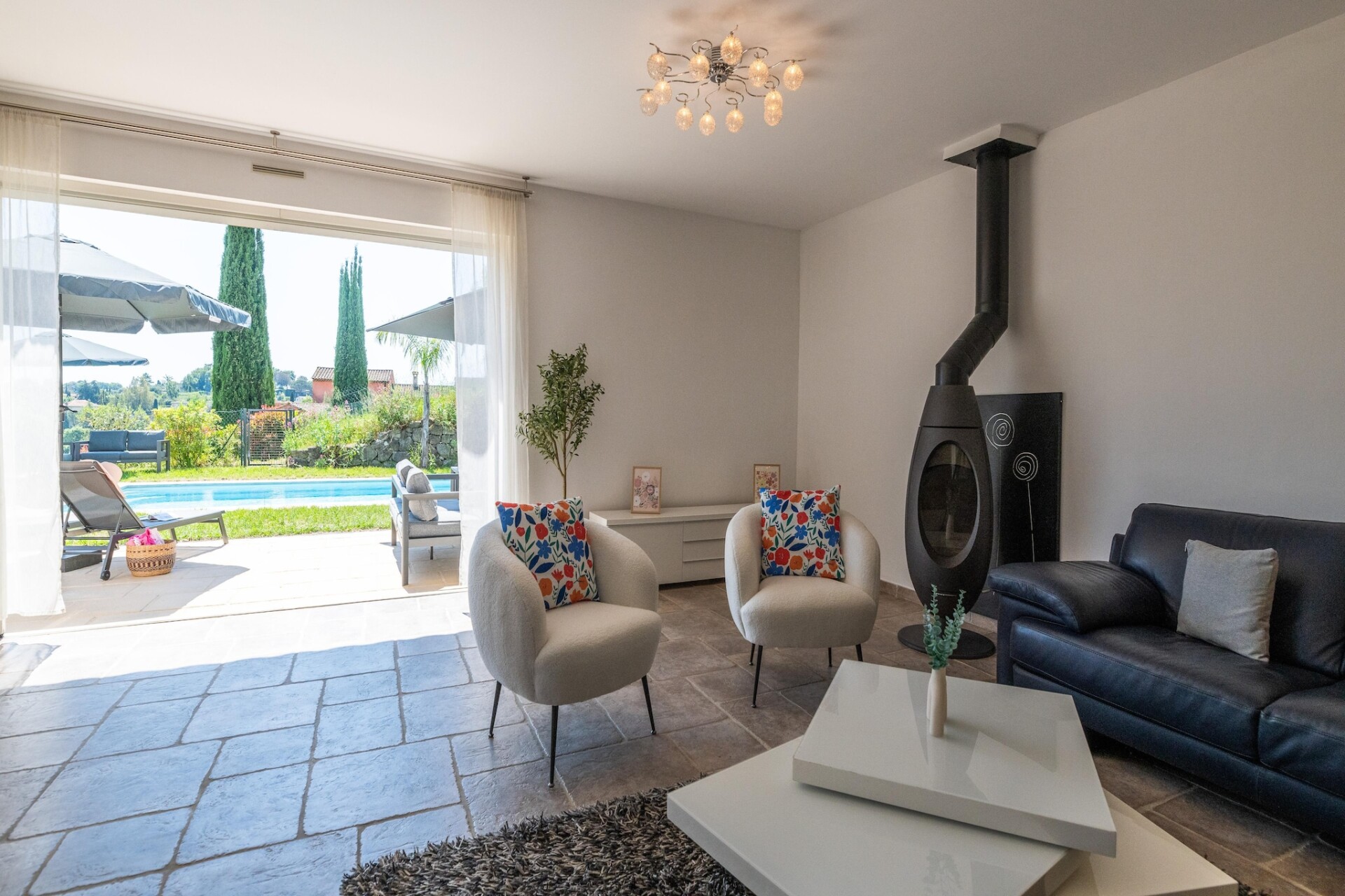 Villa Calade, gelegen in een rustige woonwijk tussen Antibes en Cannes, biedt een onbelemmerd uitzicht op de zee en het dorp Biot.